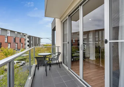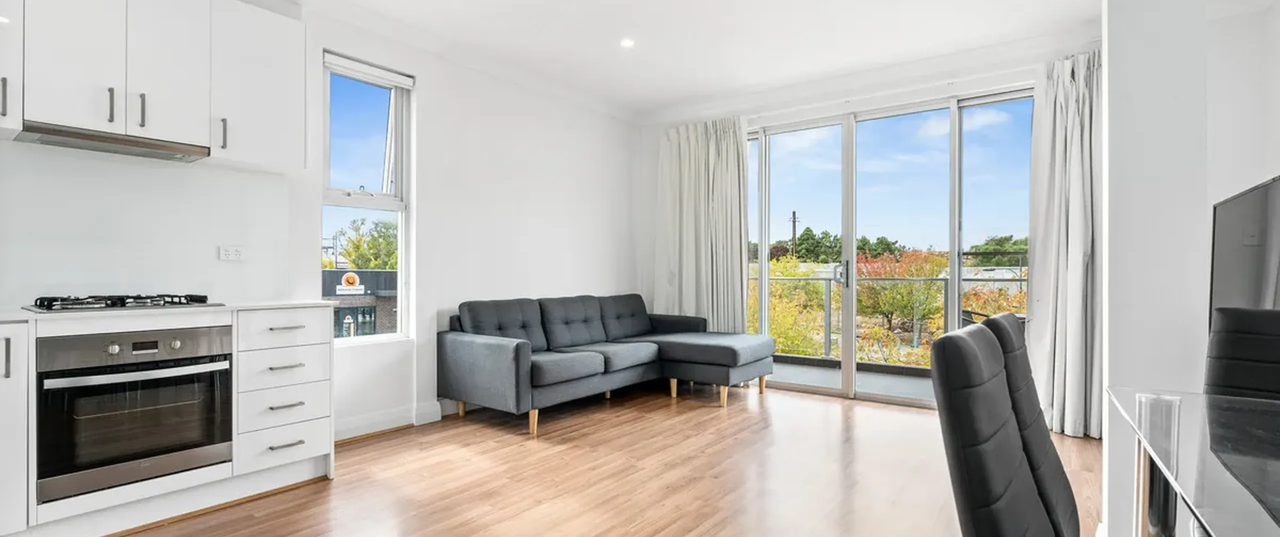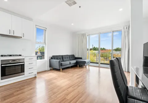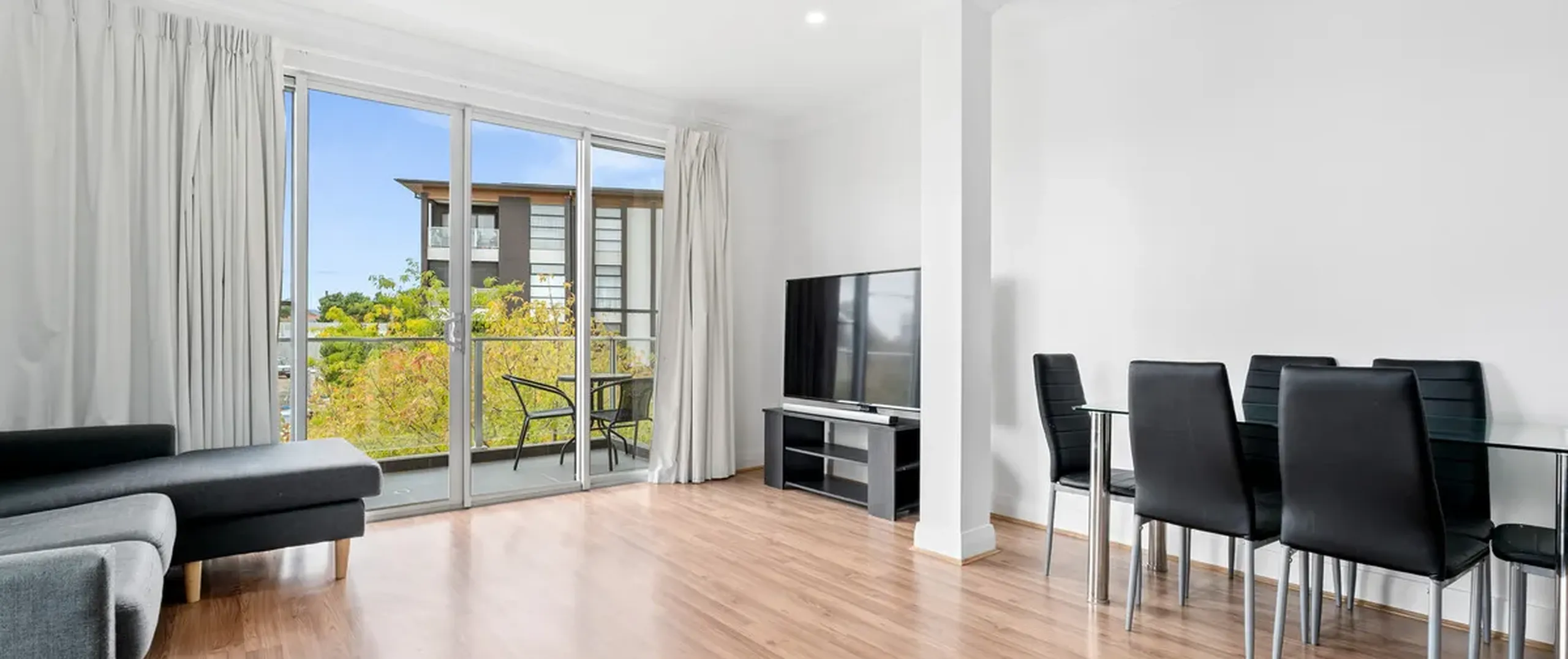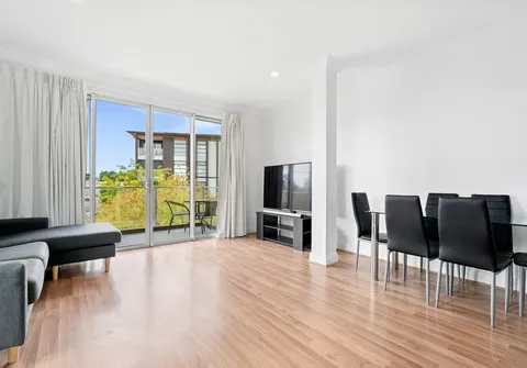 - Light-filled open plan living and dining area with easy-care flooring and glass sliding doors leading to the balcony