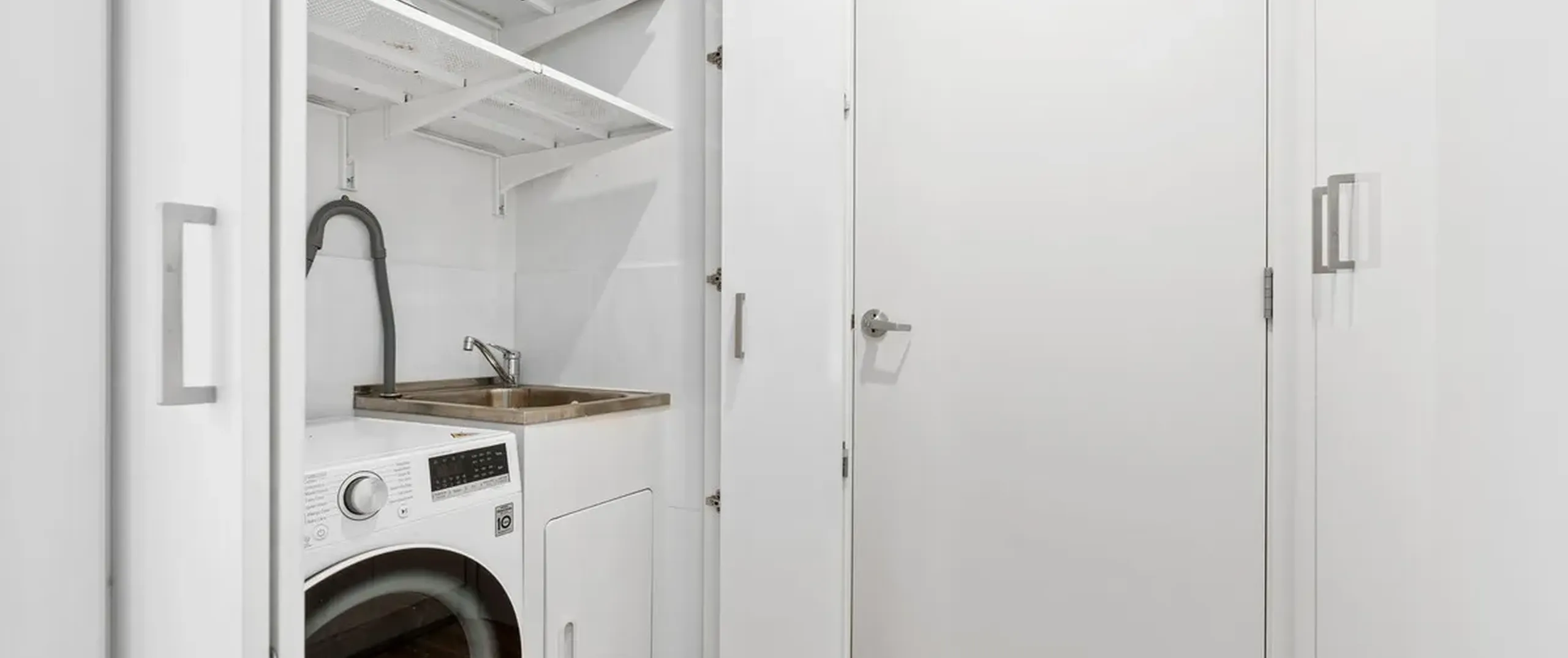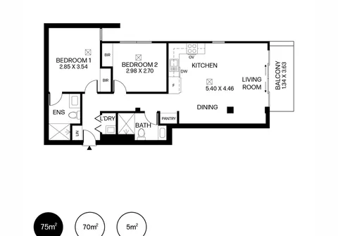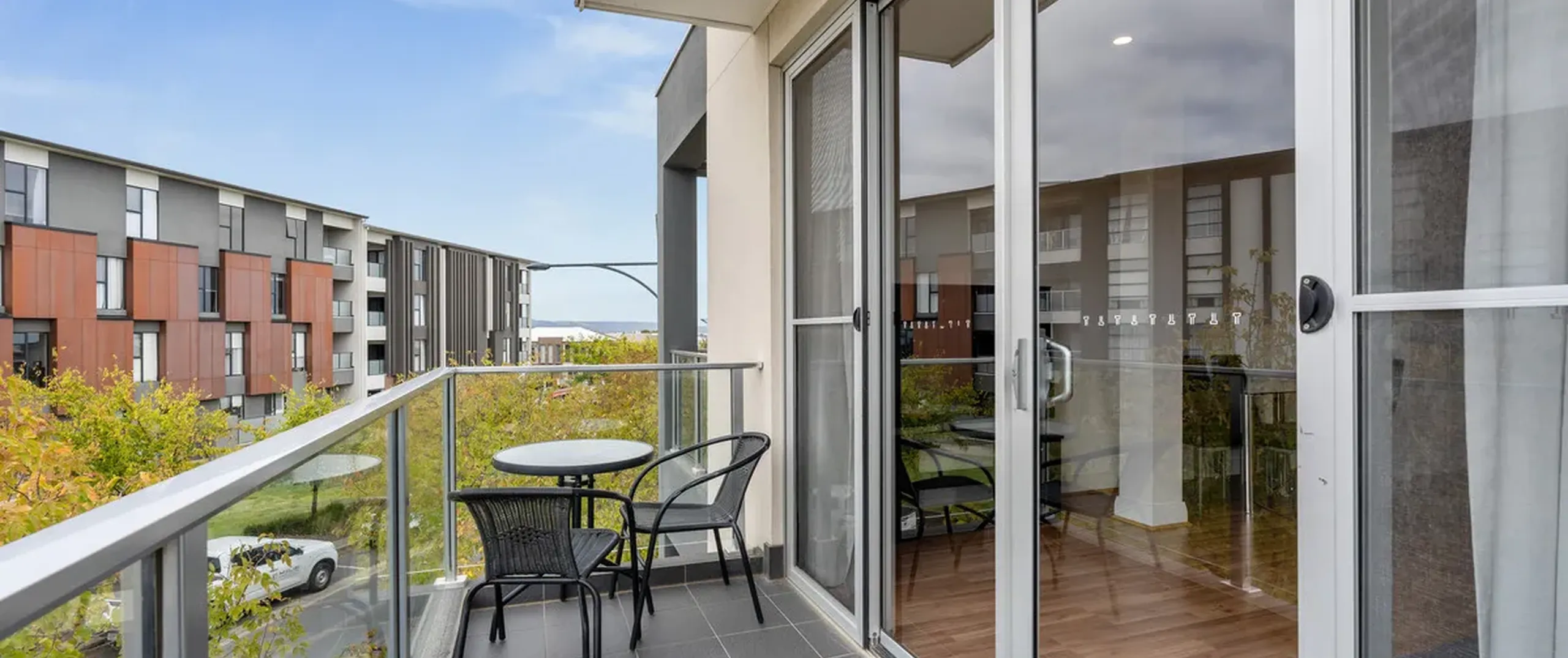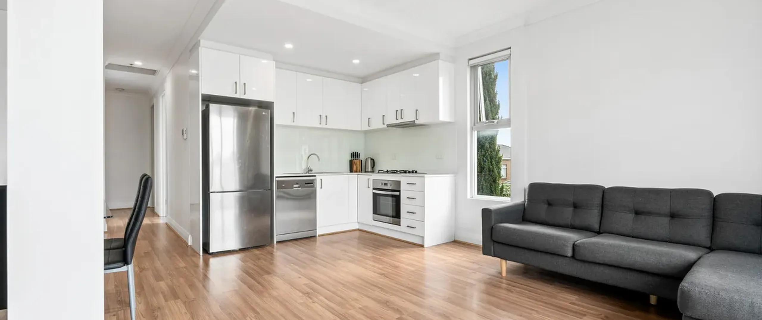 - Light-filled open plan living and dining area with easy-care flooring and glass sliding doors leading to the balcony