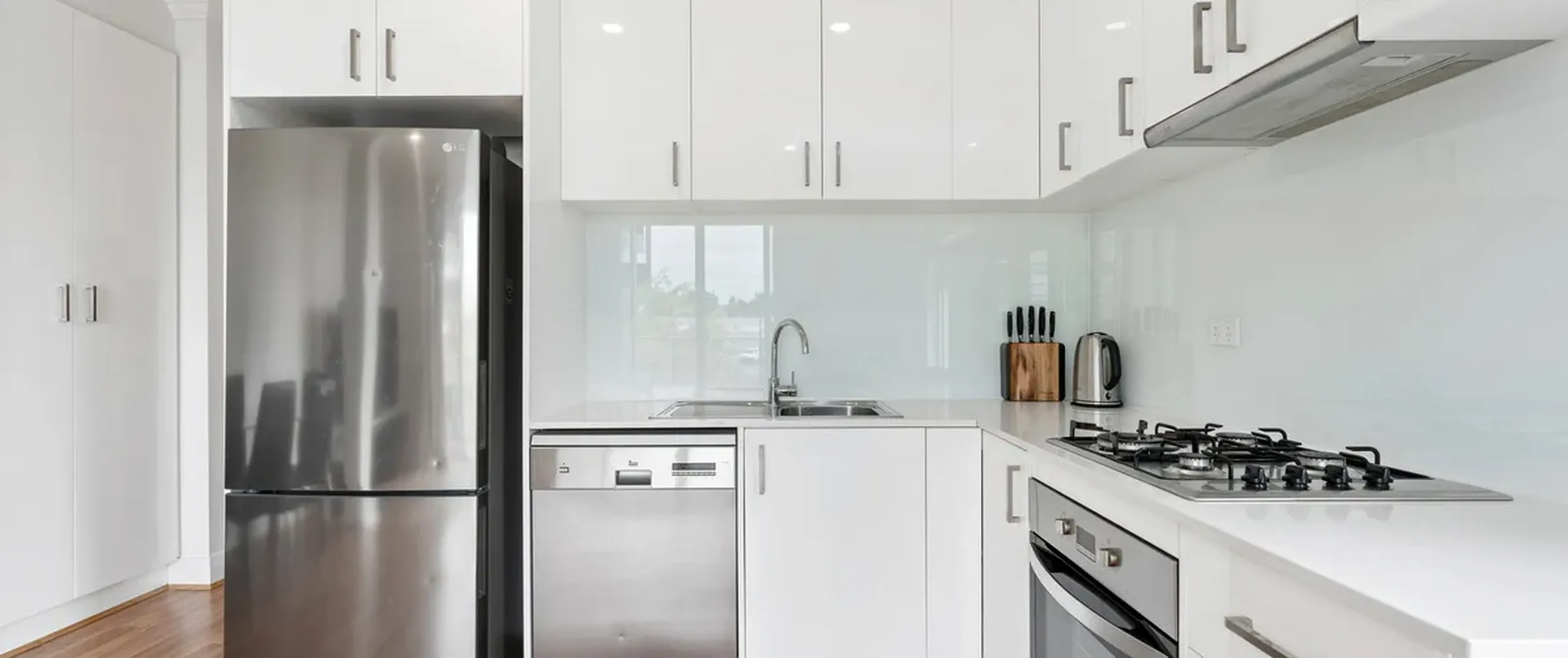 - Modern kitchen with stainless steel dishwasher, oven and gas cooktop, complete with ample storage space, including pantry