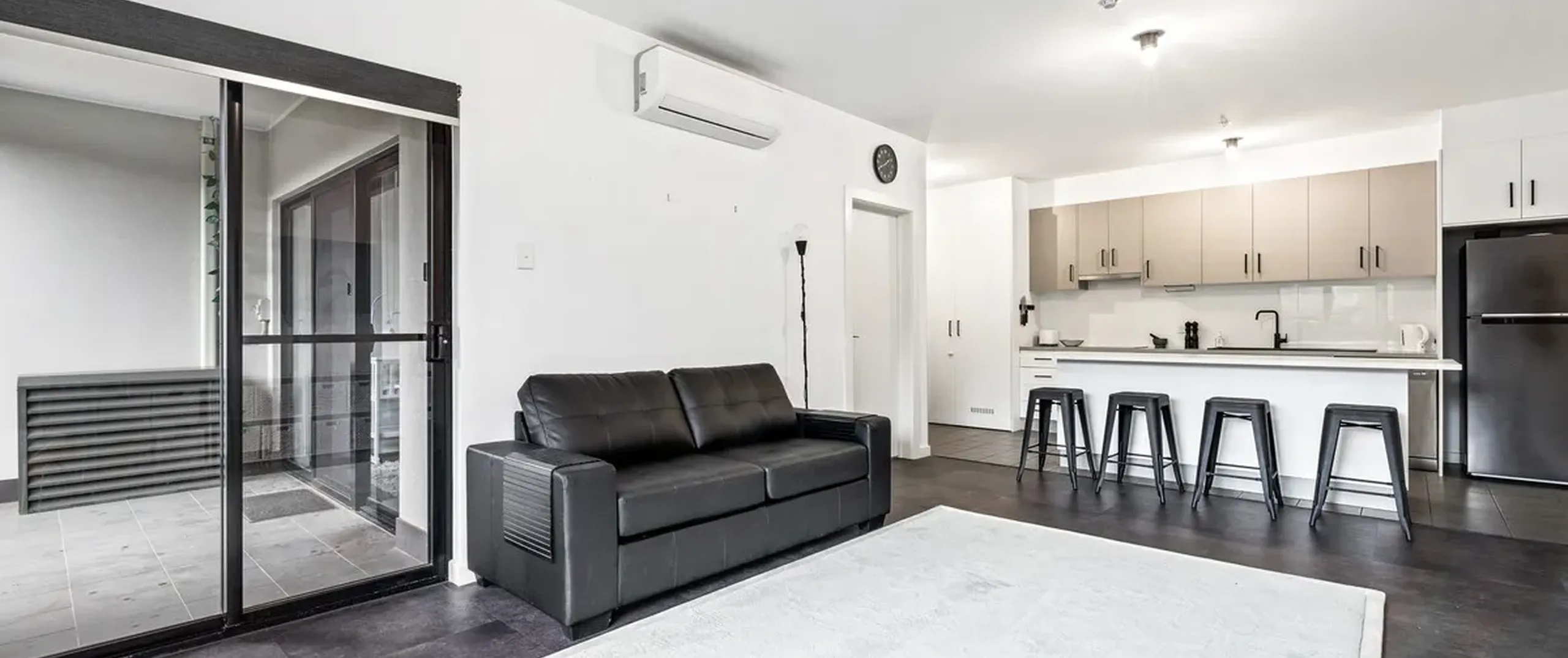 - Light-filled living/dining area with split system air conditioner and sliding door access to the alfresco courtyard