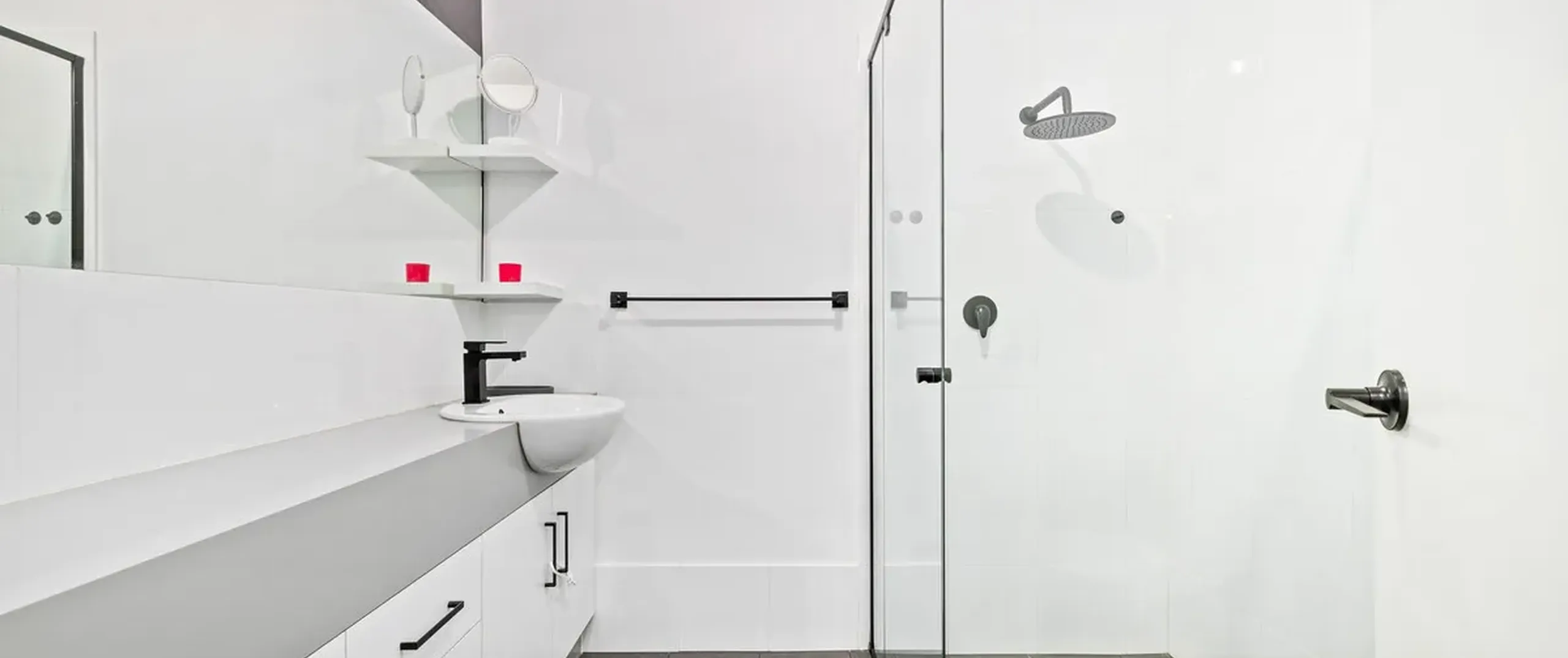 - Contemporary bathroom with sleek matte black hardware and fixtures throughout