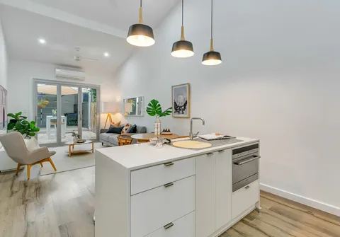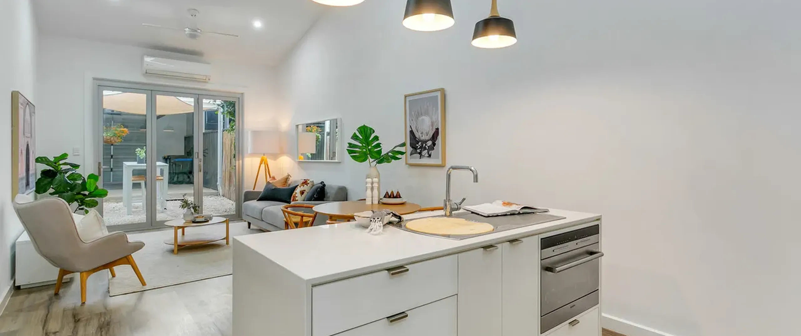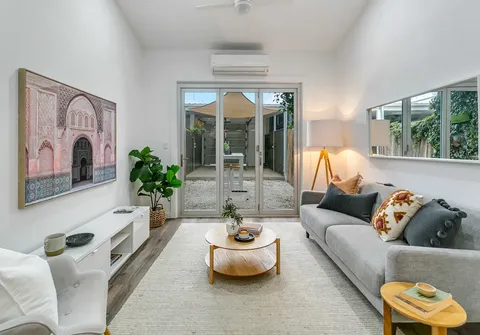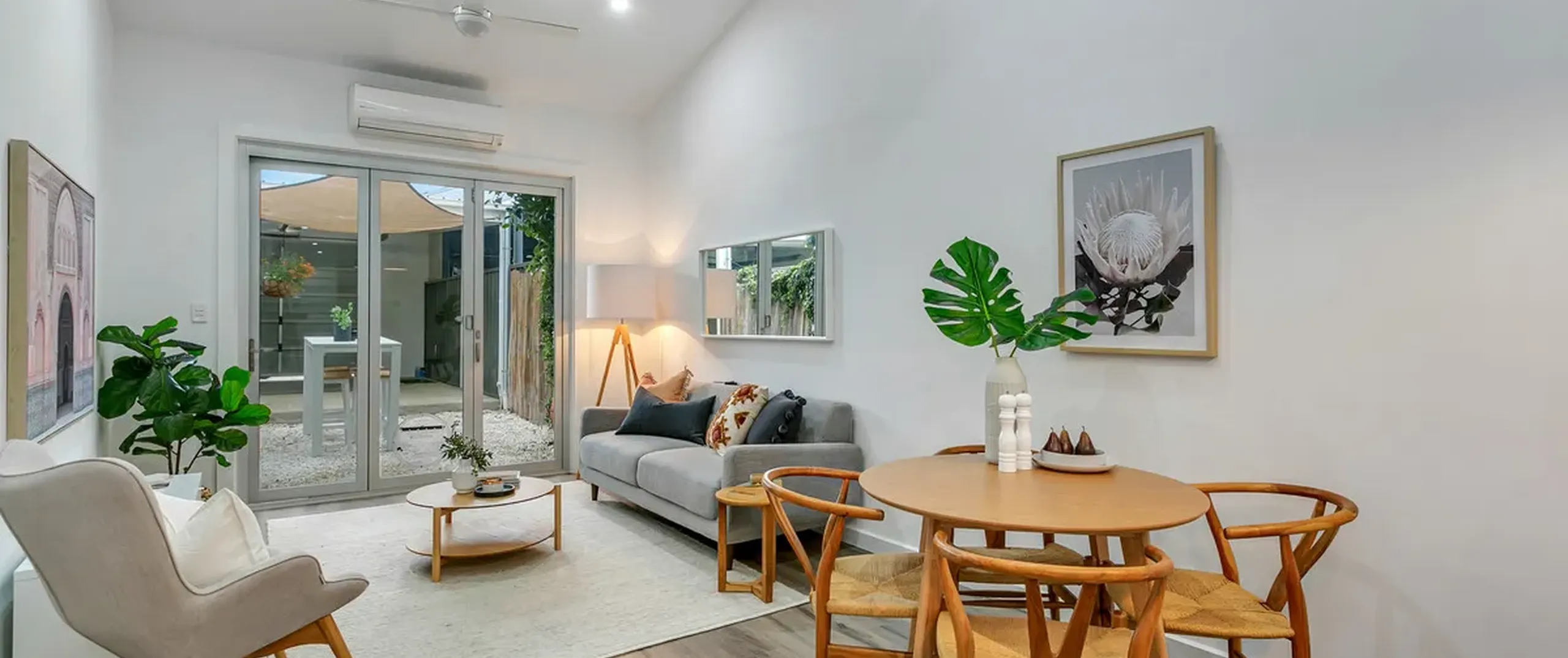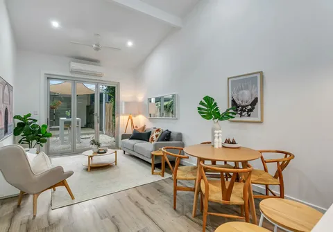 - Light filled open plan living and dining with split system air conditioner and ceiling fans