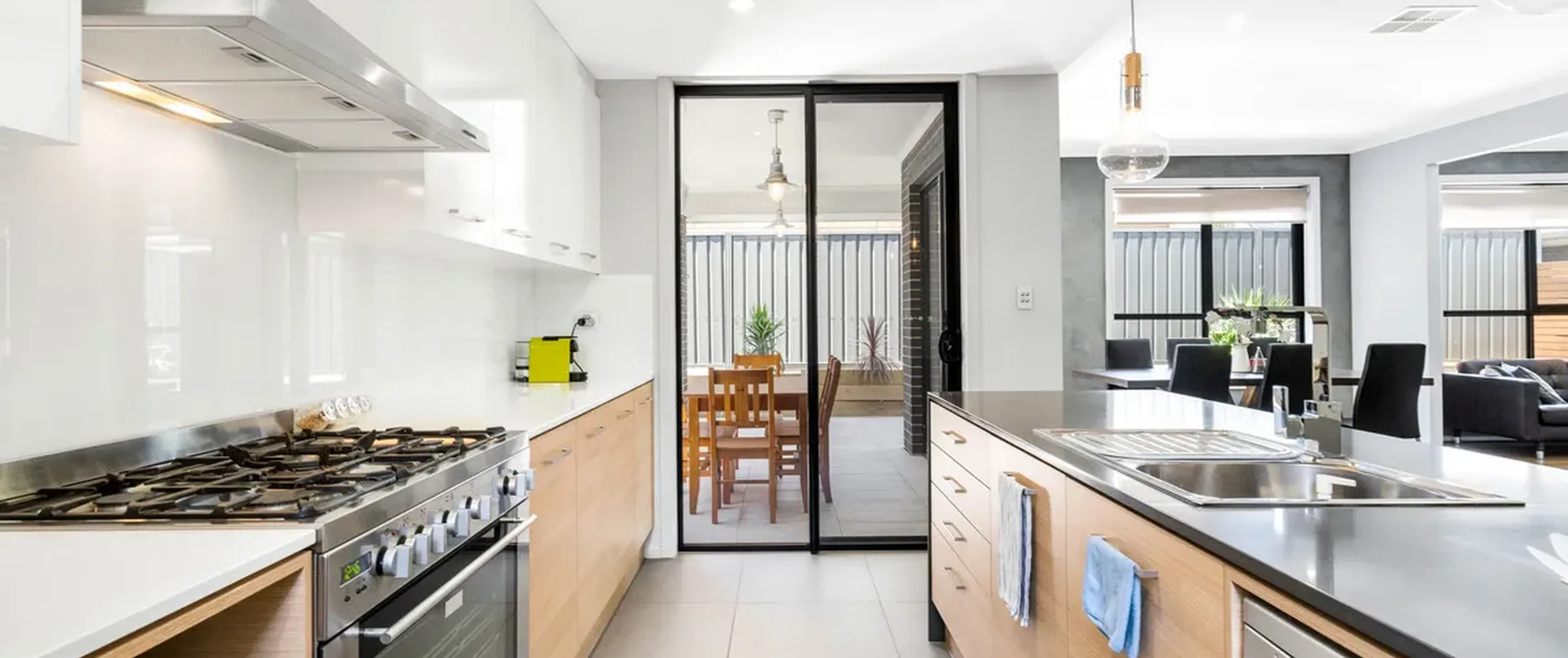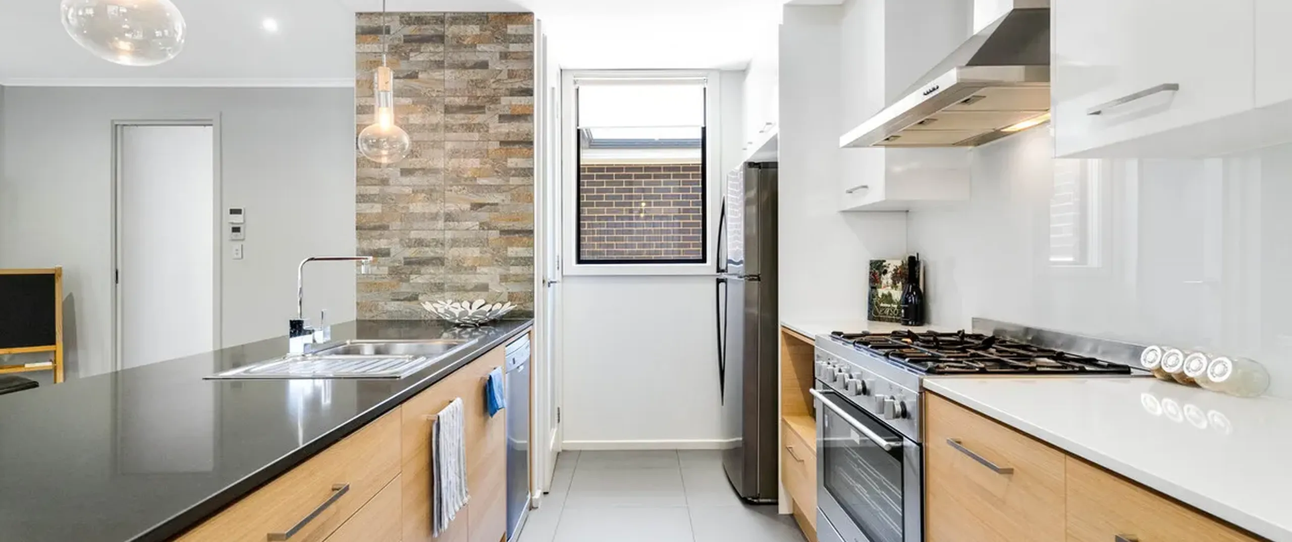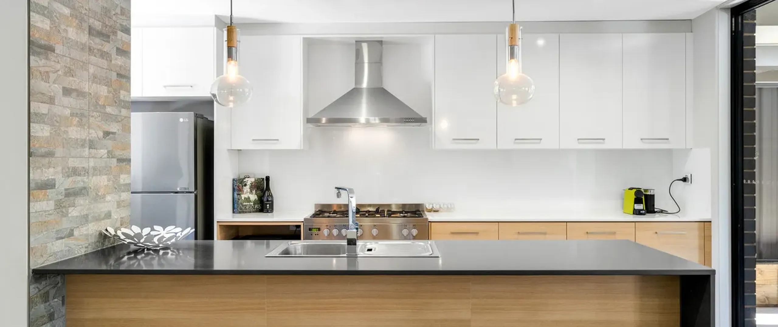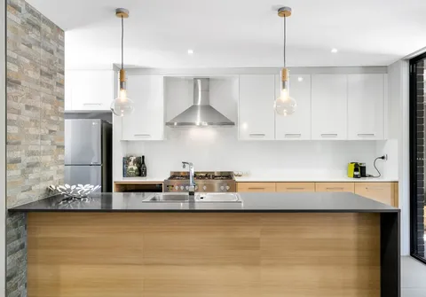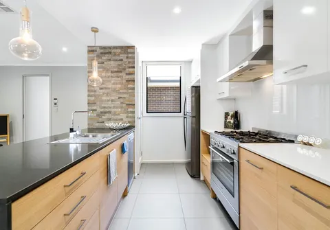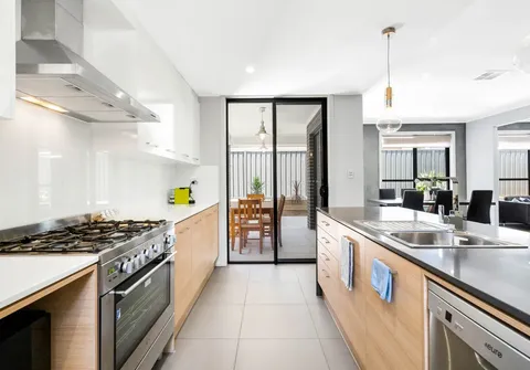 - Kitchen with Stone bench tops, on-trend splash back, stainless steel appliances, dishwasher, pantry, five burner gas cooktop and island with beautiful pendants above