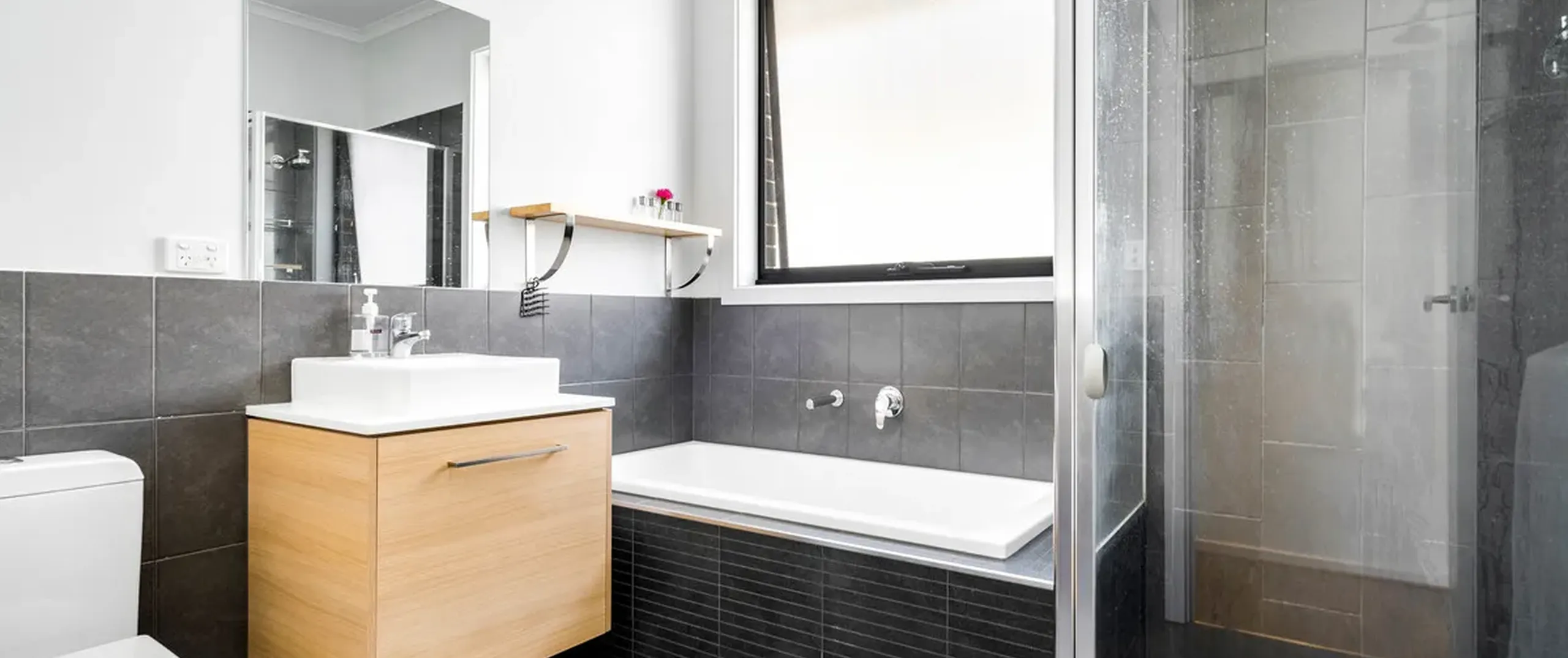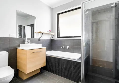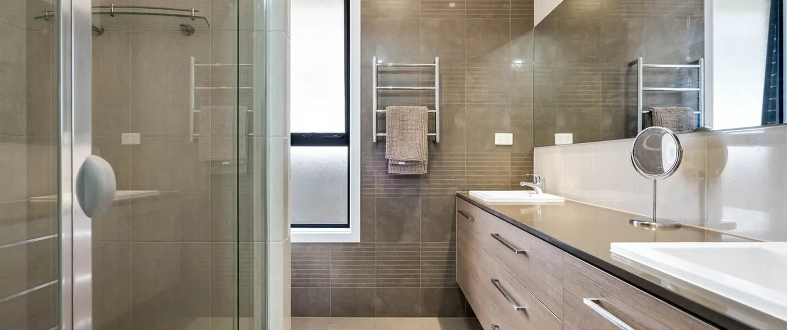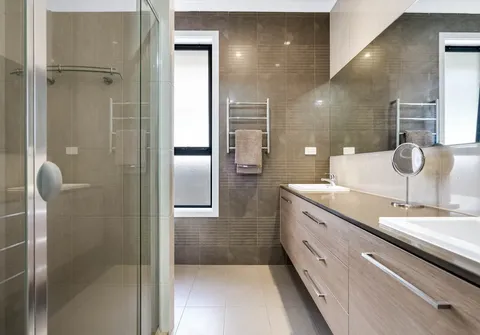 - Large master bedroom with double doors, neutral feature wall, walk in robe and modern ensuite with floor to ceiling tiles and his and hers basin