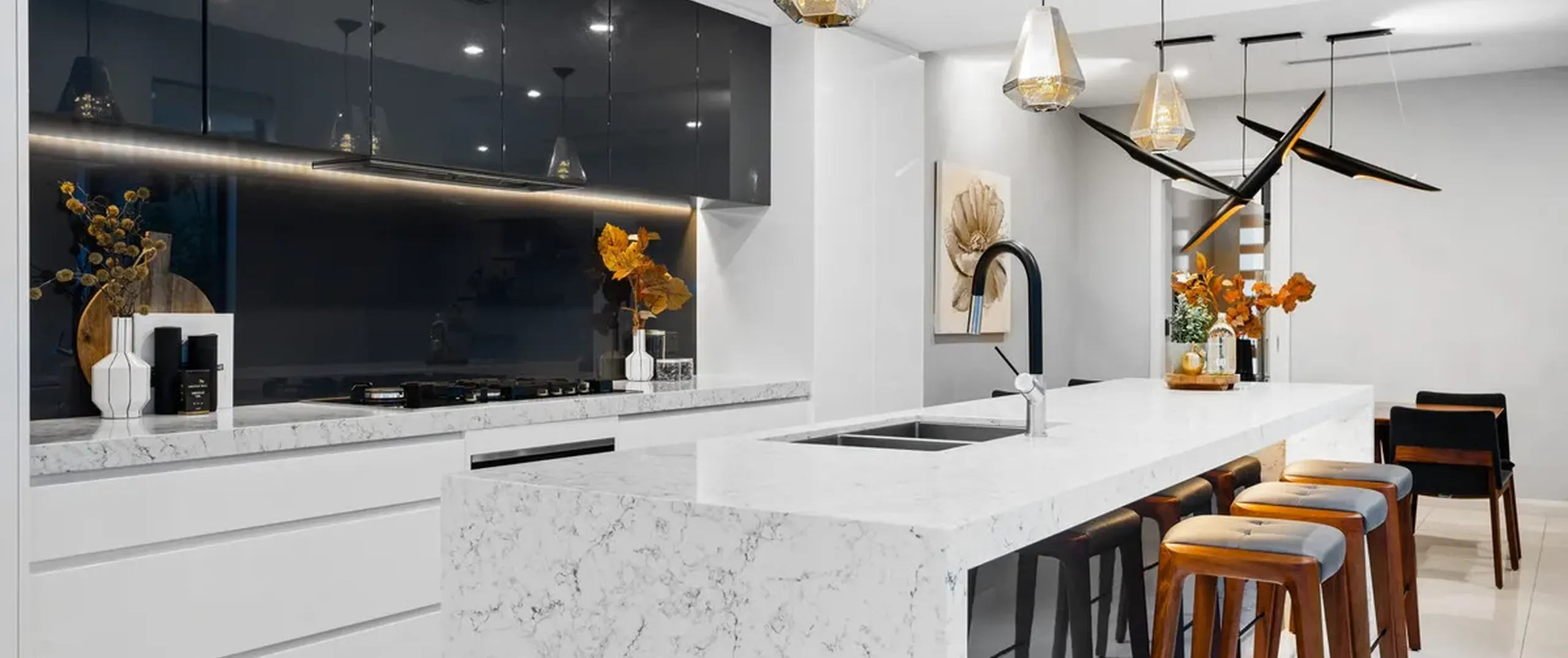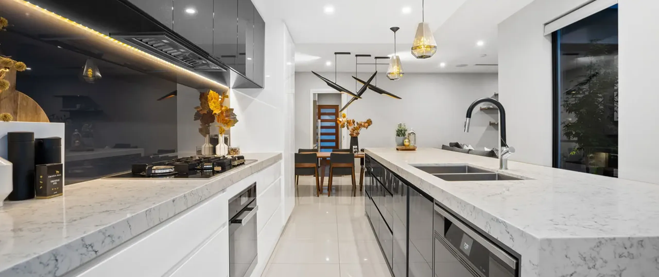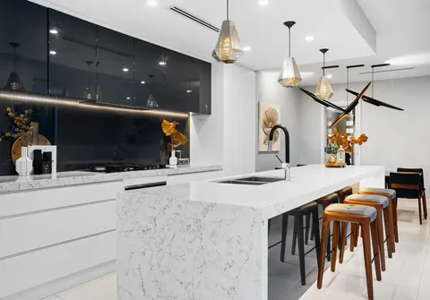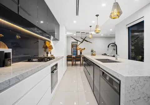 - Show stopping kitchen with quality finishes including marble look stone bench tops, inset sinks, breakfast bar with unique pendants, LED strip lighting, glass splashback, Miele appliances including gas cooktop and integrated dishwasher