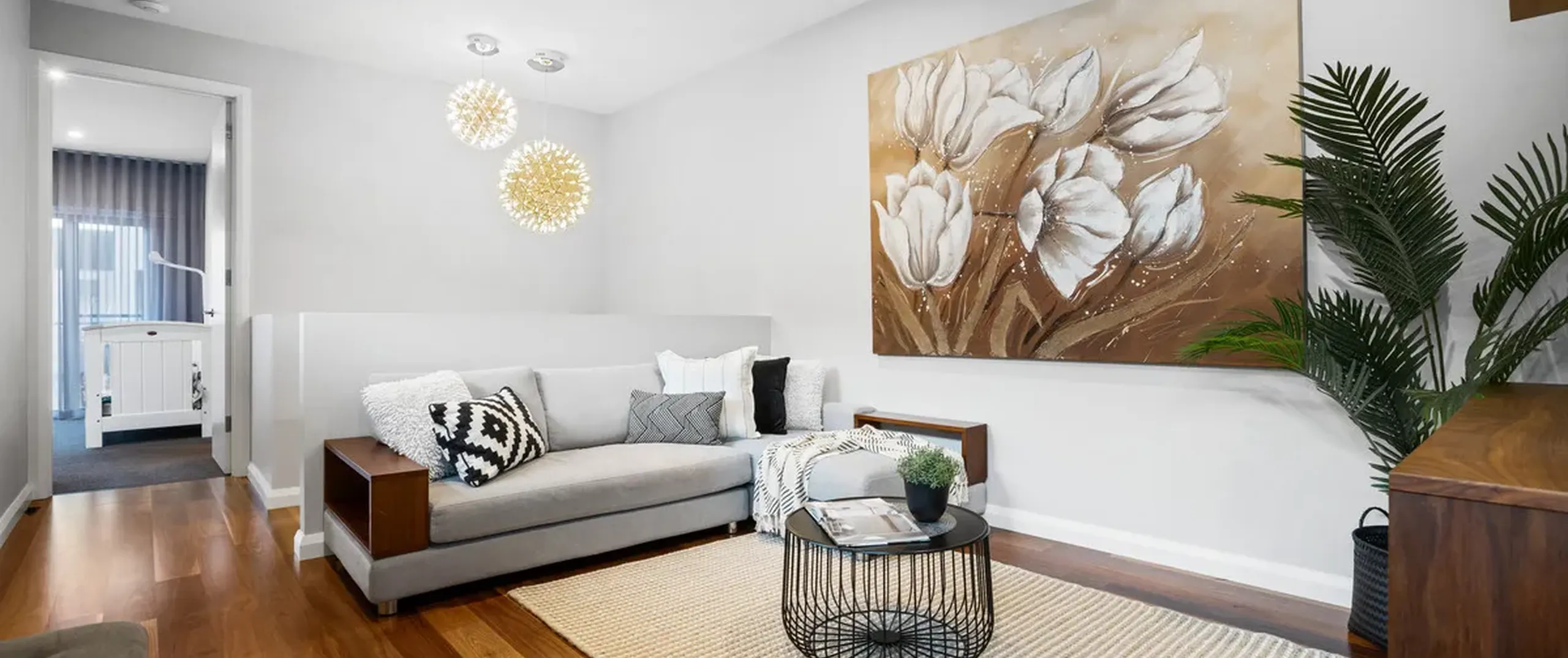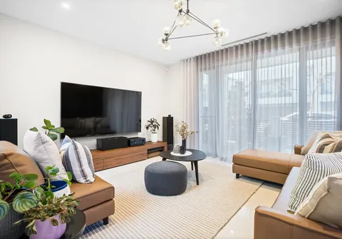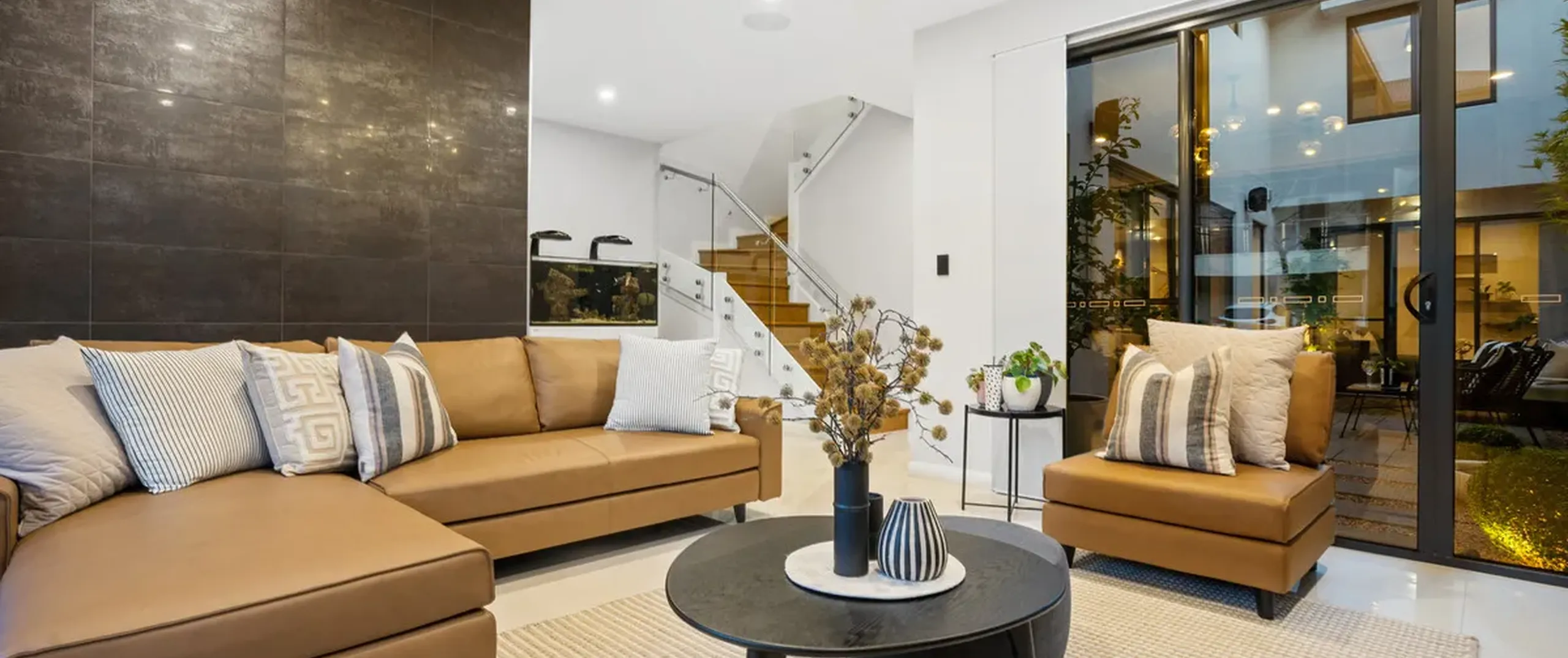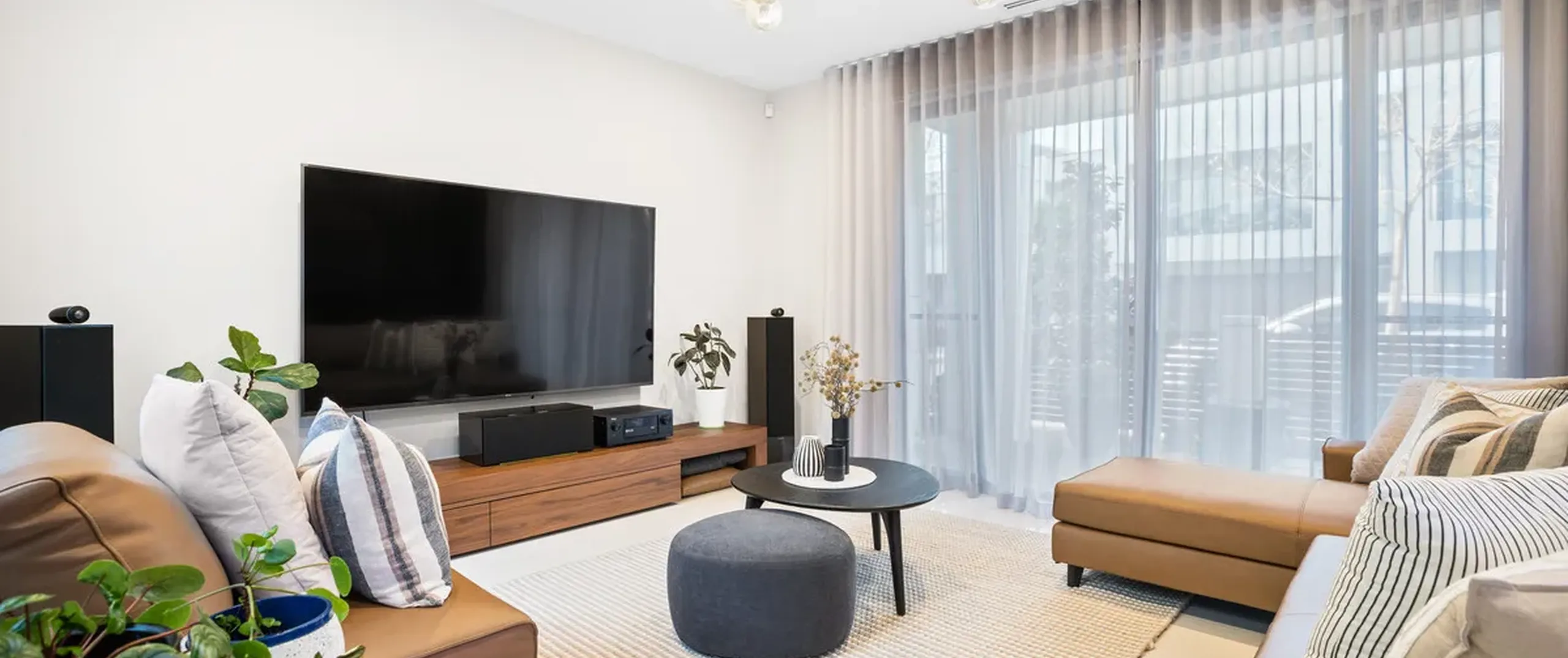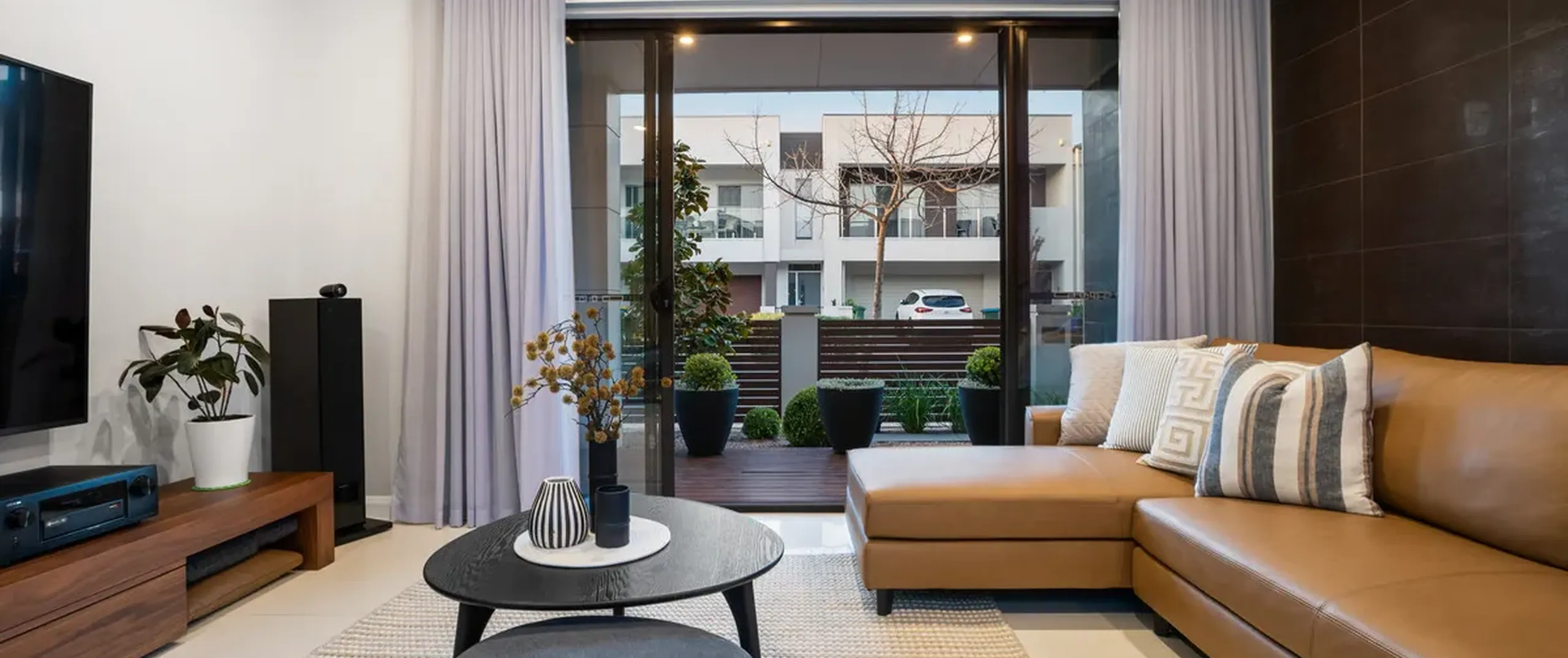 - Living room upon entry with sheer curtains, tiled feature wall and contemporary pendant