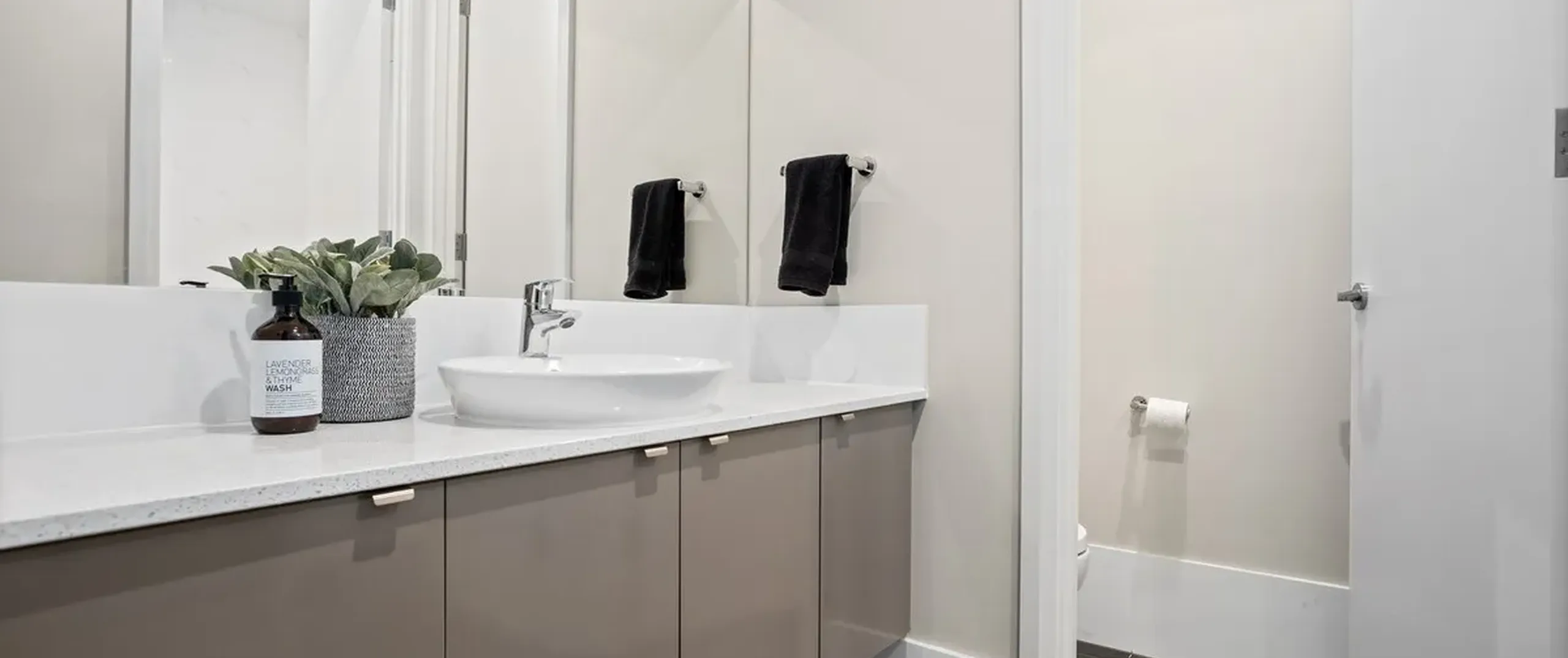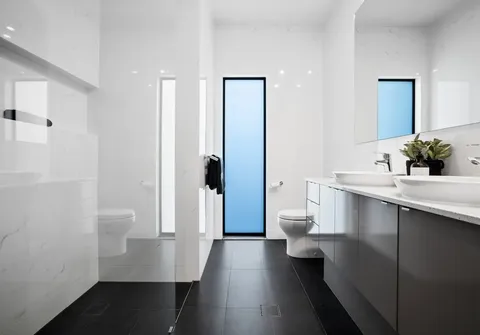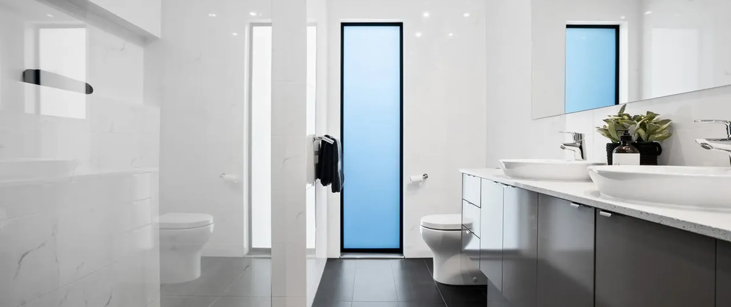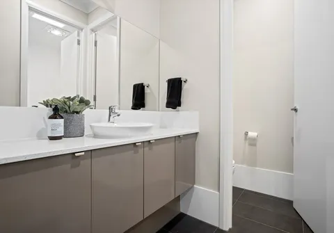 - Sleek 3-way bathroom with powder room, separate toilet + separate shower complete with floor to ceiling tiles and wall hung vanity