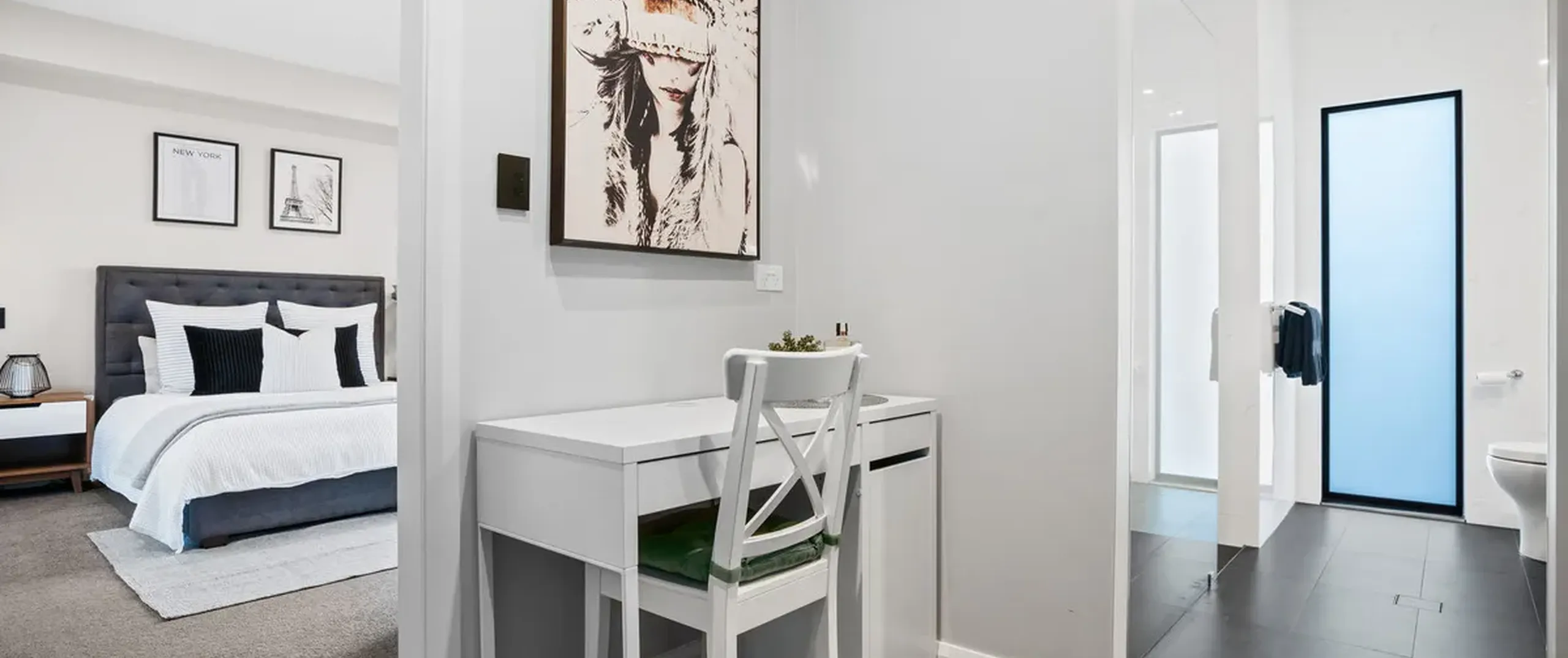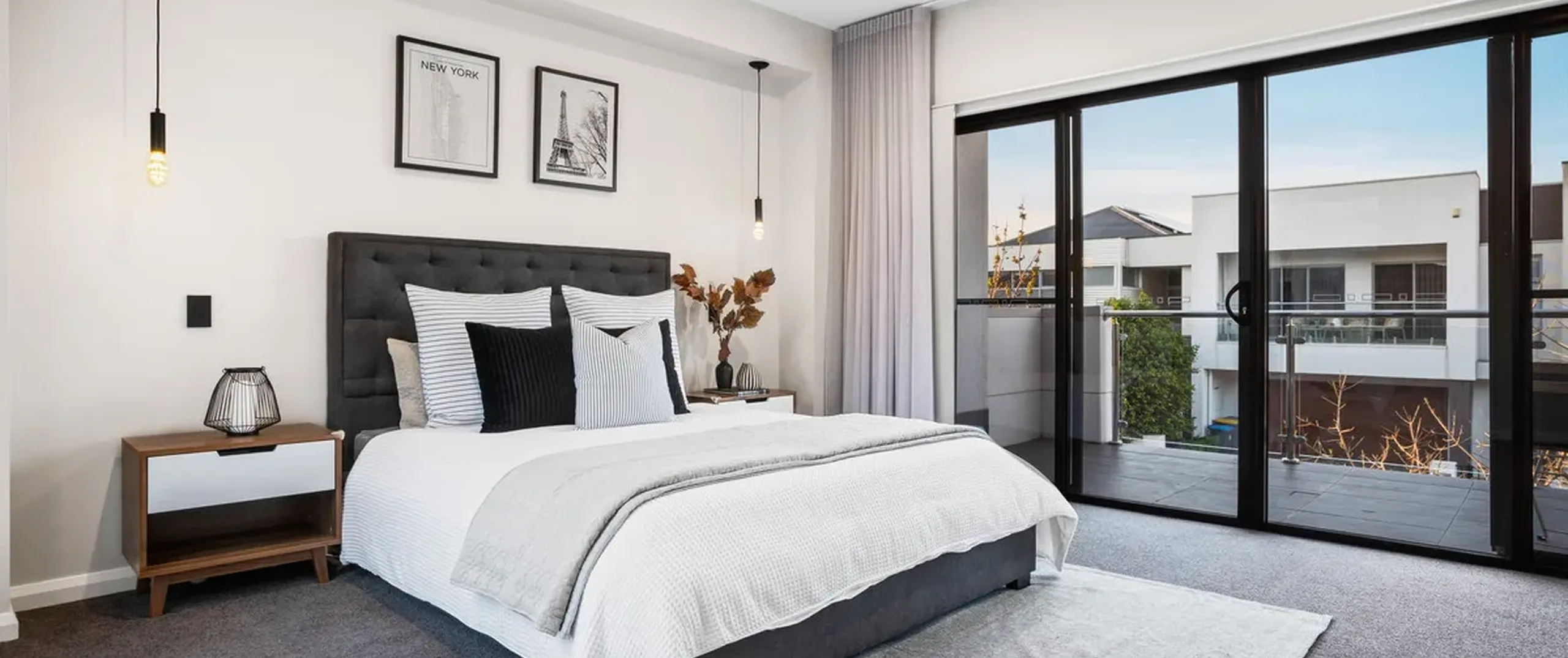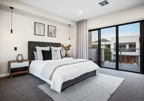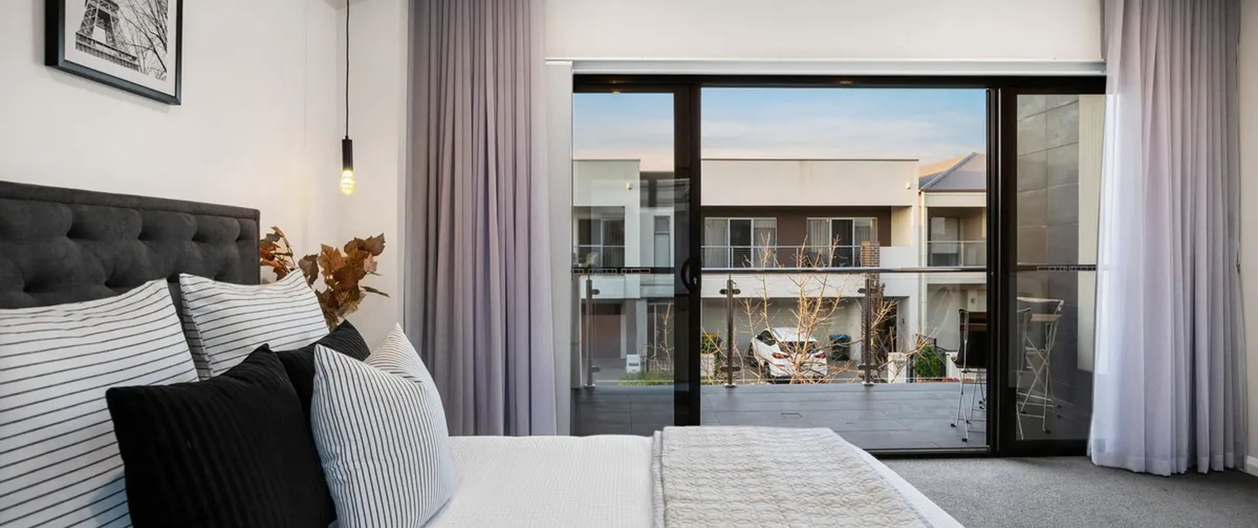 - Spacious master bedroom with beautiful floor to ceiling sheer curtains, feature pendants, large walk-in robe, ensuite with His and Her basins and access to the private balcony