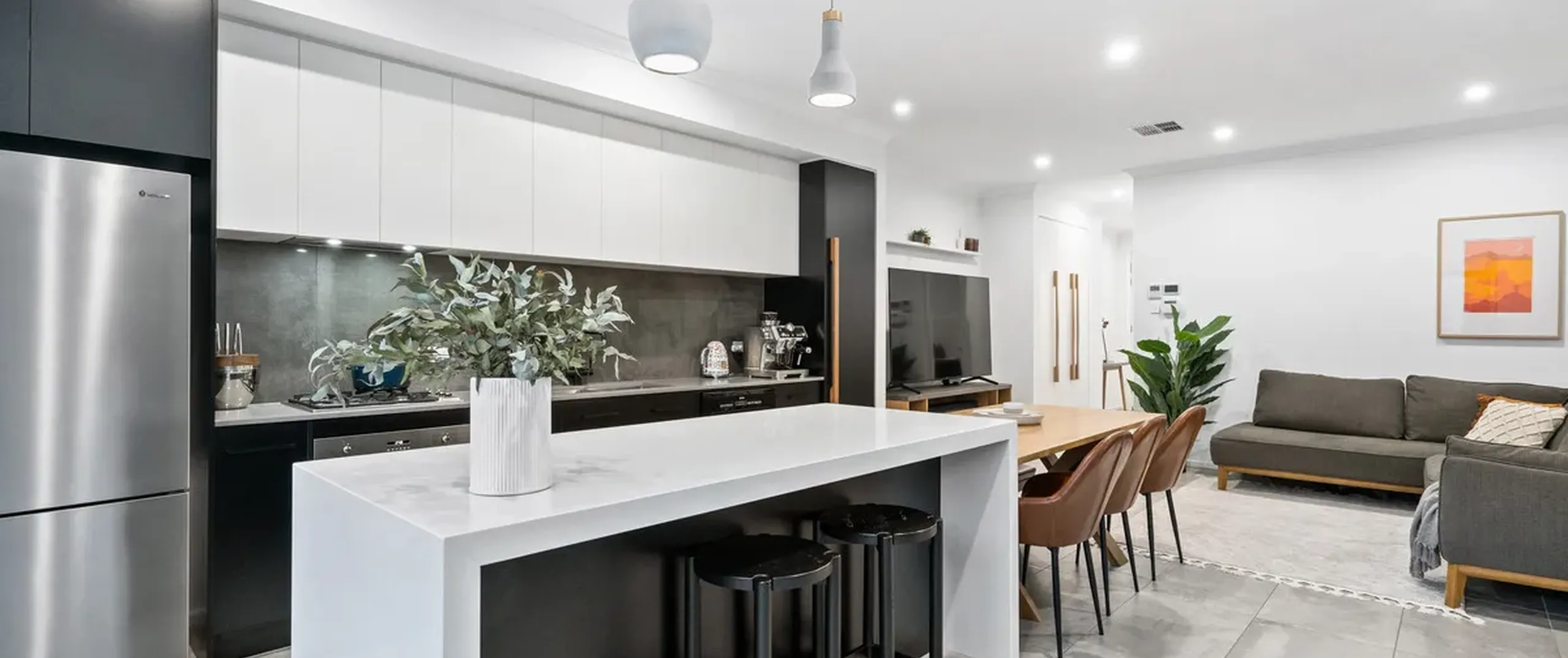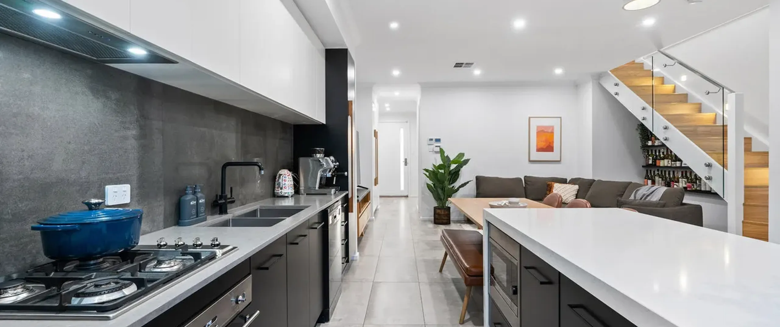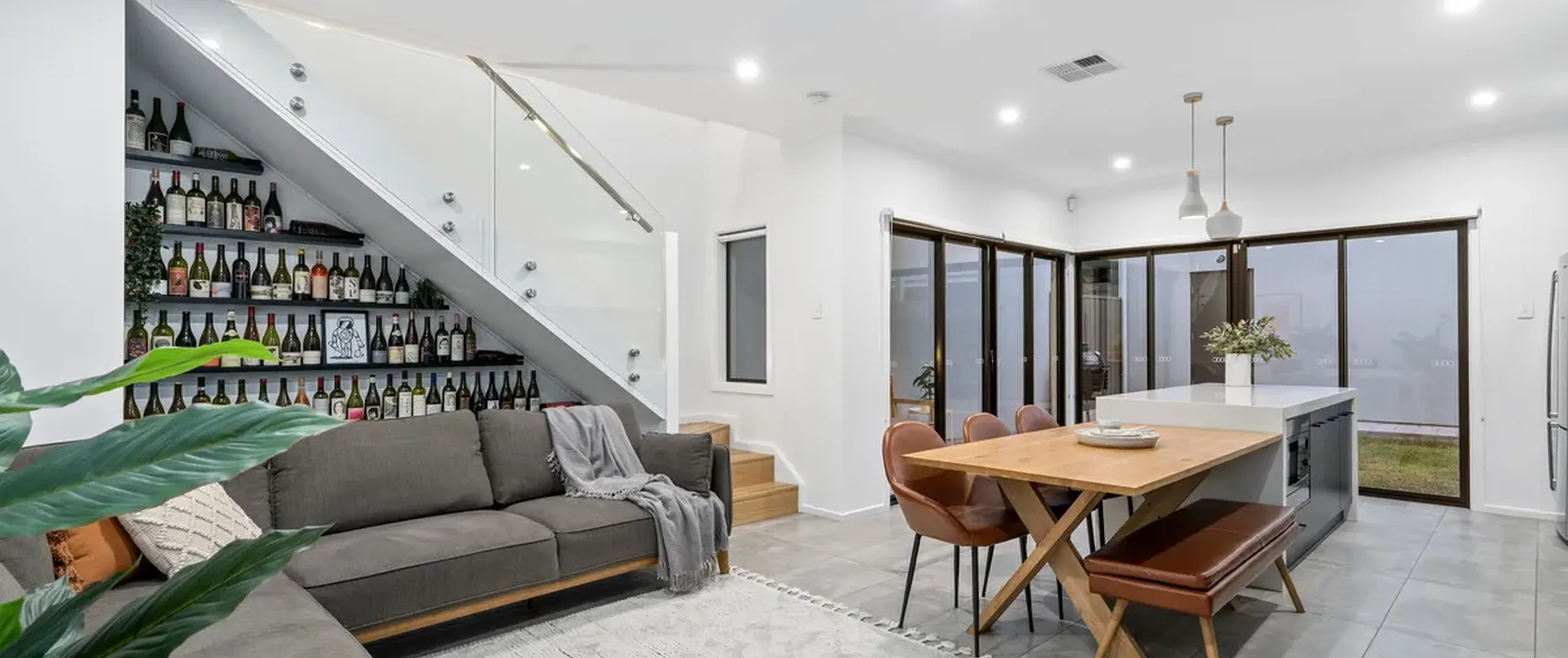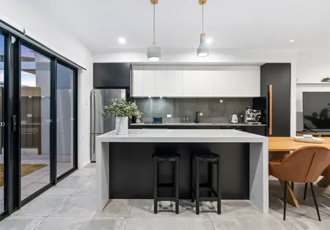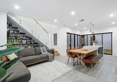 - Fabulous, open-plan kitchen and dining/living with built-in display shelf, tiled flooring, and LED downlighting throughout