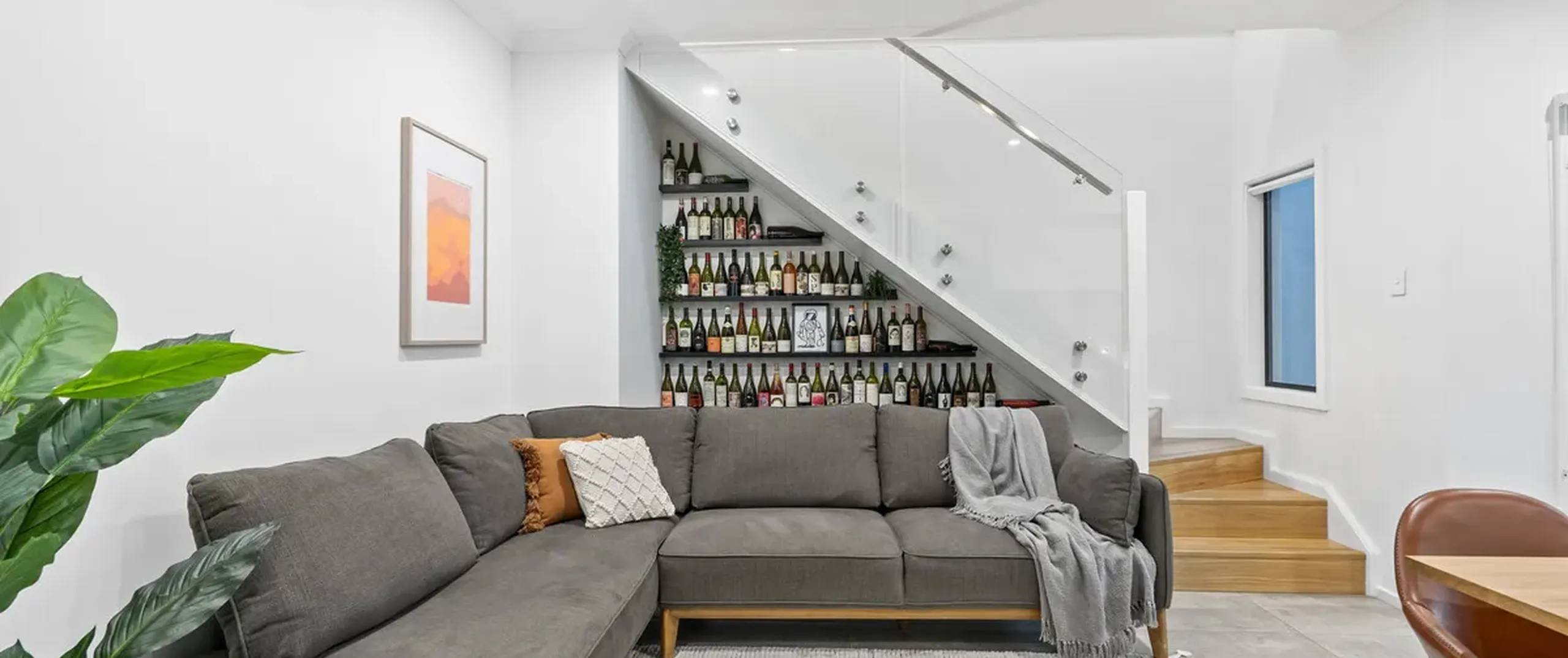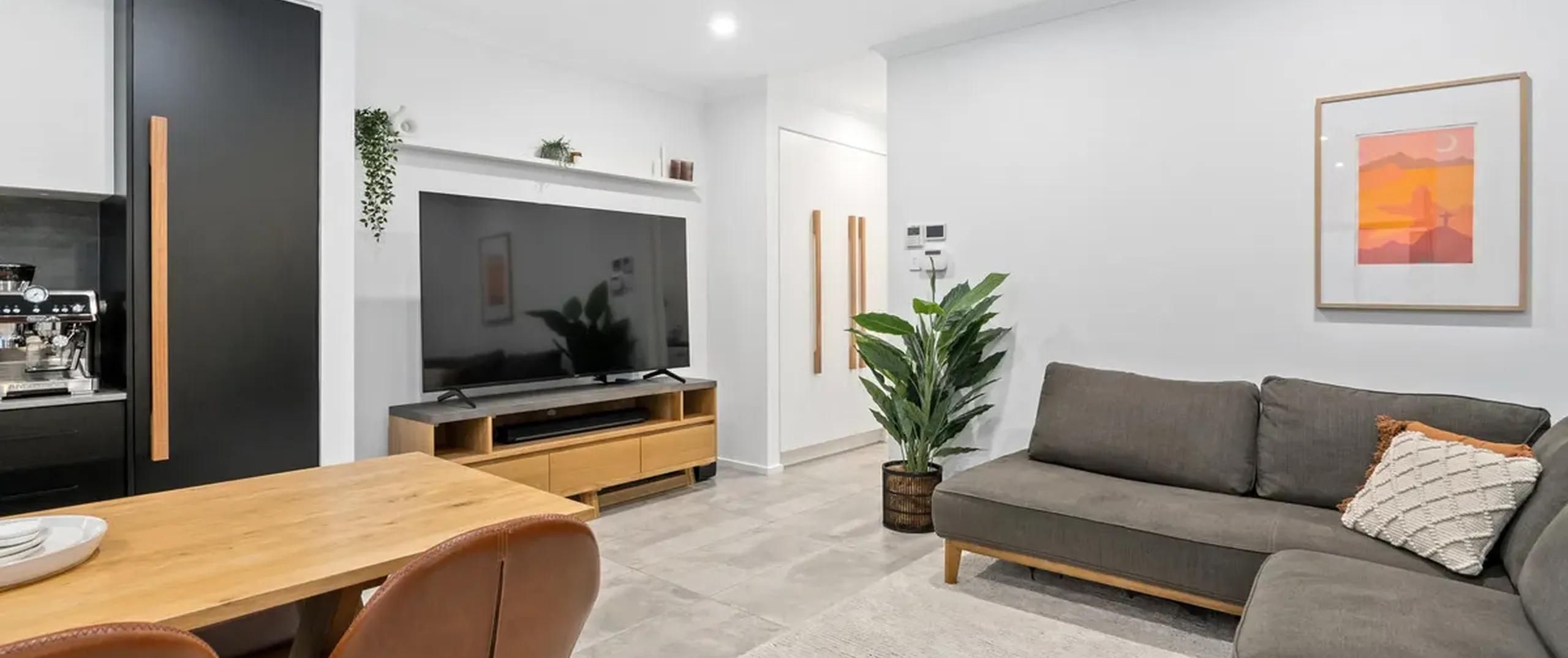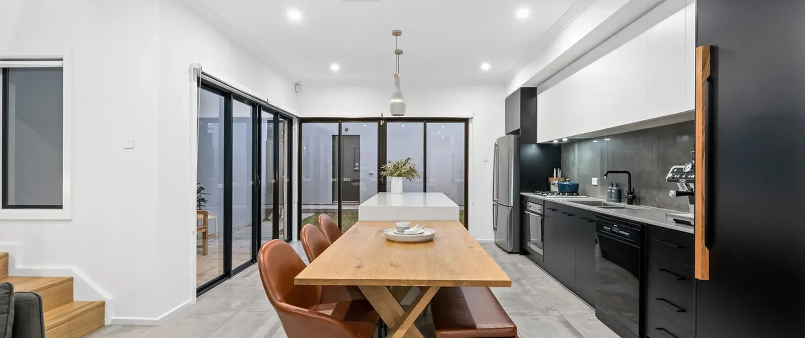 - Fabulous, open-plan kitchen and dining/living with built-in display shelf, tiled flooring, and LED downlighting throughout