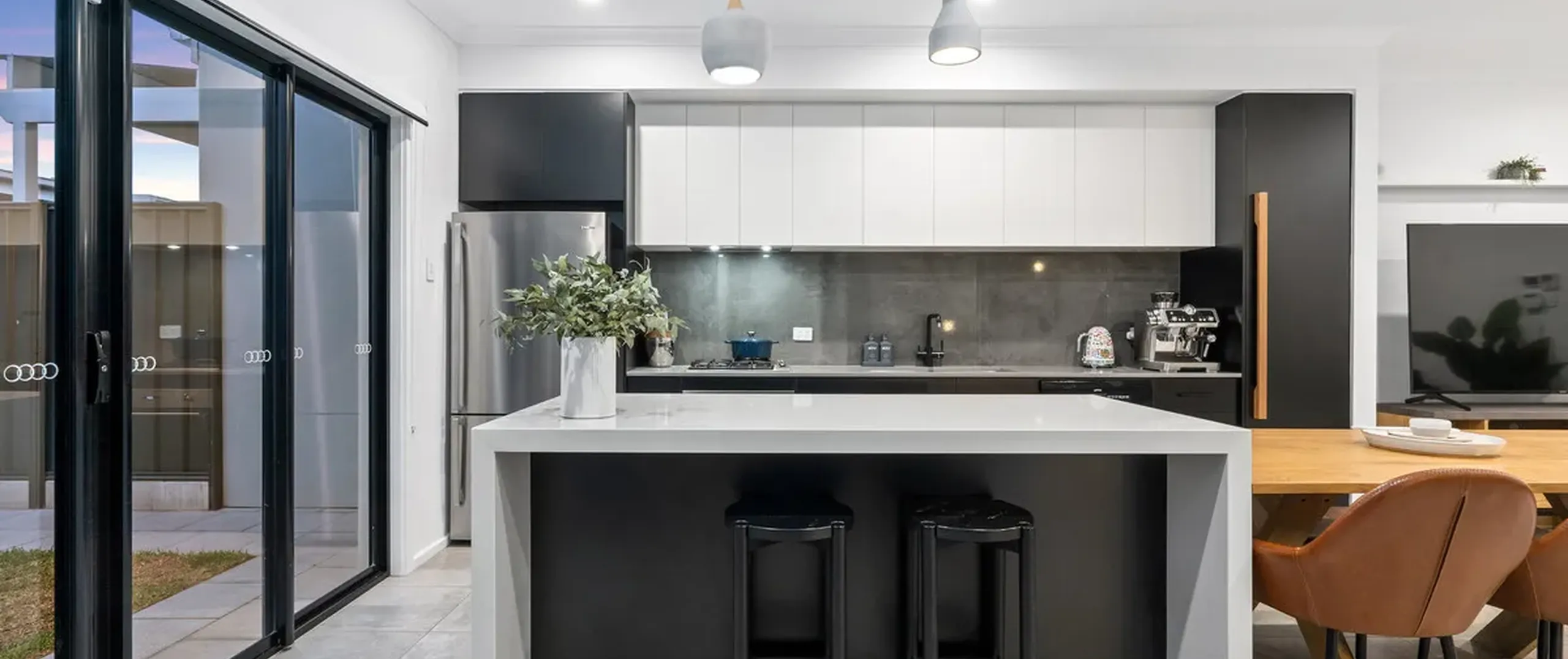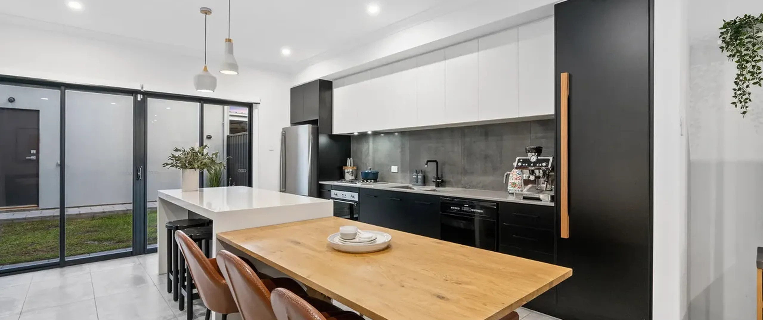 - Vogue on-trend kitchen featuring high-quality stainless-steel Euro appliances, gas cooktop, dishwasher, 40mm stone waterfall island bench with breakfast bar, boasting matte black cabinetry with over-sized oak handles