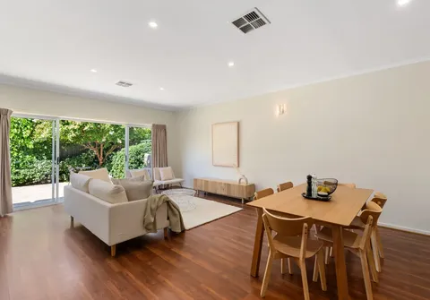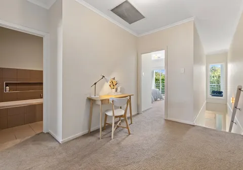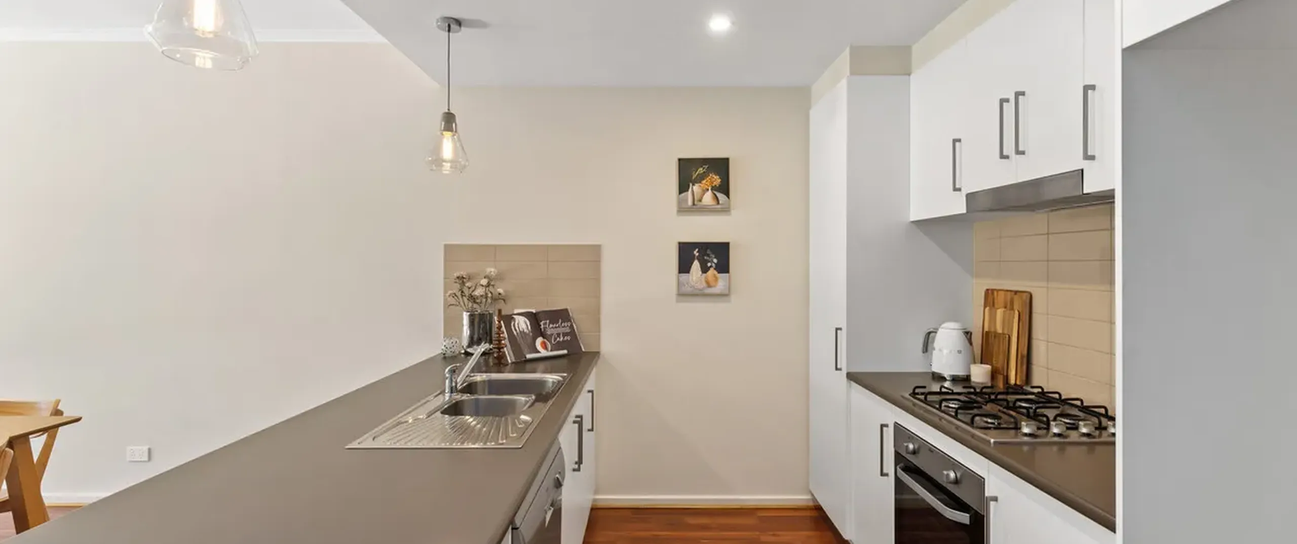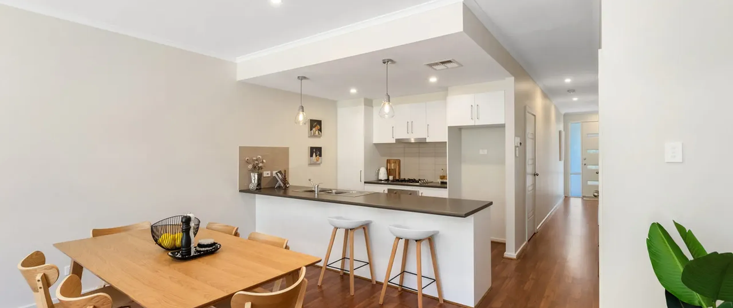 A timeless, well-equipped kitchen is set within the heart of the layout which features bulkhead and pendant lighting, gas cooking, dishwasher, ample storage and a breakfast bar. The modern ambience infiltrates throughout complimented by natural colour tones and a generous amount of natural light from the windows.