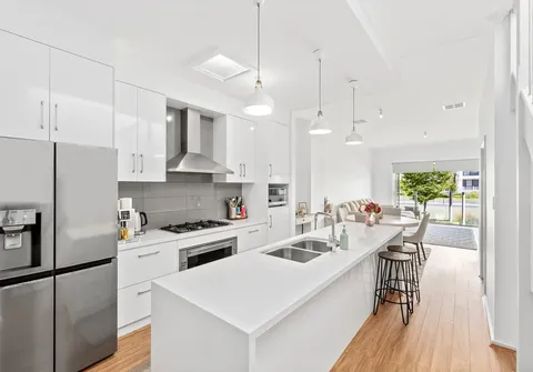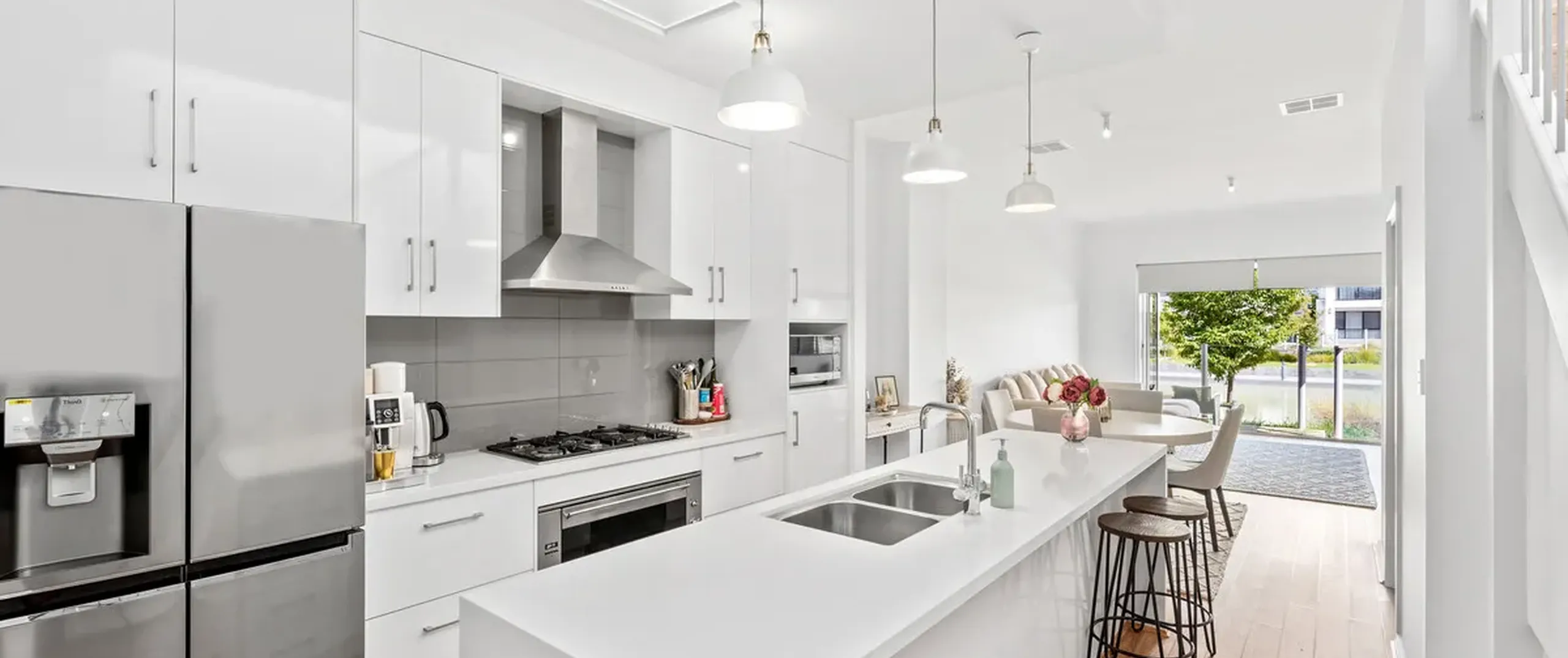 - Sleek modern kitchen with dishwasher, gas cooktop, pantry complete with breakfast bar and feature pendant lighting