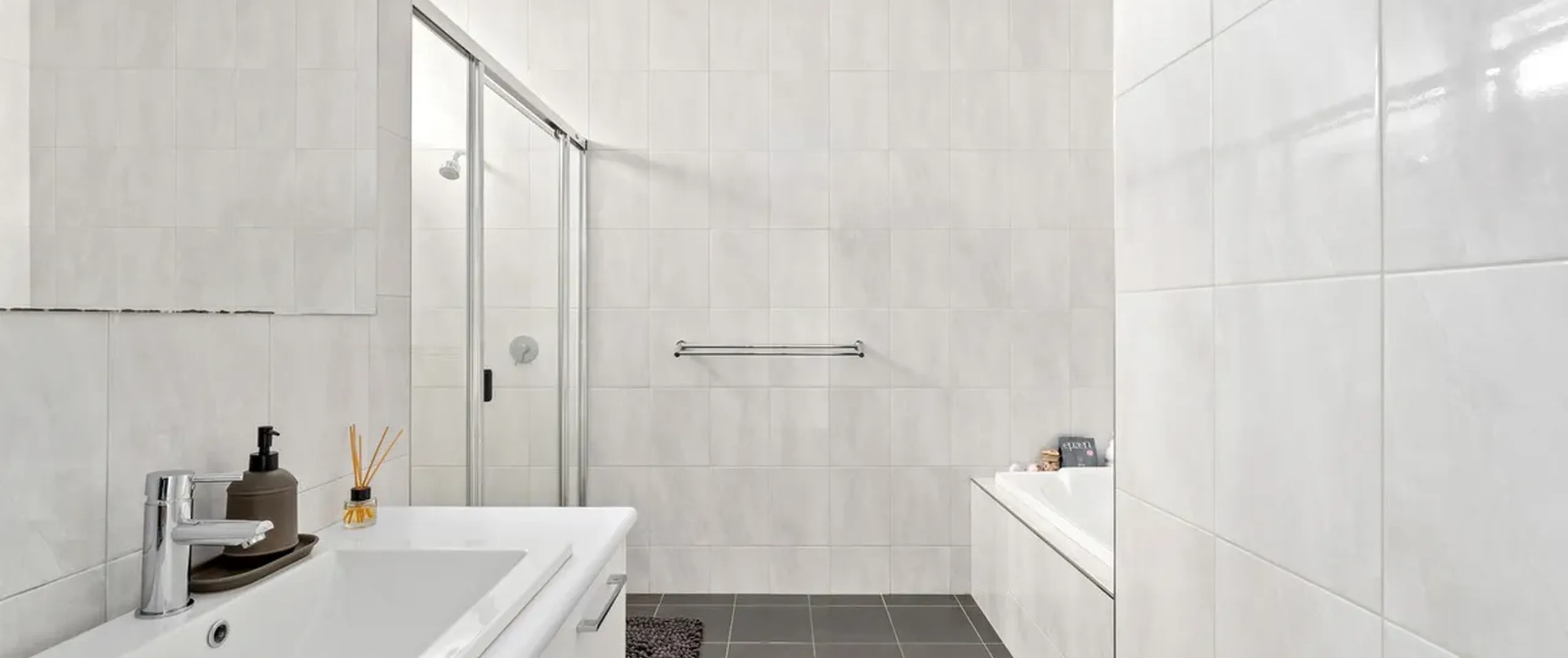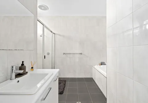 - Stylish main bathroom with floor to ceiling tiles, bathtub, shower + separate toilet for convenience