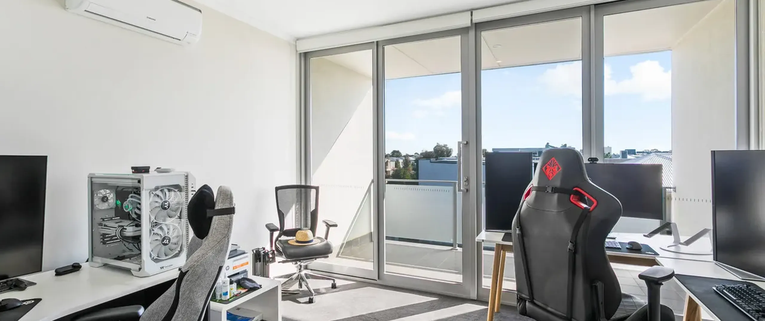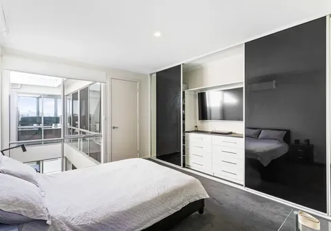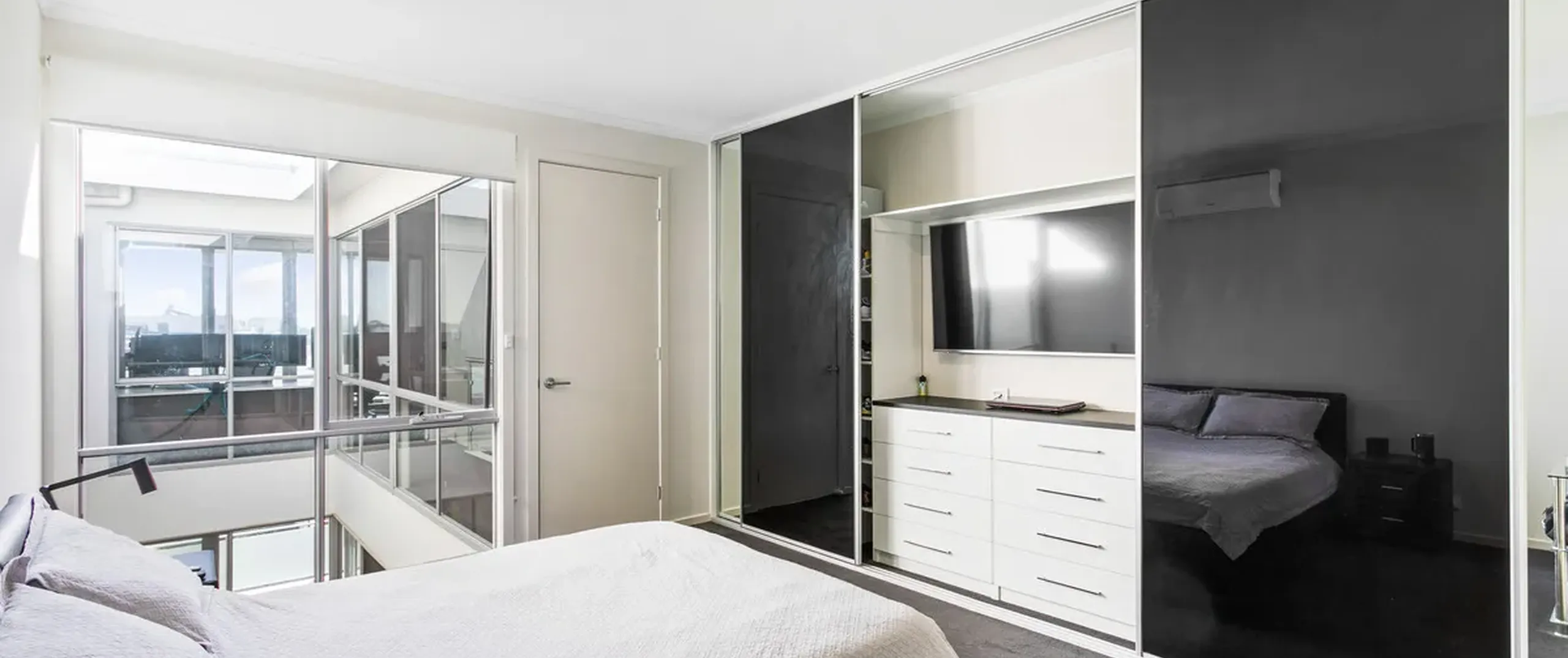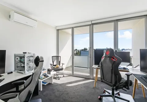 - Bedroom three with split system air-conditioning and sliding doors opening out to the private balcony