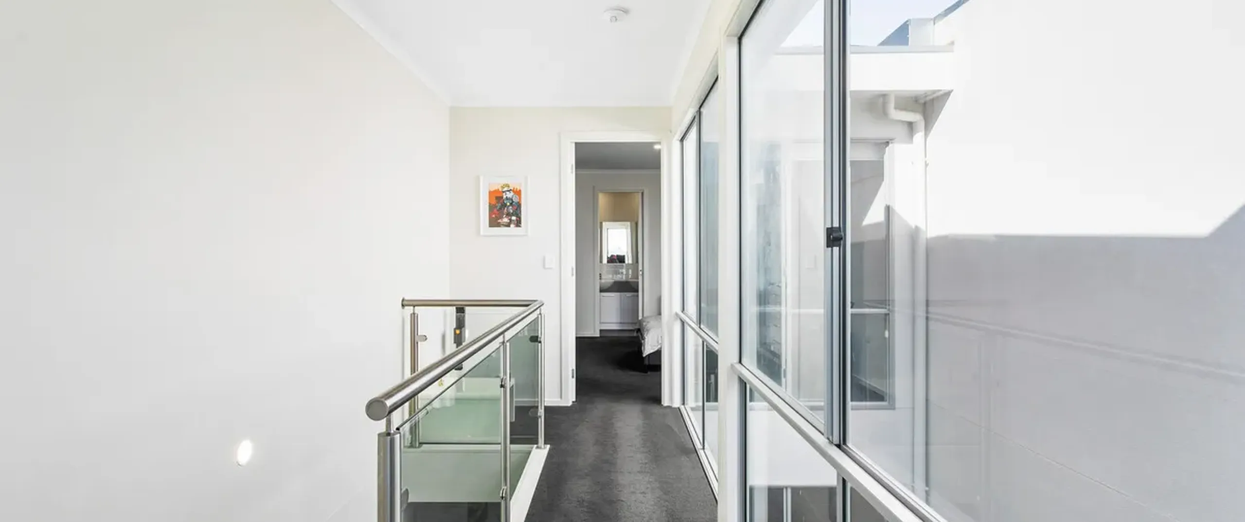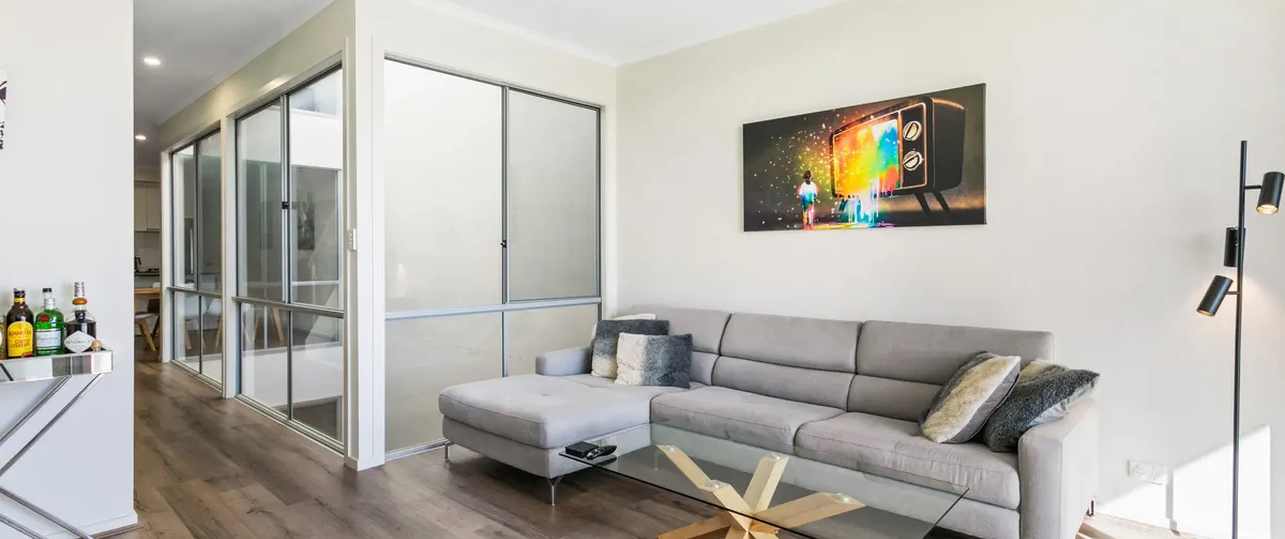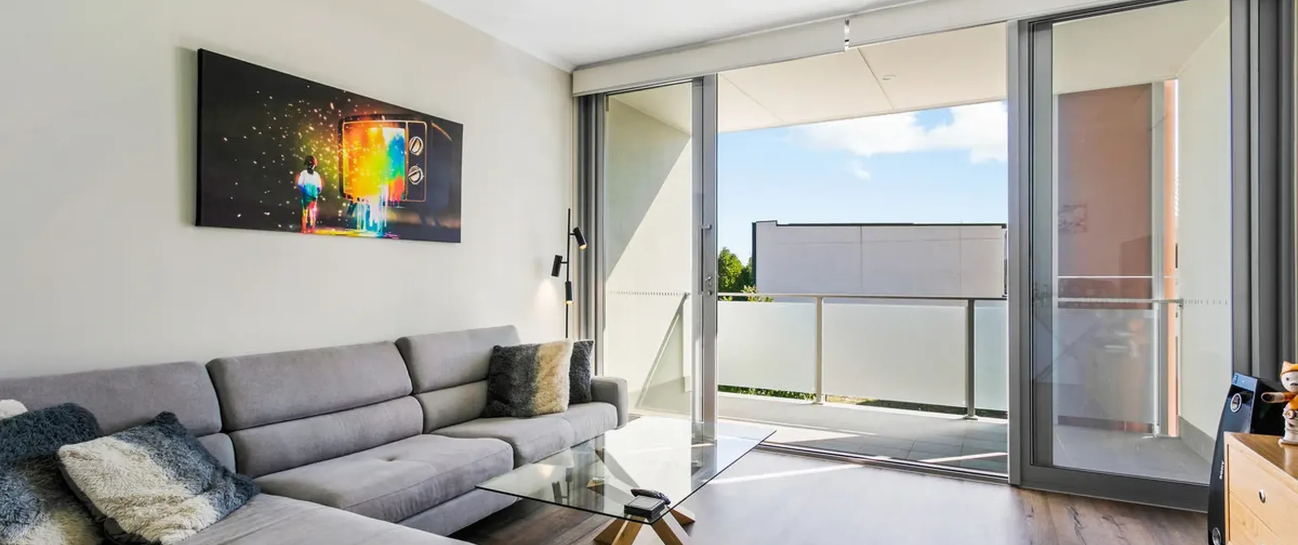 - Light-filled lounge with split system air conditioner, flowing seamlessly through glass sliding doors to the private balcony