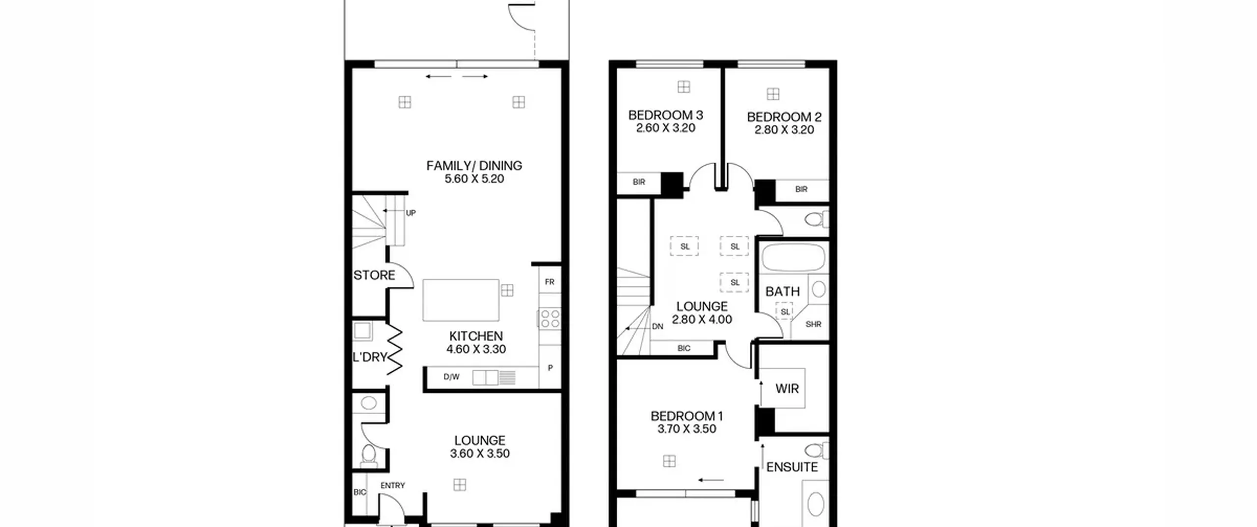 The ground floor houses the open-plan kitchen, meals and living area with seamless access via bi-fold doors to the private paved courtyard which boasts direct access into the rear double garage. The contemporary finishes continue in the timeless kitchen with quality appliances and ample storage plus there’s also a main-floor powder room, storeroom and a compact laundry.