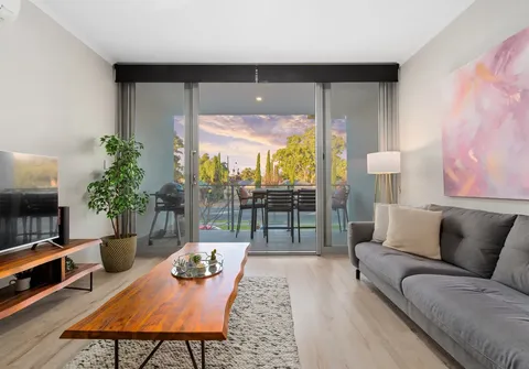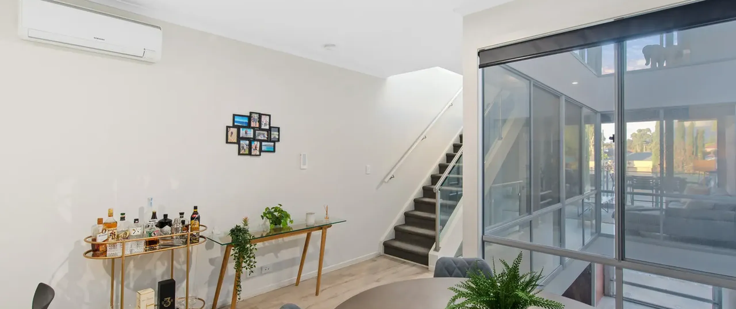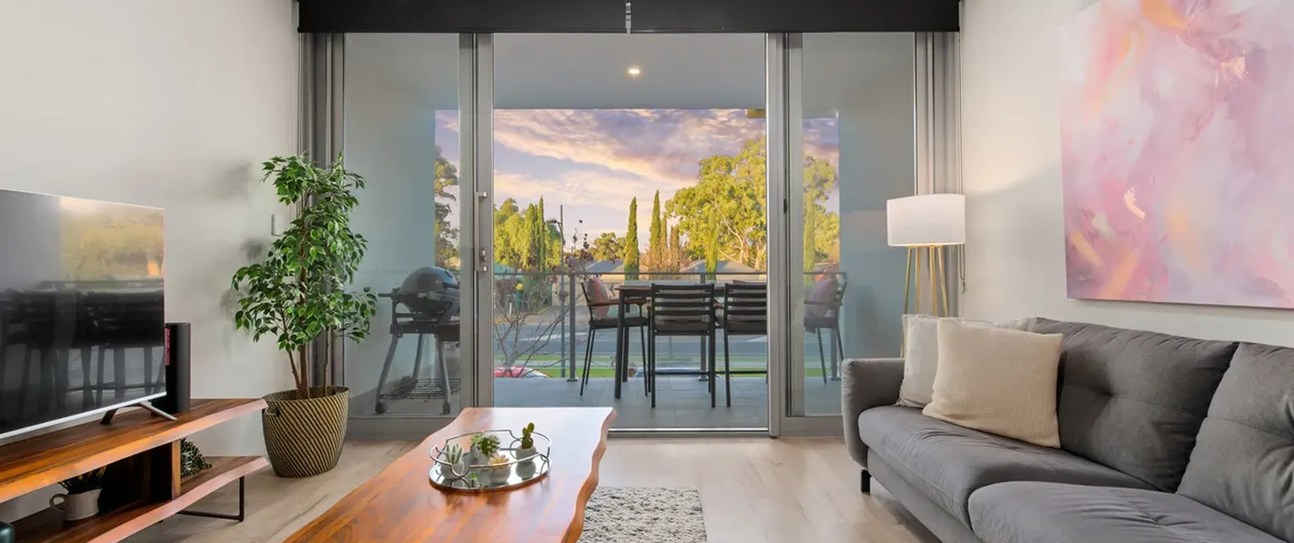 - Light-filled living area with split system air conditioner, flowing seamlessly through glass sliding doors to the private balcony
