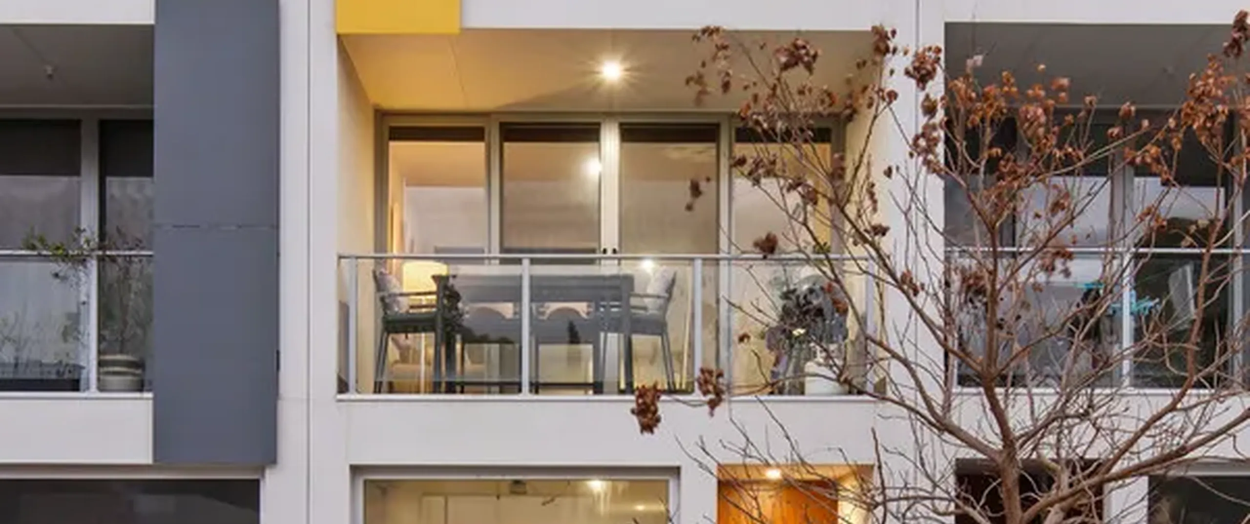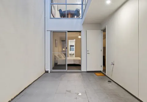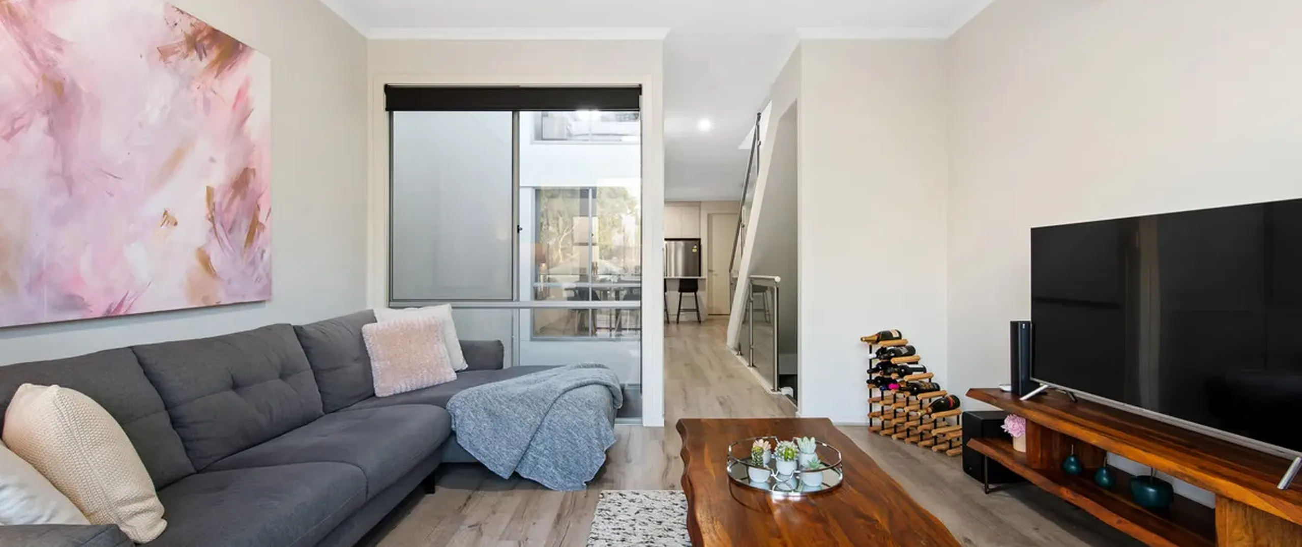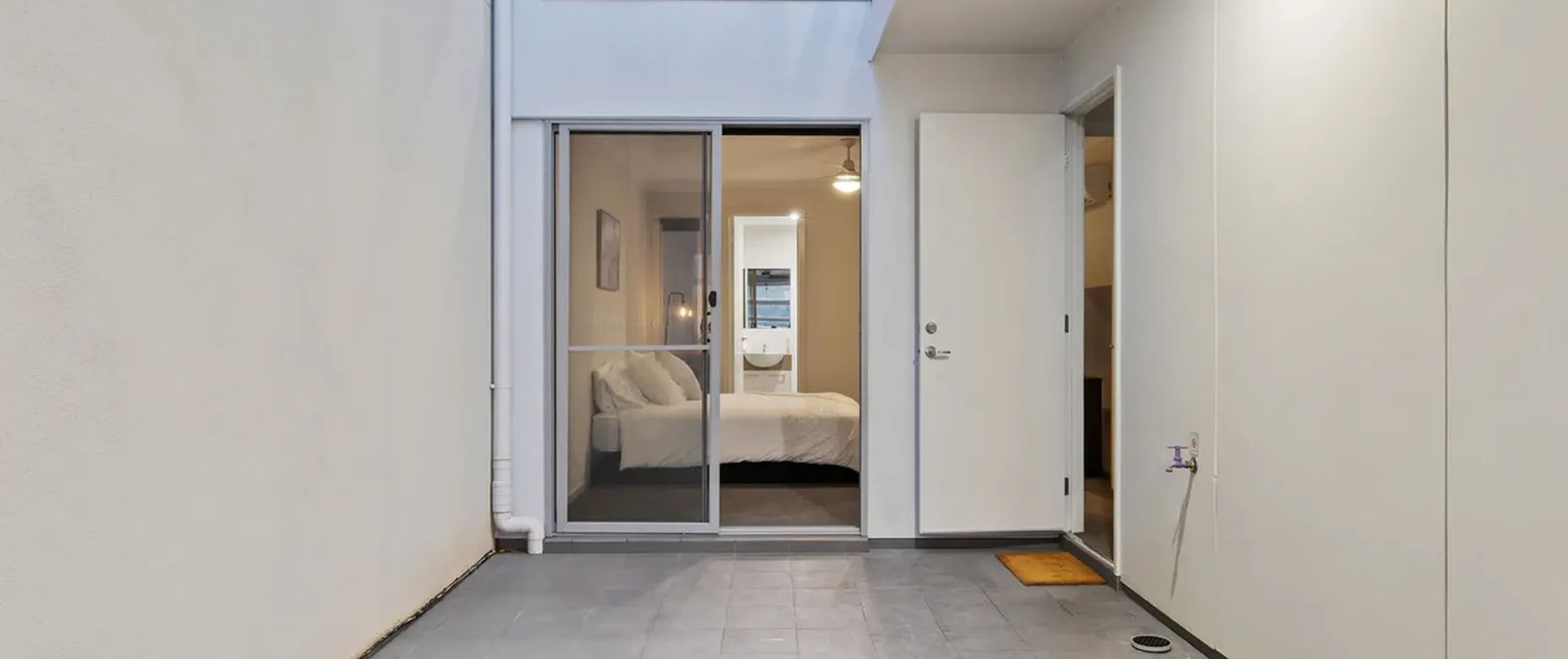 - Light-filled living area with split system air conditioner, flowing seamlessly through glass sliding doors to the private balcony