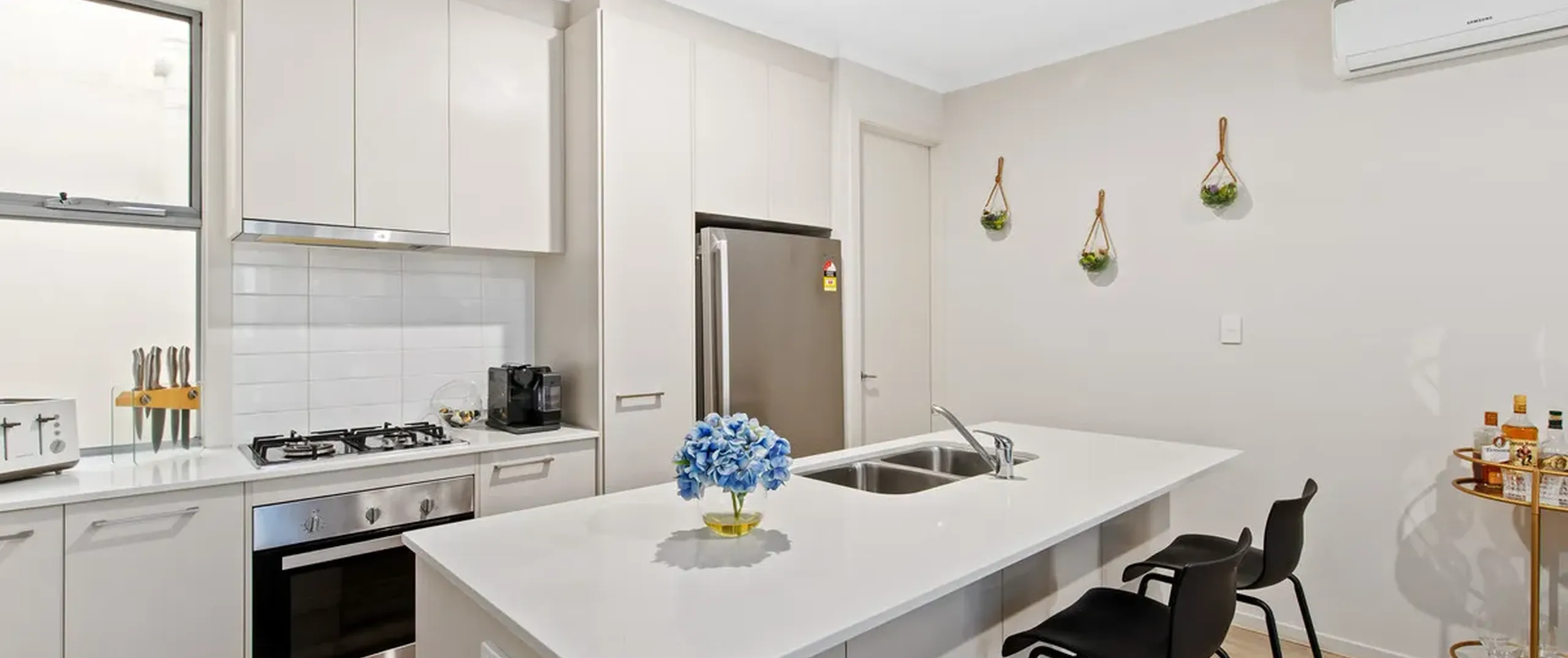 The kitchen is equipped with a gas cooktop and offers both functionality and style. The stone benchtops exude elegance, while the island bench provides ample workspace and a gathering point for friends and family.