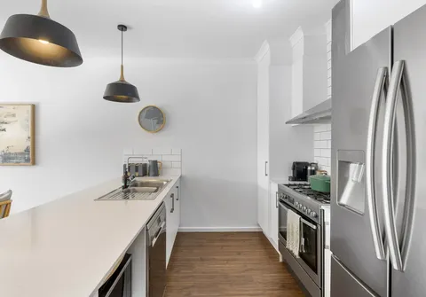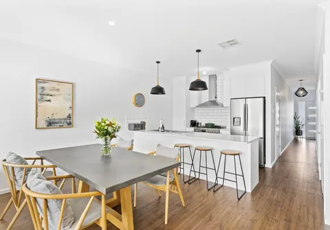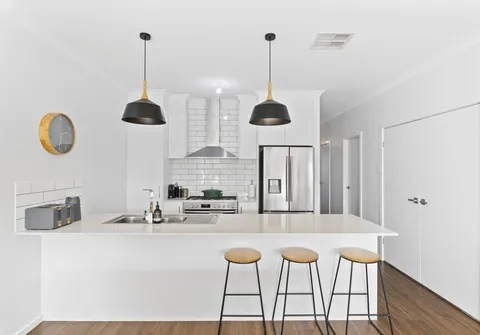 The heart of the home boasts a timeless, well-equipped kitchen, accentuated by elegant bulkhead and pendant lighting, gas cooking, a dishwasher, ample storage, and a breakfast bar. A modern ambience permeates, enhanced by natural colour tones and an abundance of natural light that floods in through the windows.