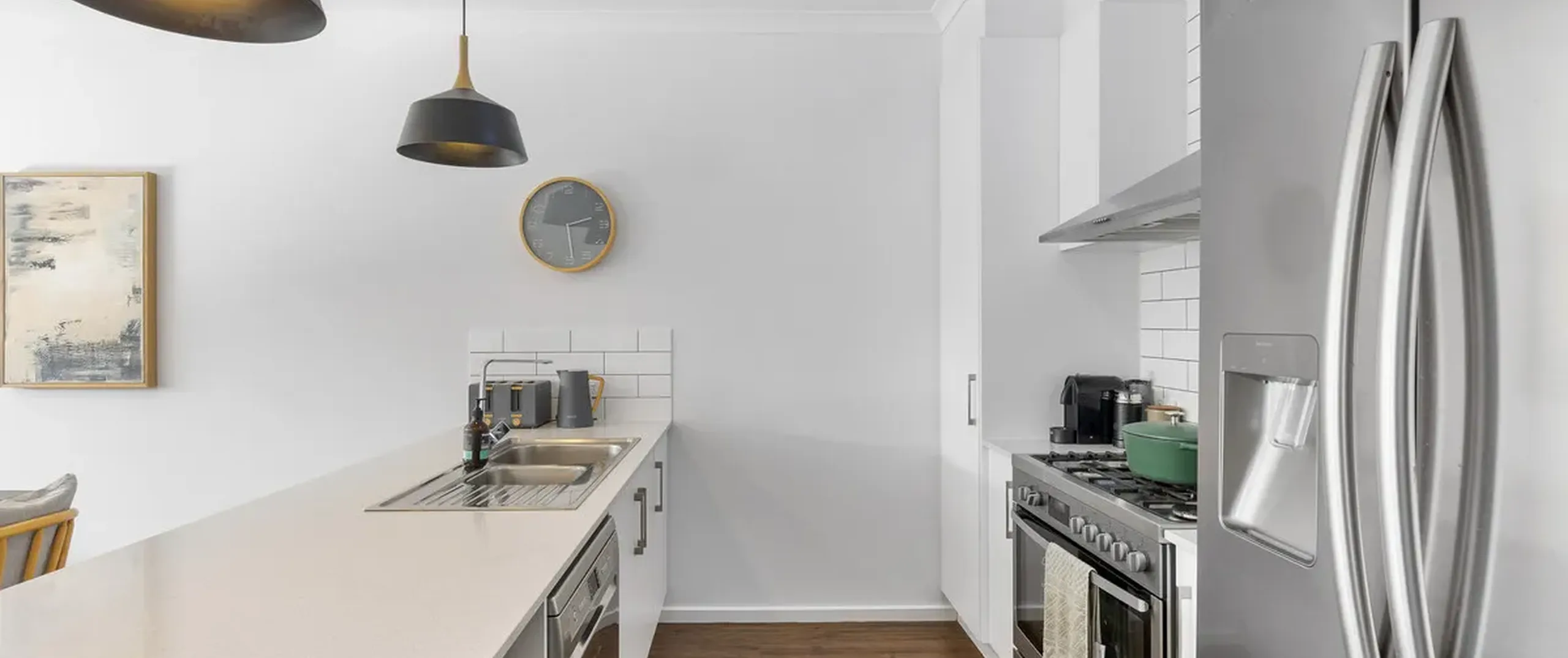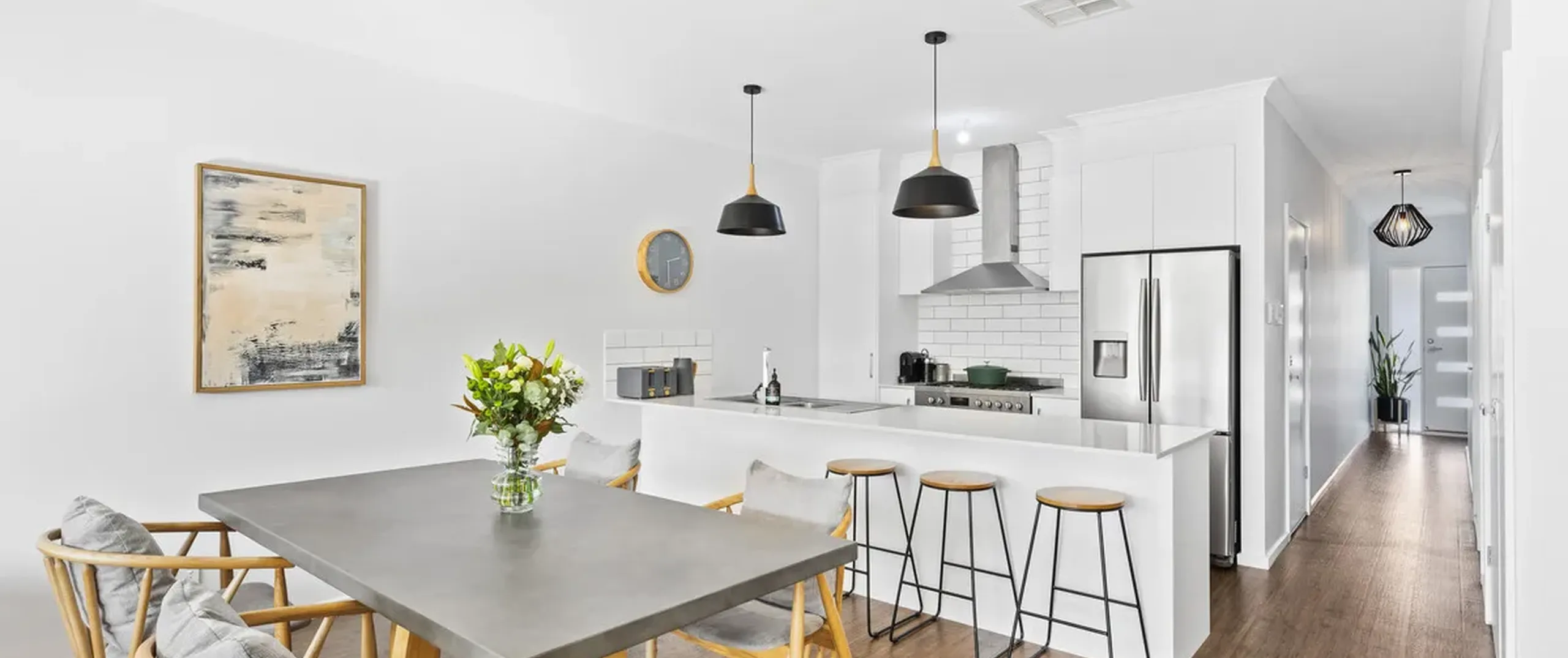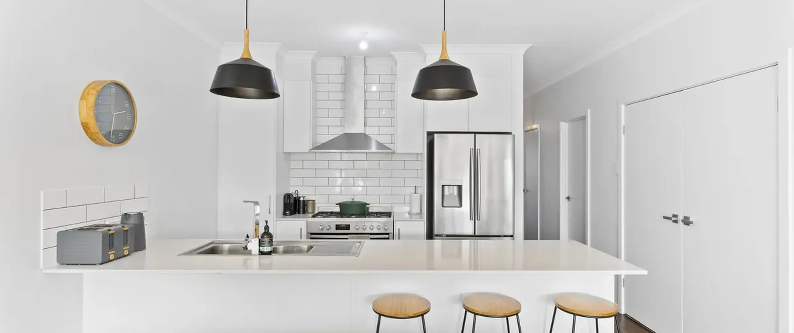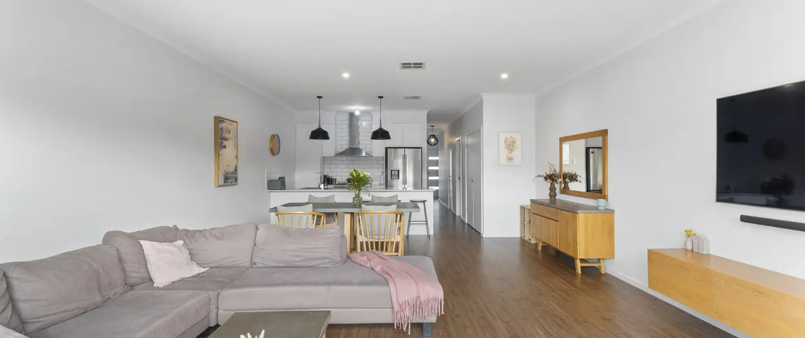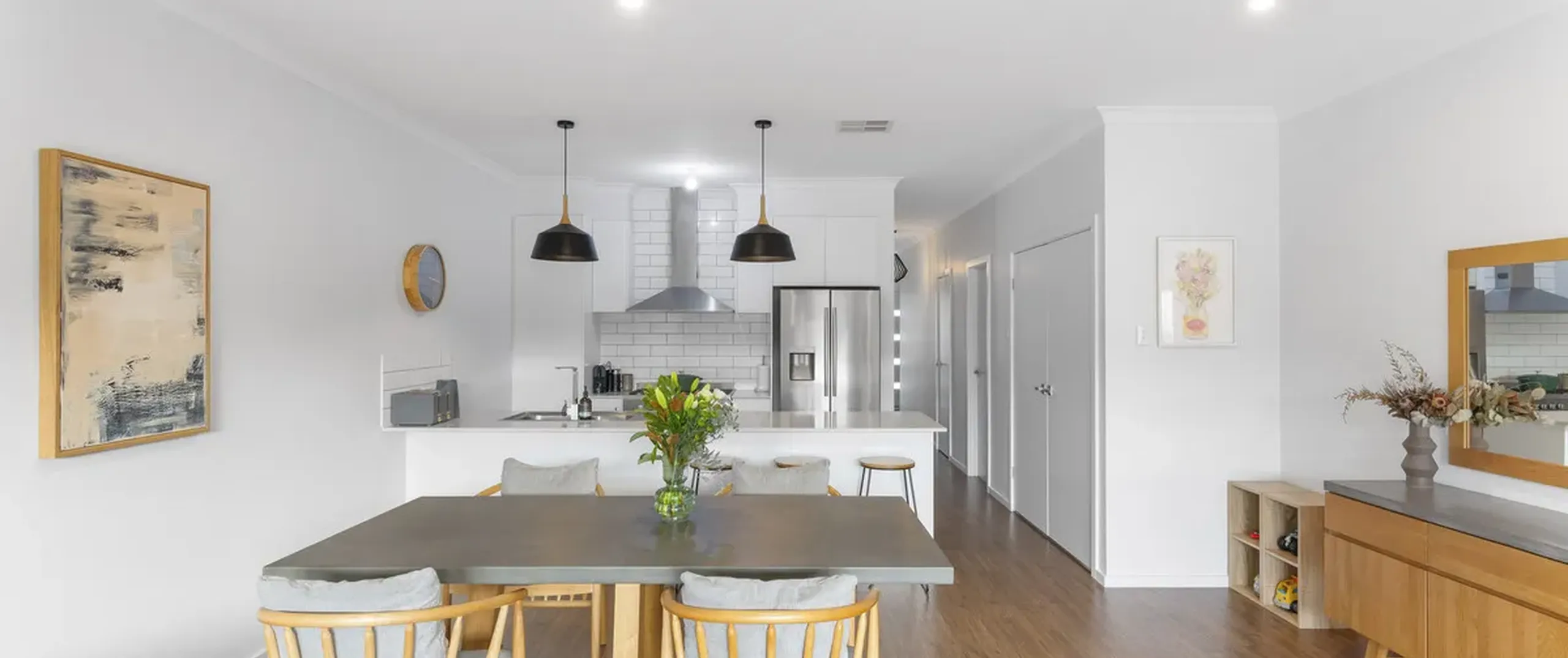 - Stylish kitchen with a suite of stainless-steel appliances including dishwasher, 900mm oven and gas cooktop, pantry, sweeping bench top with breakfast bar and feature pendant lighting