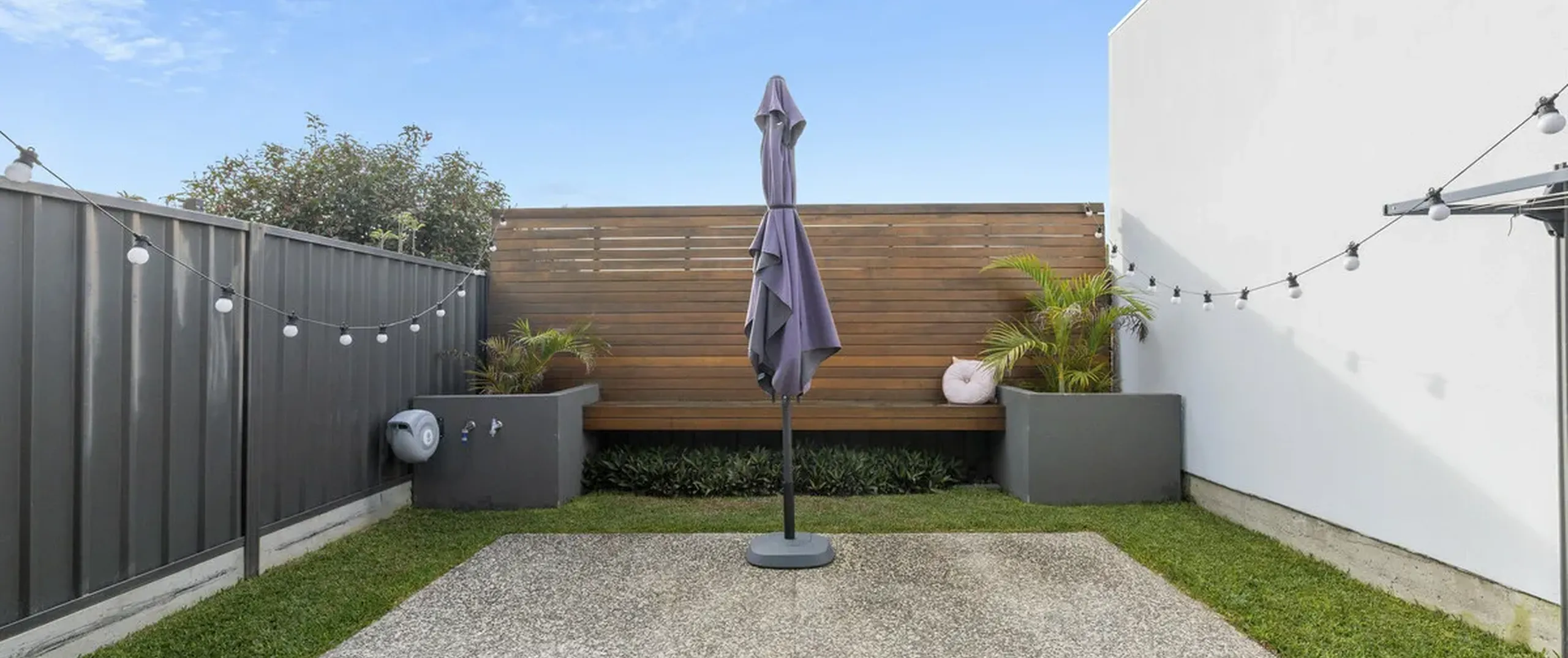 - Charming private courtyard framed by well-manicured gardens and timber bench