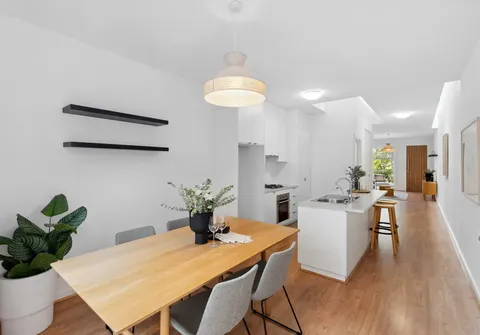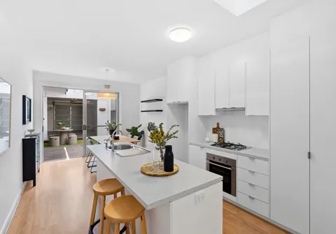 The ground floor unfolds a sun-soaked kitchen, meals, and lounge area, seamlessly connecting to a private courtyard with direct access to the rear carport. The kitchen, adorned with timeless contemporary finishes, features quality appliances and ample storage, complemented by a main-floor powder room and a European laundry.