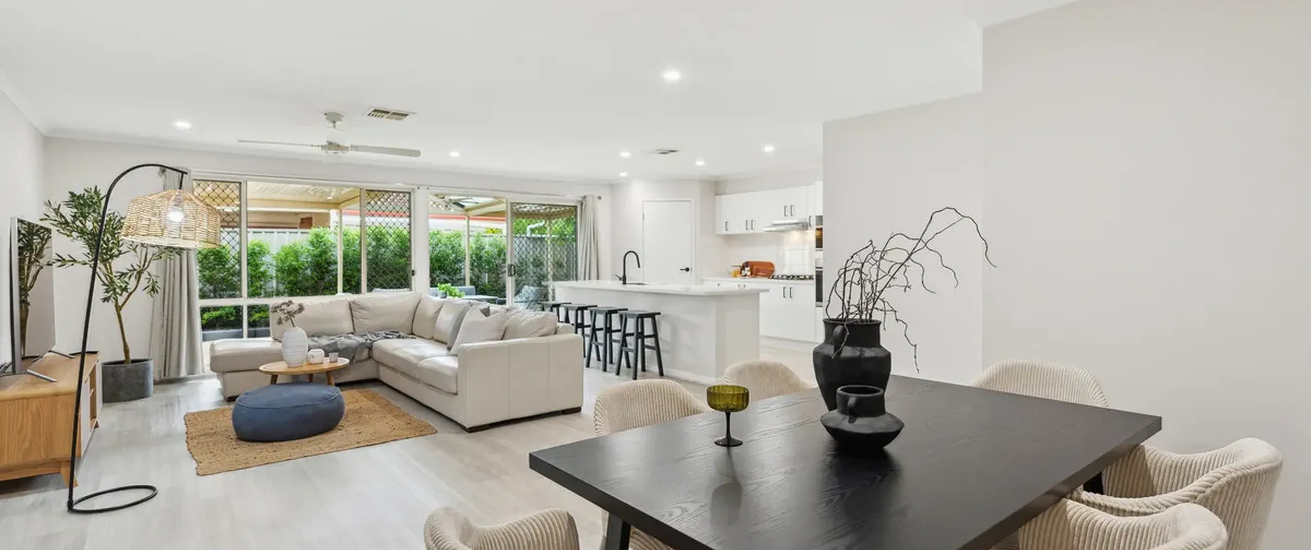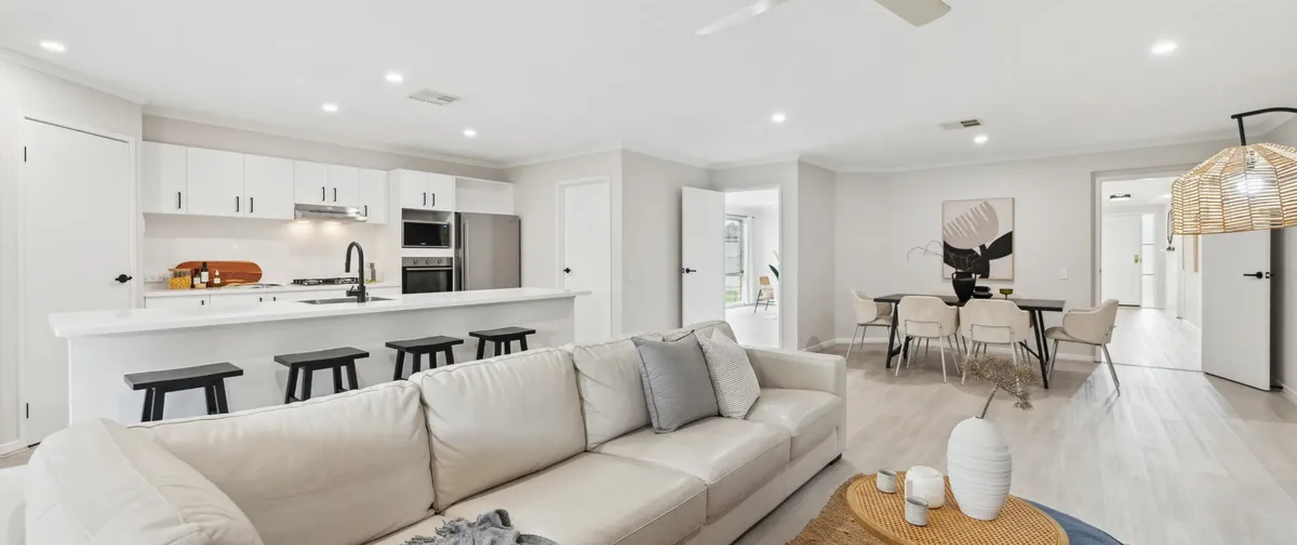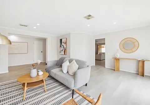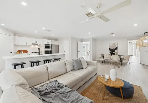 As you enter, the recessed ceiling entryway invites you into a home with freshly painted walls, updated neutral flooring, on-trend lighting, and energy-efficient LED downlights. From here, unwind in the spacious family room or transition into the heart of the home— the open living, dining, and kitchen area.