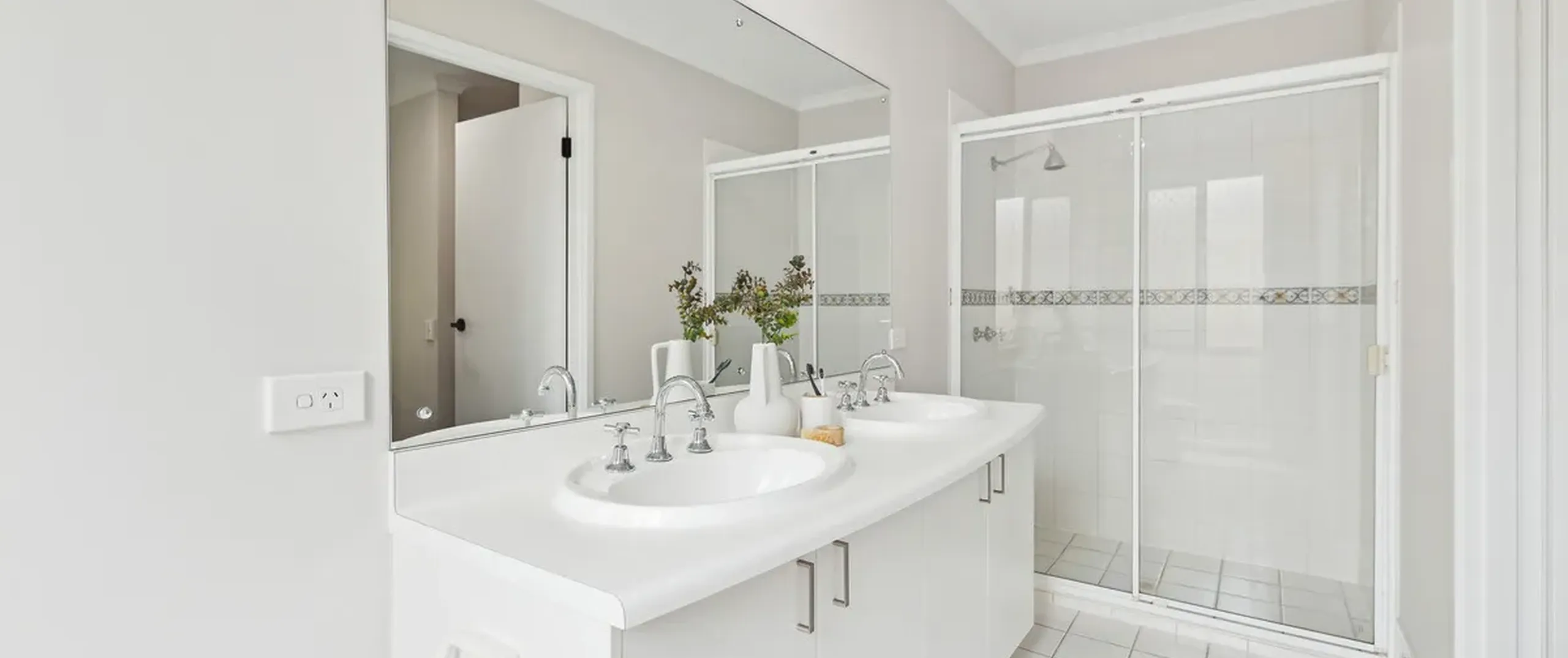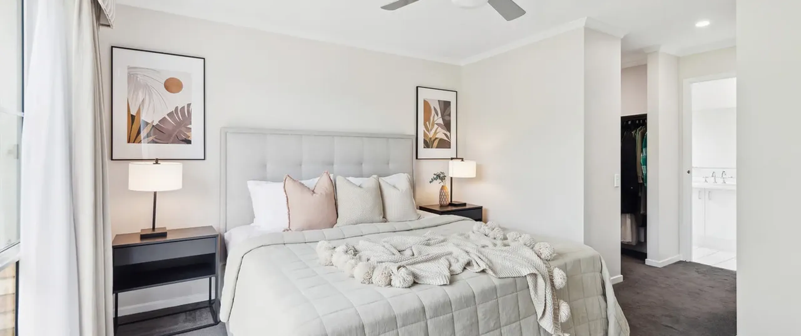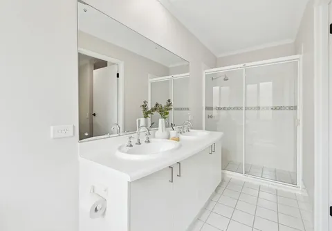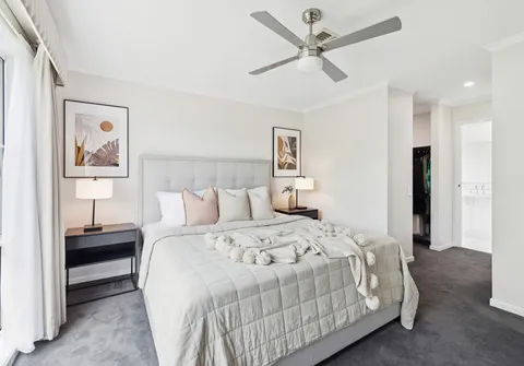 - Master bedroom with plush carpet, ceiling fan, dual walk-in robes, and ensuite with dual basins