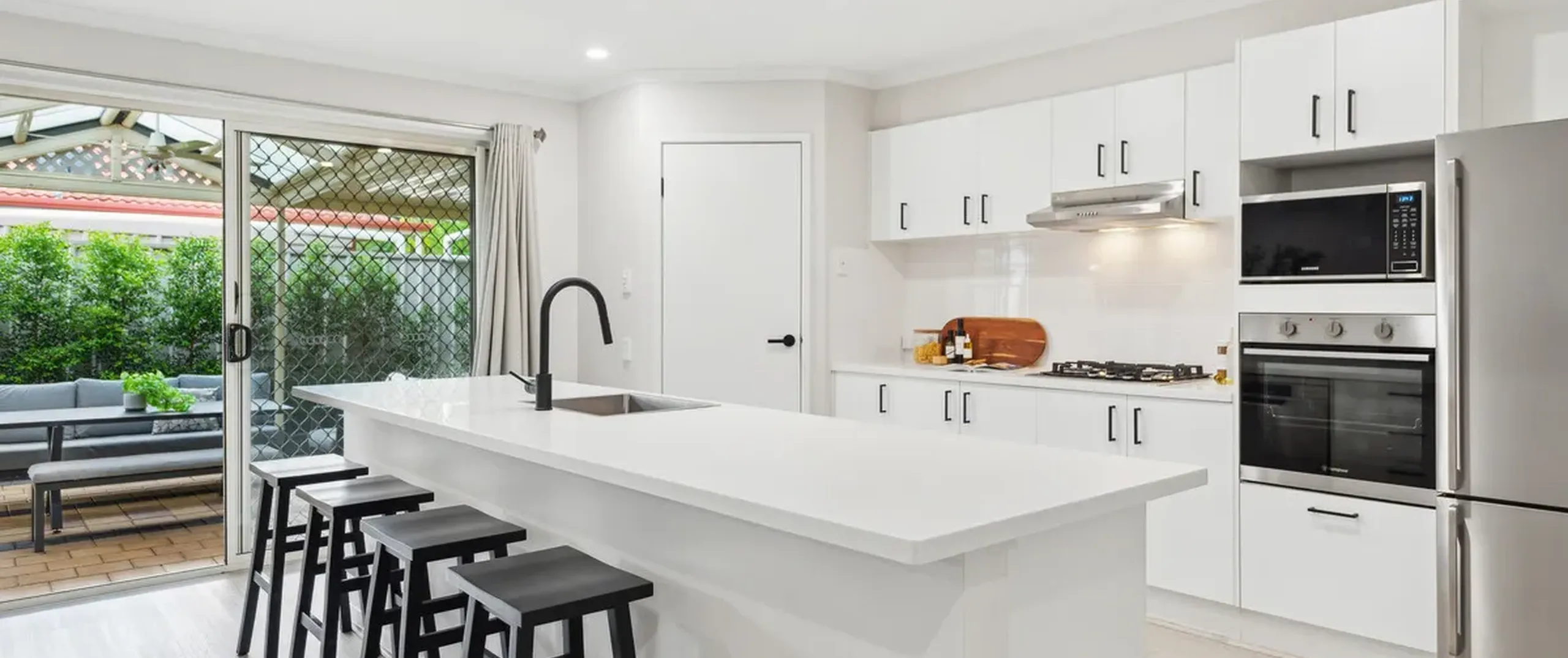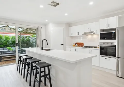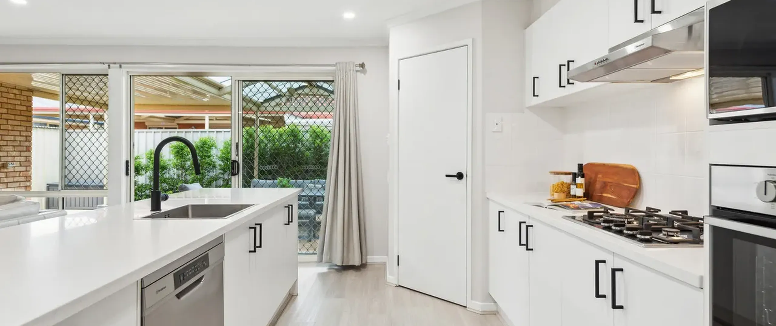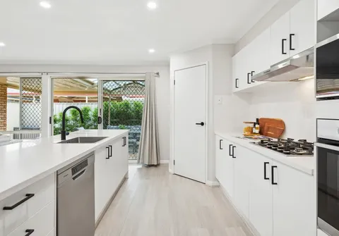 The updated kitchen boasts sleek white benchtops, stylish cabinetry with modern hardware, a dishwasher, gas cooktop, built-in oven, inset sink, pantry, and a breakfast bar. Natural light flows in from the outdoor entertaining area, creating a warm and inviting space for daily living and relaxation.