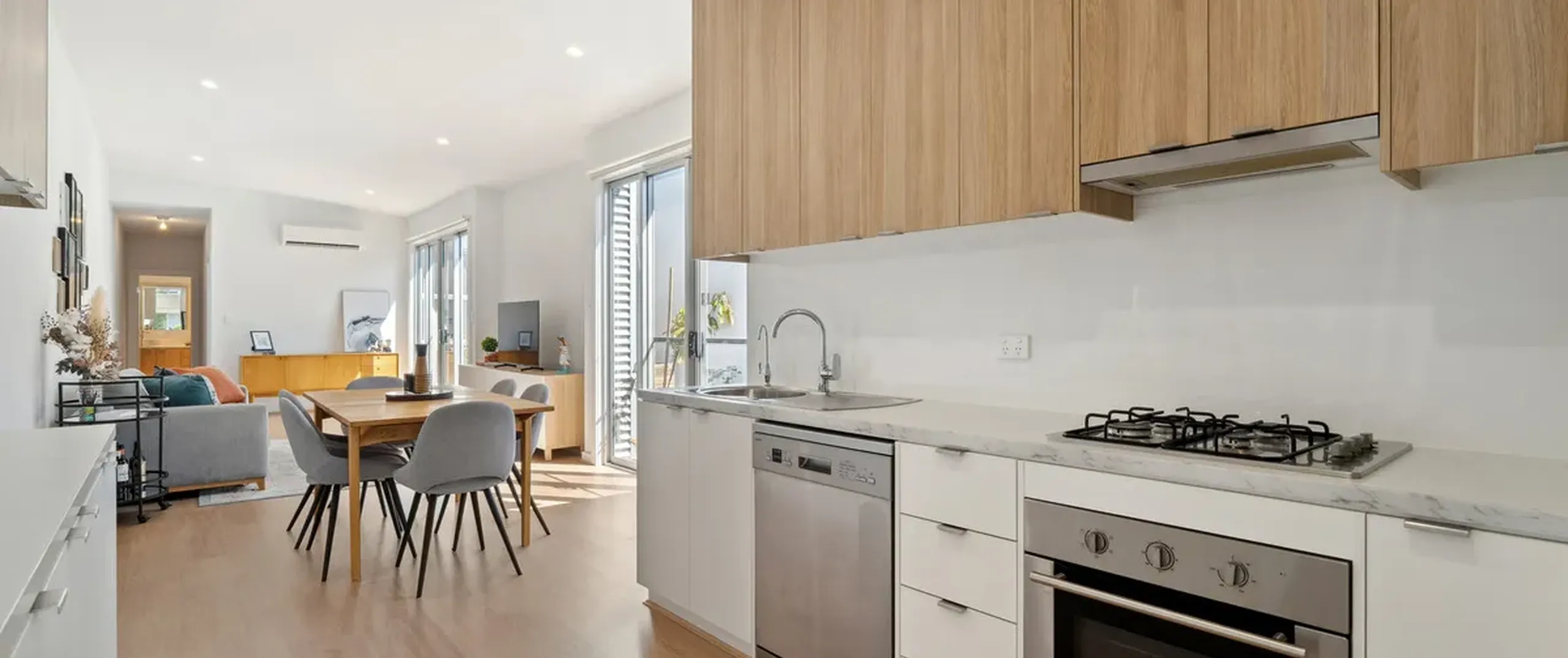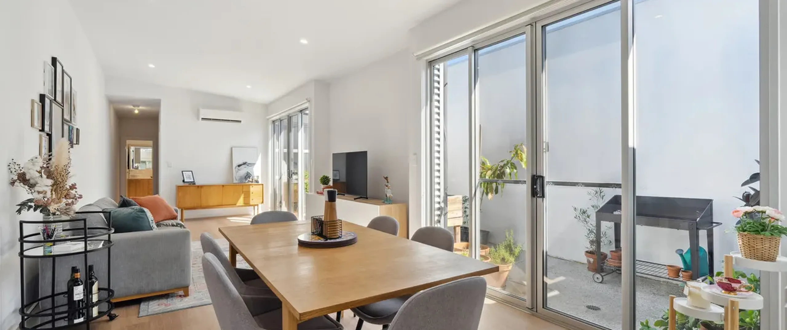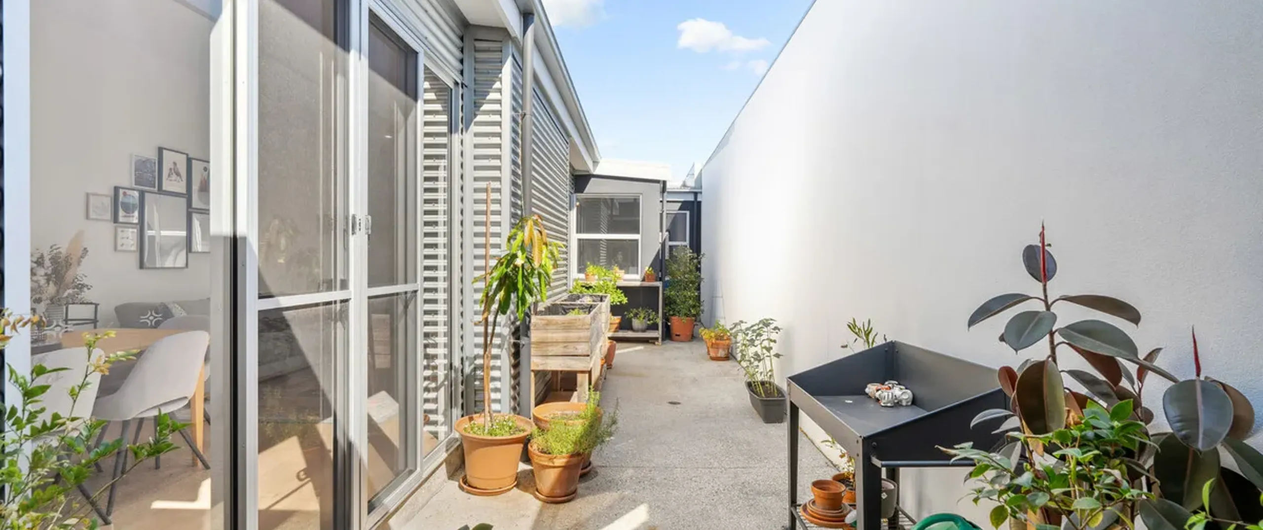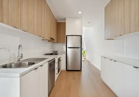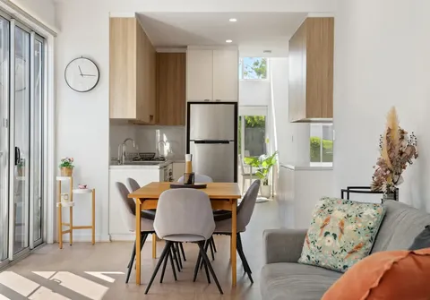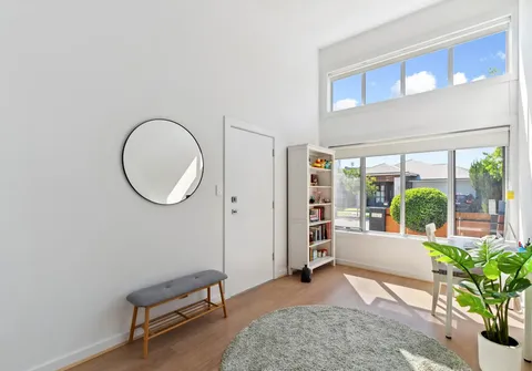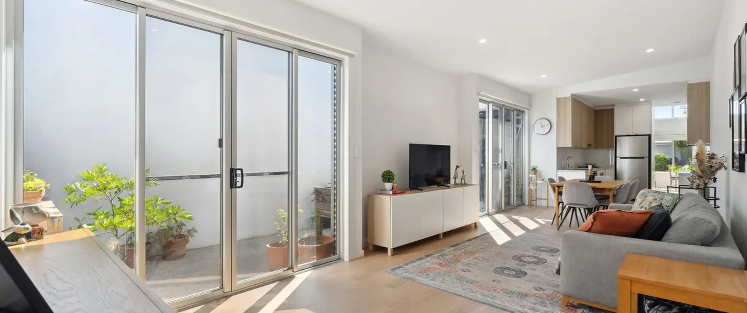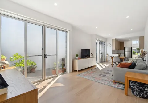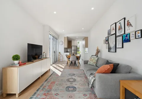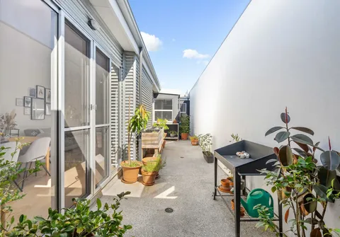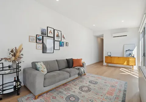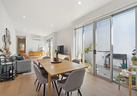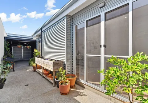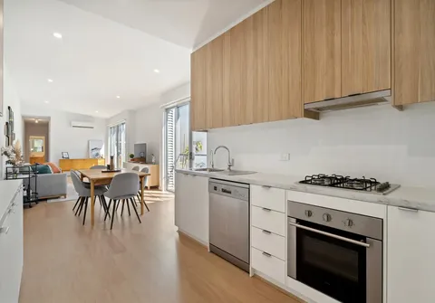 Upon entering, you'll find a spacious lounge or study bathed in natural light, with a European laundry discreetly tucked behind sleek white doors. Just around the corner, the open-plan kitchen, dining, and living space offers the perfect setting for both relaxing and entertaining. A split-system air conditioner ensures comfort all year round, while the contemporary kitchen impresses with stainless steel appliances, on-trend cabinetry, elegant benchtops, and ample storage. Sliding glass doors open seamlessly to a private, low-maintenance courtyard, complete with planter boxes - the perfect spot to bask in the northern sun or tend to your herb garden.