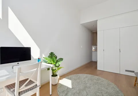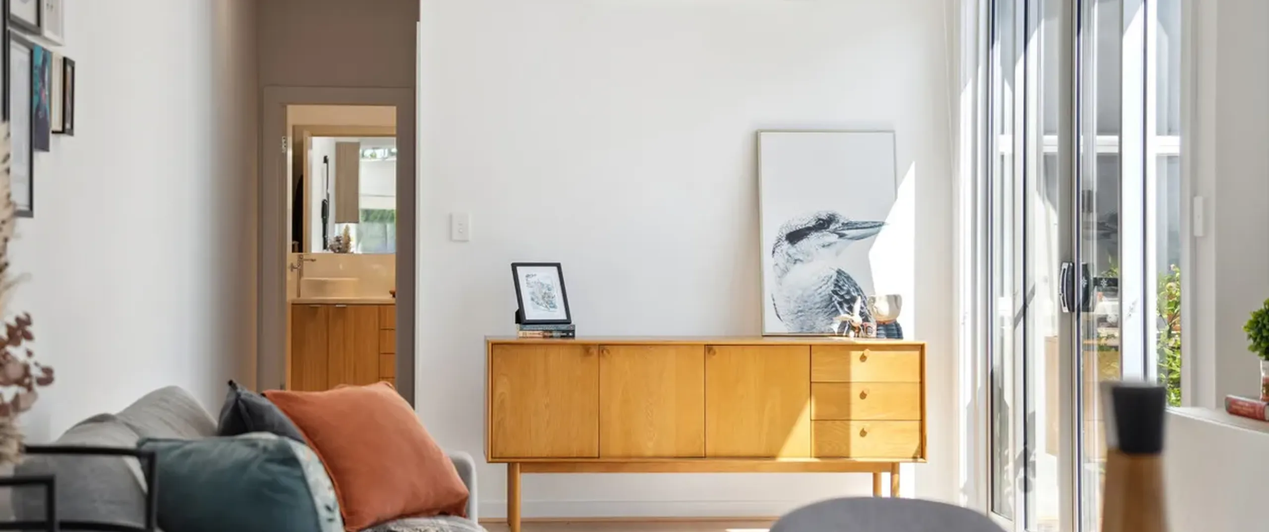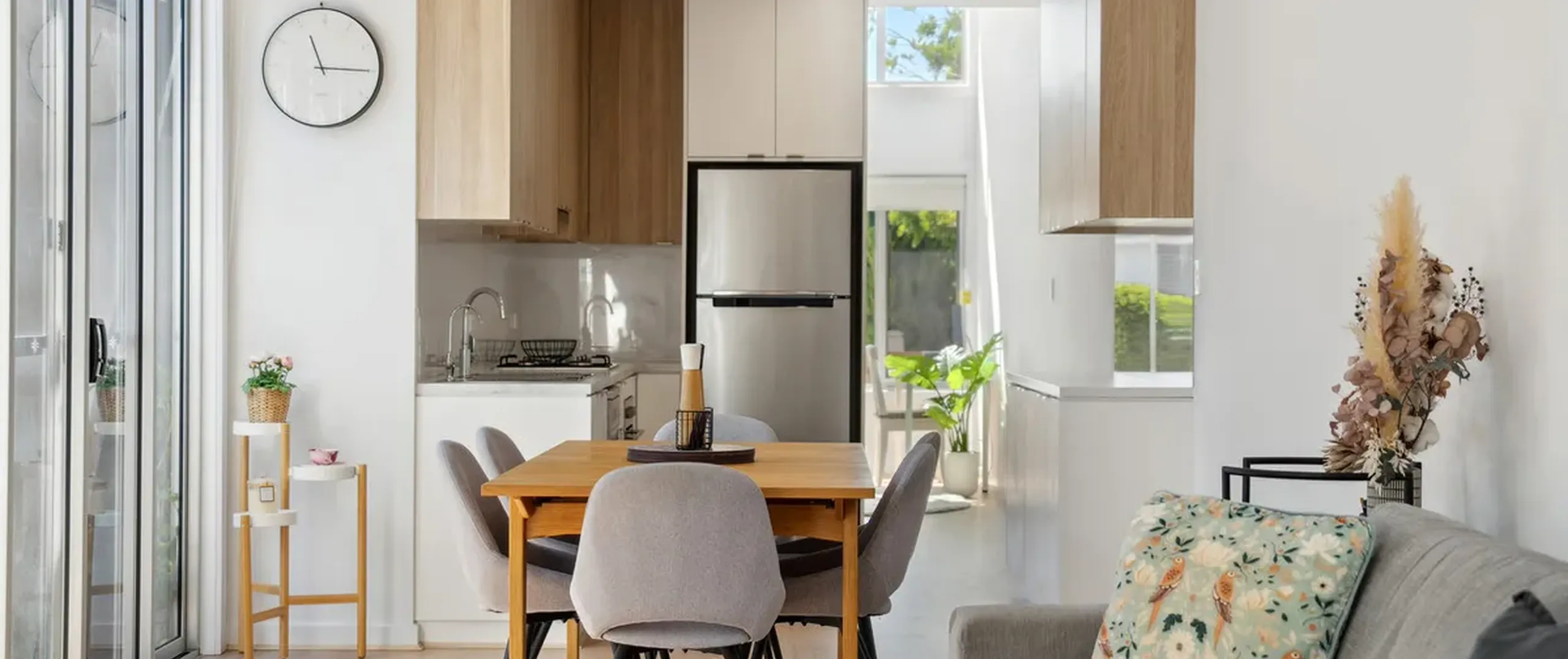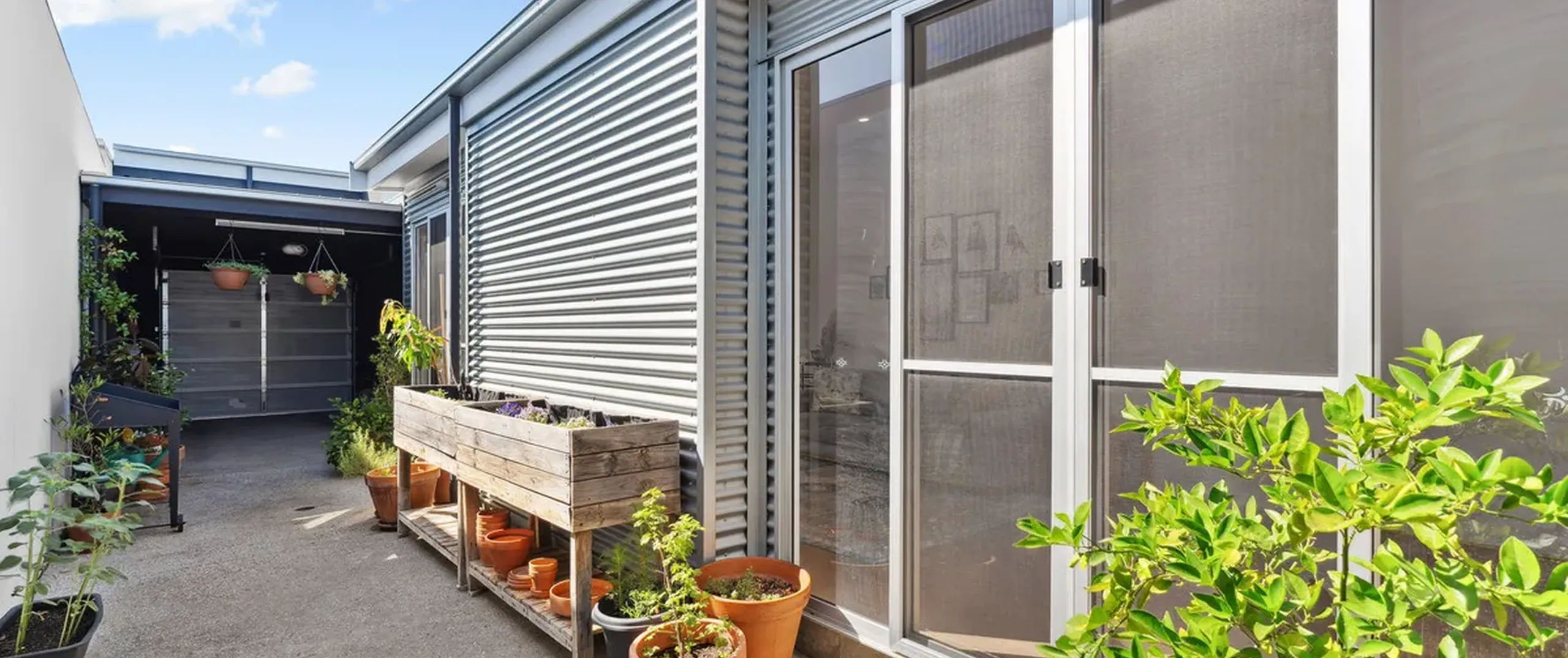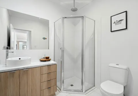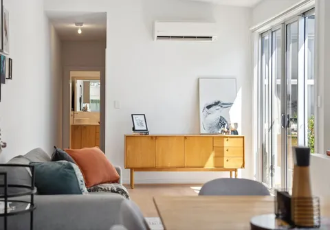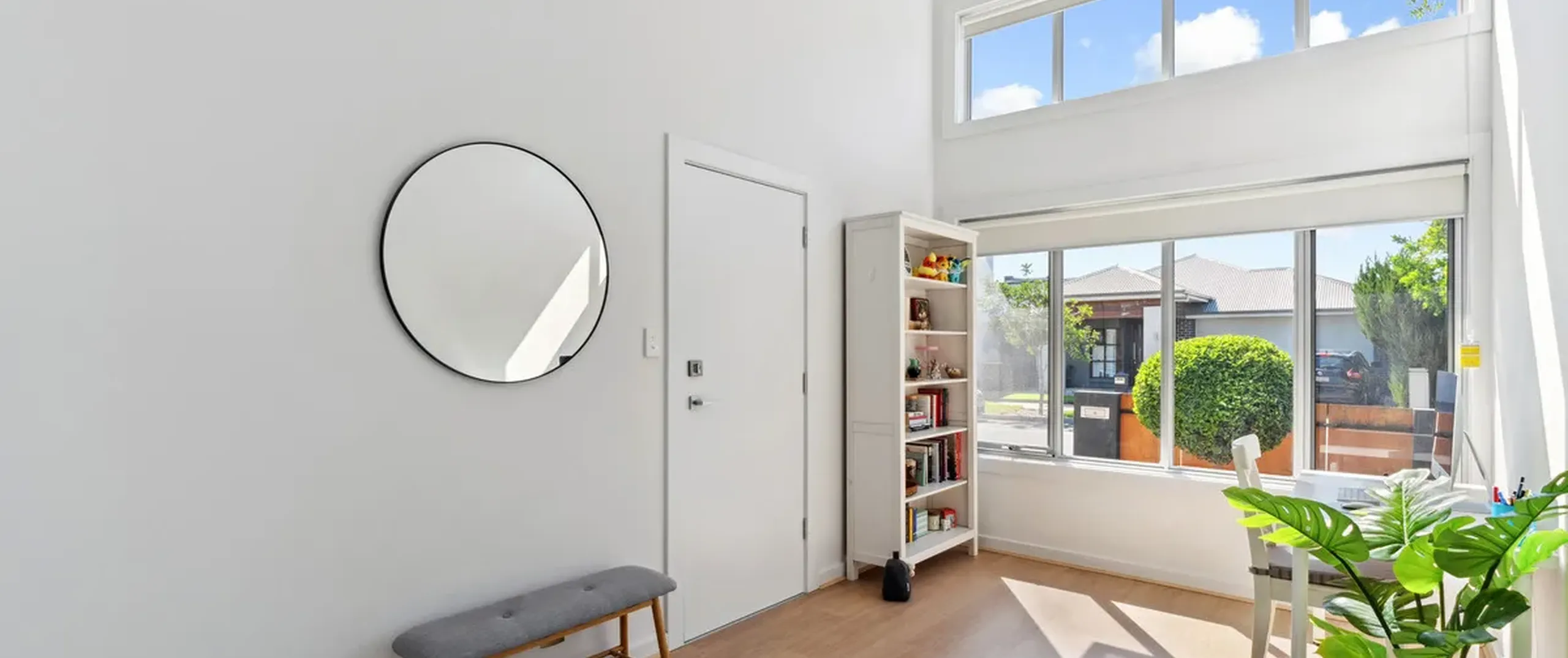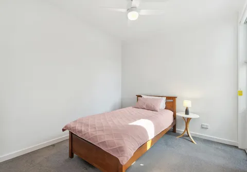 Upon entering, you'll find a spacious lounge or study bathed in natural light, with a European laundry discreetly tucked behind sleek white doors. Just around the corner, the open-plan kitchen, dining, and living space offers the perfect setting for both relaxing and entertaining. A split-system air conditioner ensures comfort all year round, while the contemporary kitchen impresses with stainless steel appliances, on-trend cabinetry, elegant benchtops, and ample storage. Sliding glass doors open seamlessly to a private, low-maintenance courtyard, complete with planter boxes - the perfect spot to bask in the northern sun or tend to your herb garden.