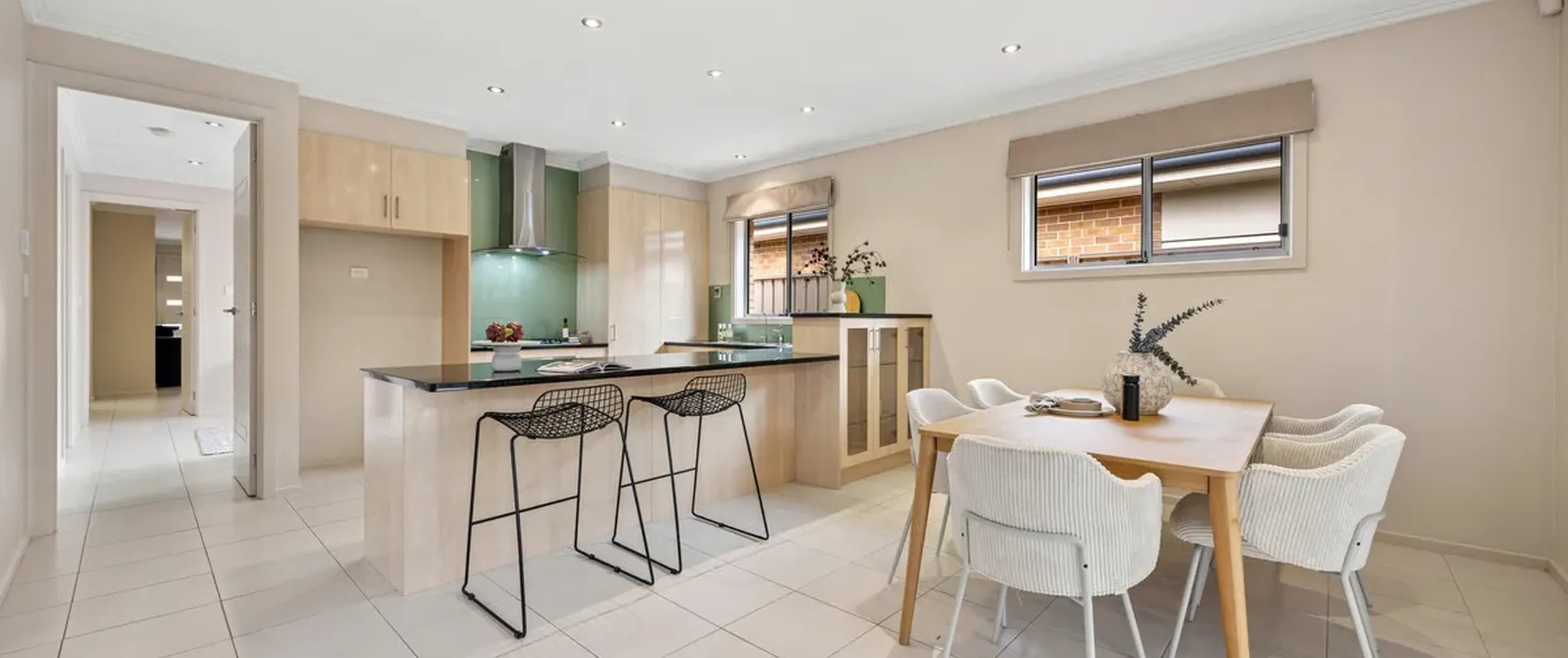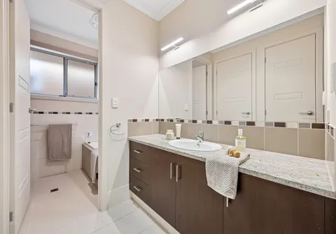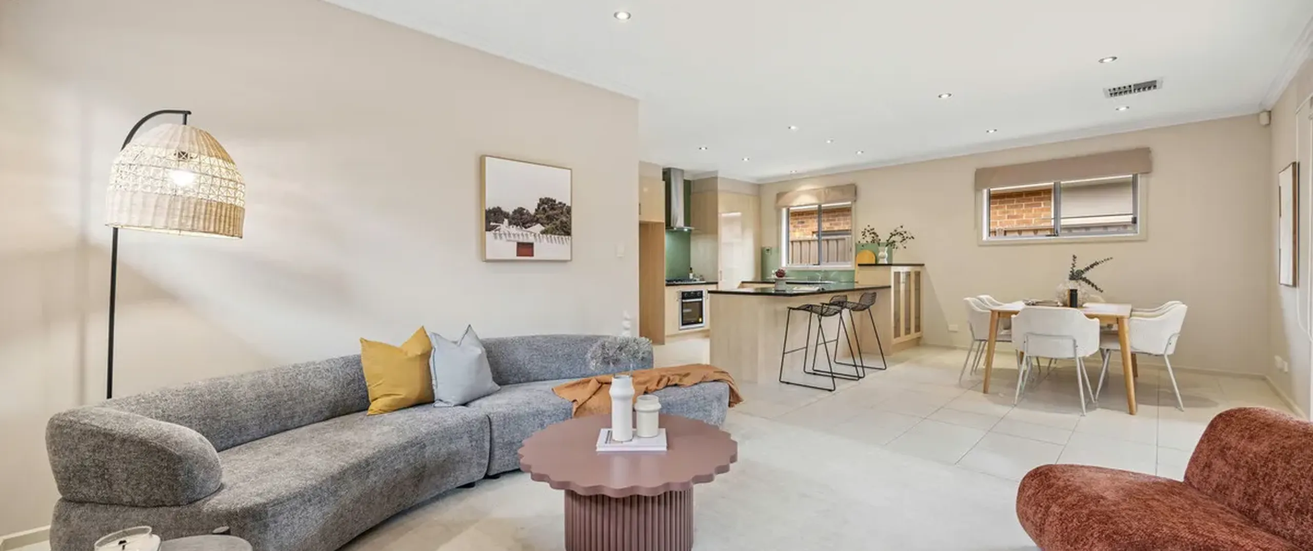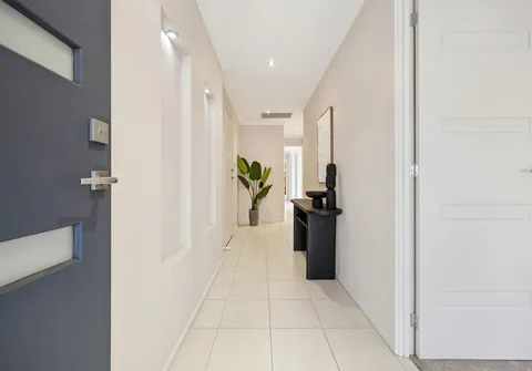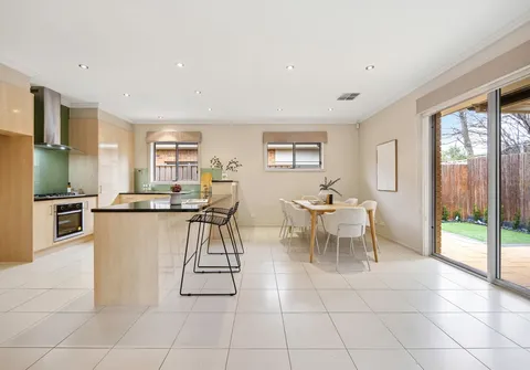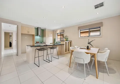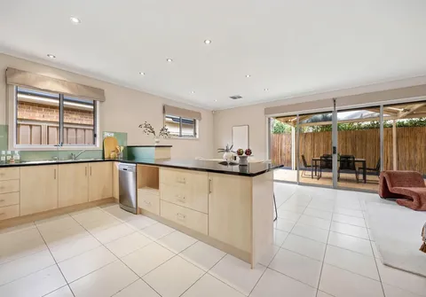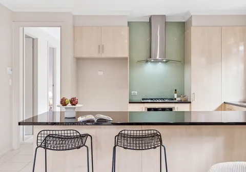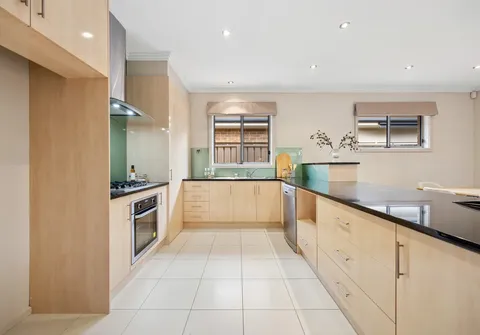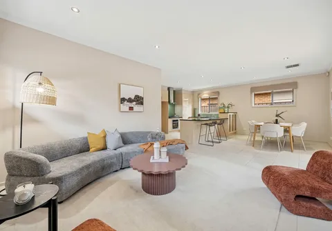 With high ceilings and abundant natural light pouring in through multiple large windows, the home showcases a calming palette with stylish accents throughout. At its heart, a spacious open-plan kitchen, living and dining area provides the perfect setting for entertaining or relaxed family evenings. The kitchen is both functional and elegant, featuring ample bench space, quality appliances, and premium contemporary finishes suited to modern living.