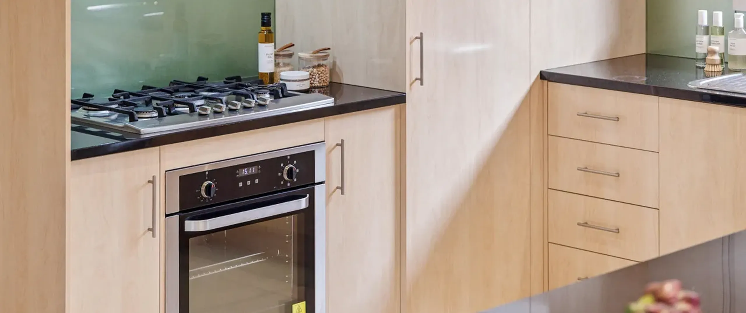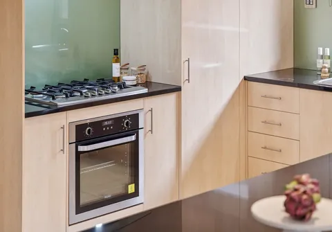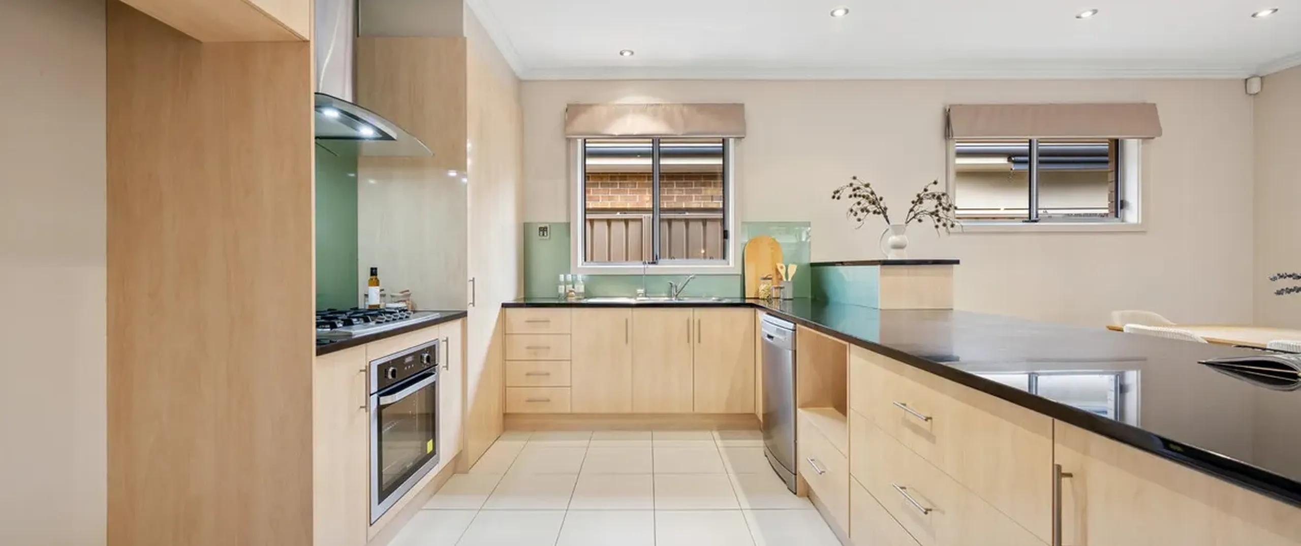 - Large kitchen with quality stainless steel appliances including Haier oven, gas cooktop with new rangehood, dishwasher, glass splashback, soft close drawers, generous cupboard and bench space including a display cupboard, sweeping granite benchtops and a breakfast bar