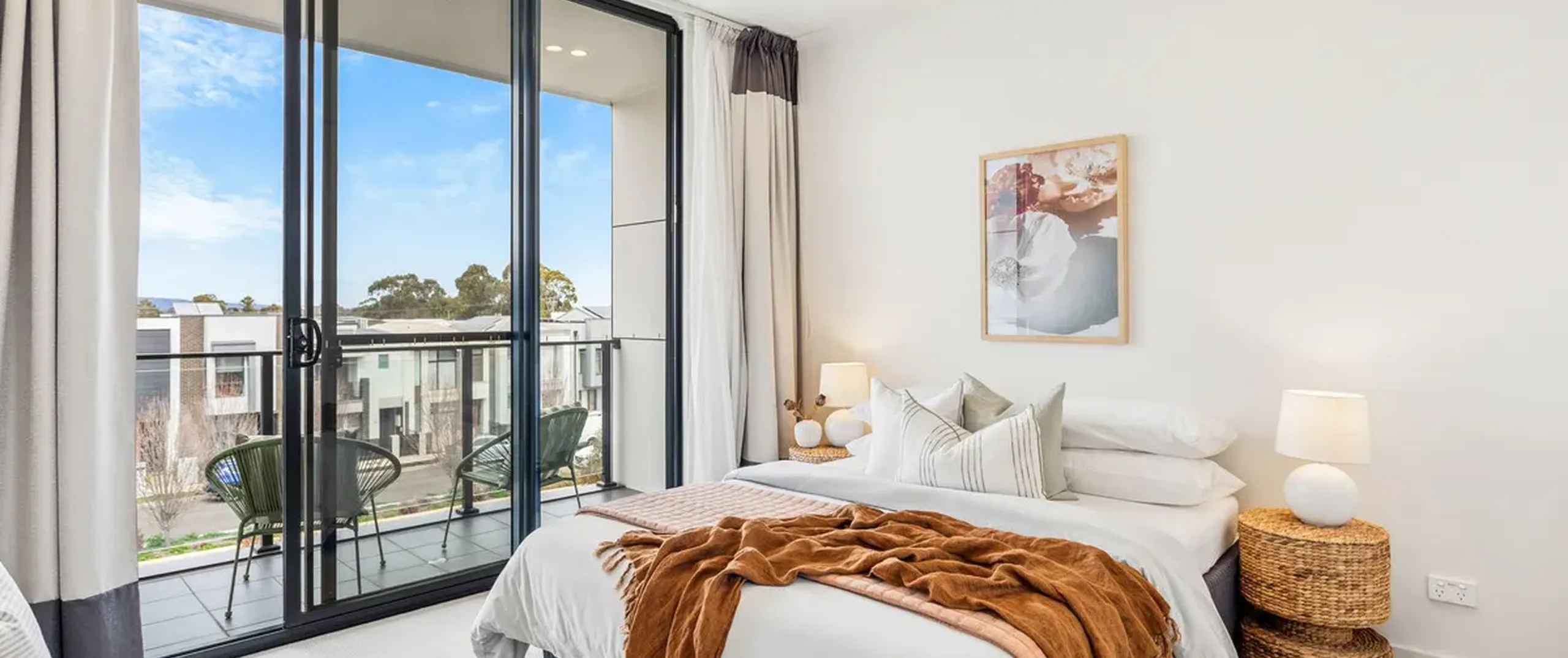 - Luxe and light-filled carpeted master bedroom with built-in robe and balcony