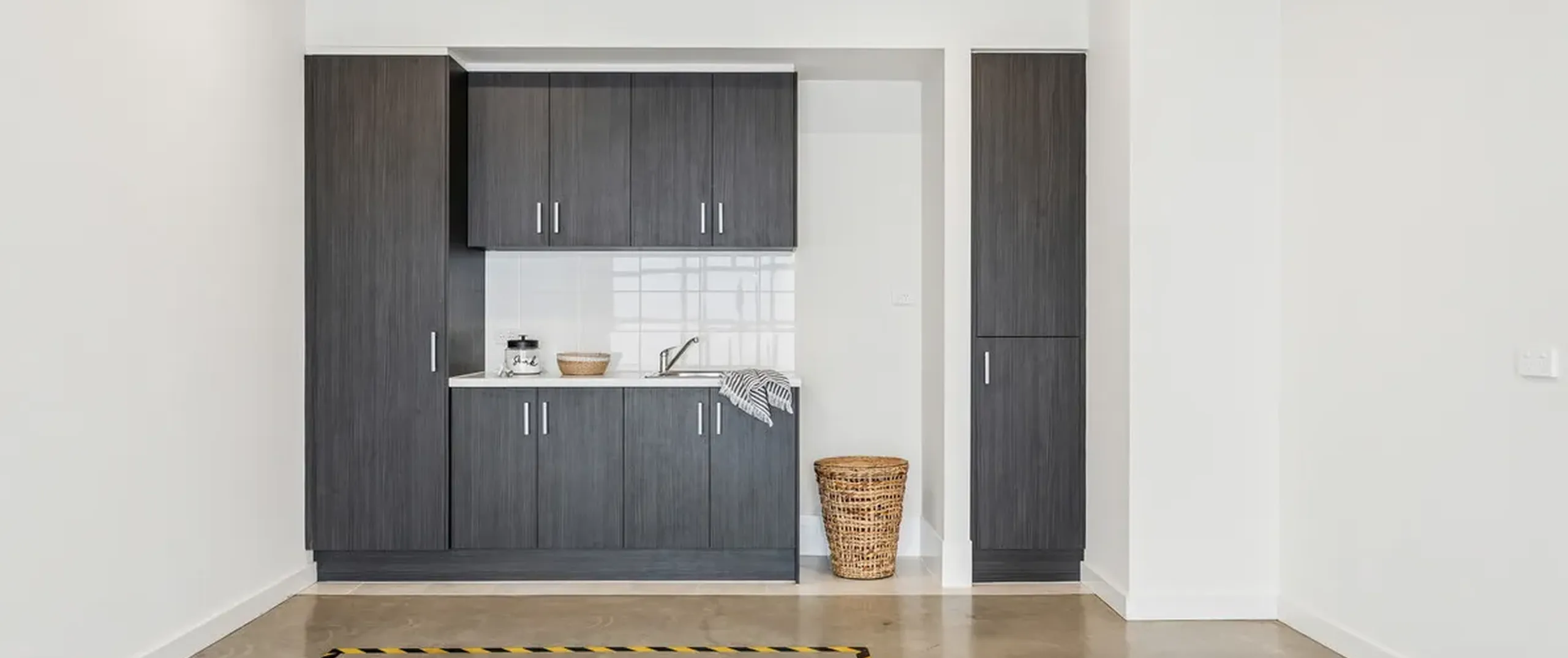 - Garage with polished concrete flooring, built-in laundry cabinetry and storage