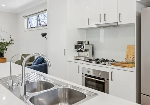 The open plan kitchen is a highlight, showcasing stone benchtops, stainless steel appliances, Puratap and dishwasher, making it both practical and stylish. Flowing living areas and a private courtyard create a welcoming environment for both daily life and entertaining.