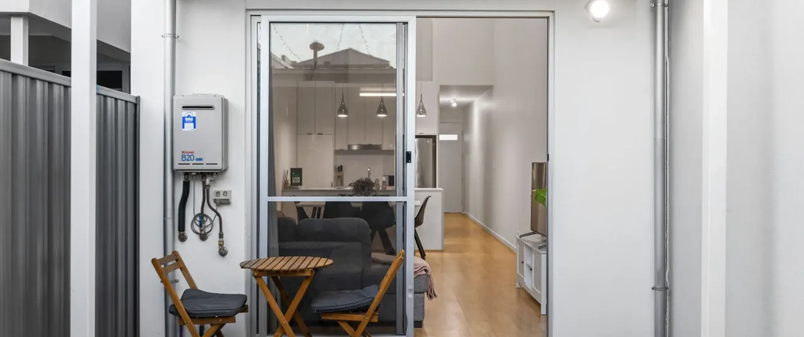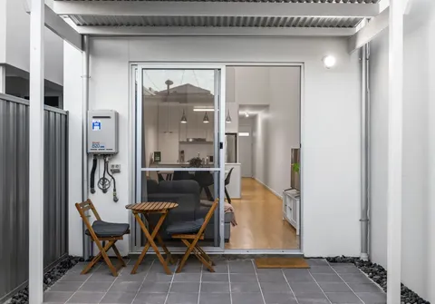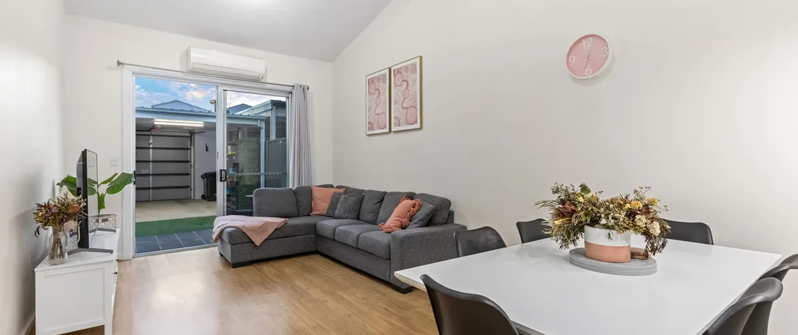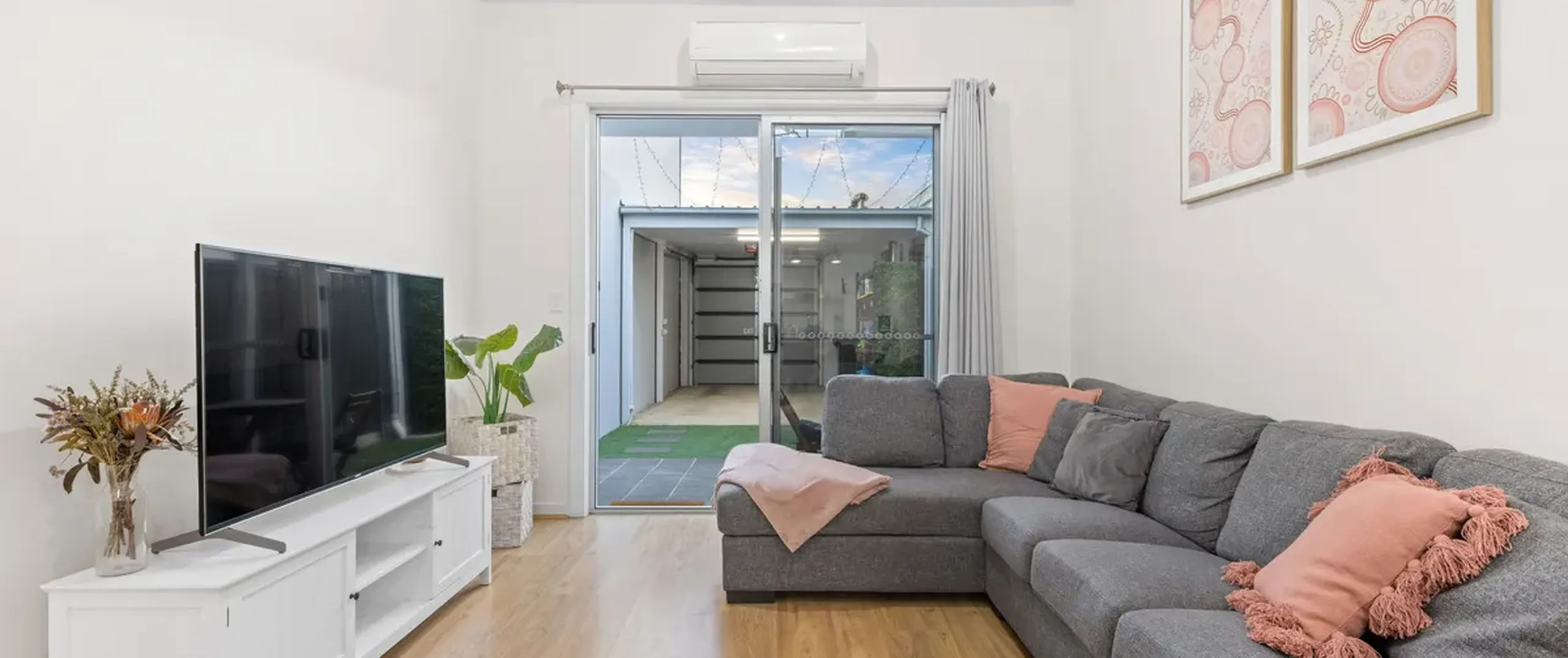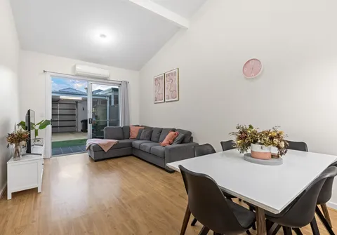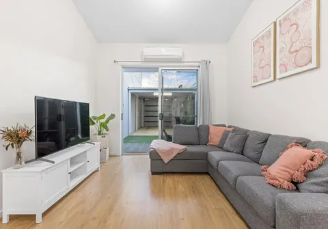 - Light-filled open plan living and dining area with air-conditioner and sliding door access to the courtyard