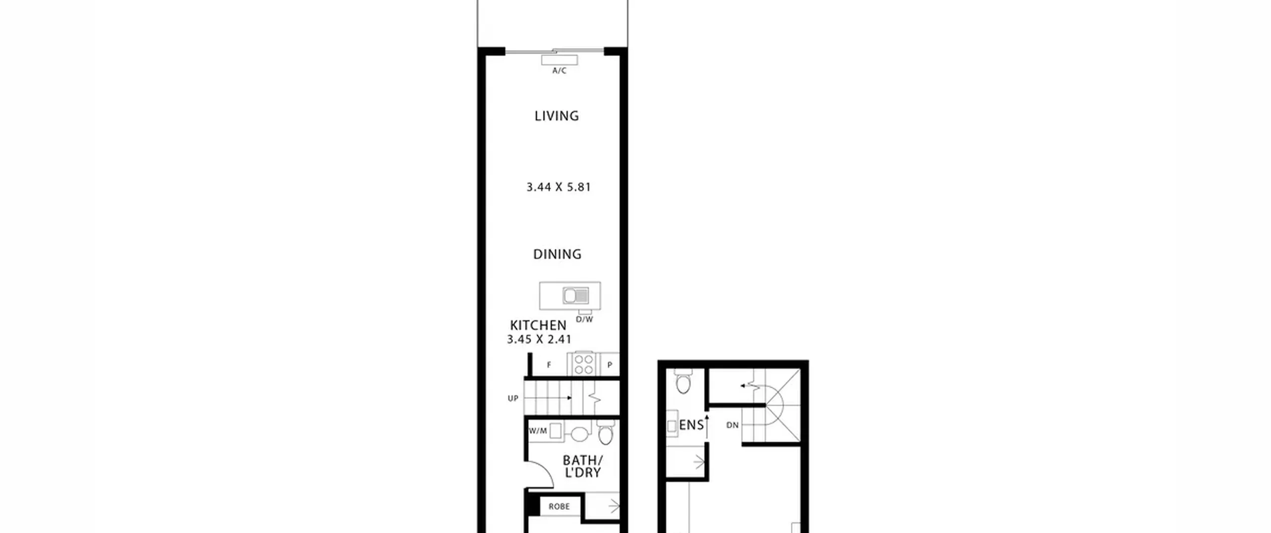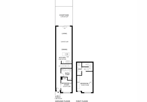 Upon entering, you'll be greeted by soaring ceilings and a fluid, open floor plan that captures the essence of modern living. The main bedroom, situated on the first floor, bathes in natural light and features a handy ensuite. Downstairs, the second bedroom – with its built-in robe – serves dual purposes, doubling as a potential study space. At the heart of this home, a well-appointed kitchen merges seamlessly with the dining and living areas, creating an inviting spot for relaxation.