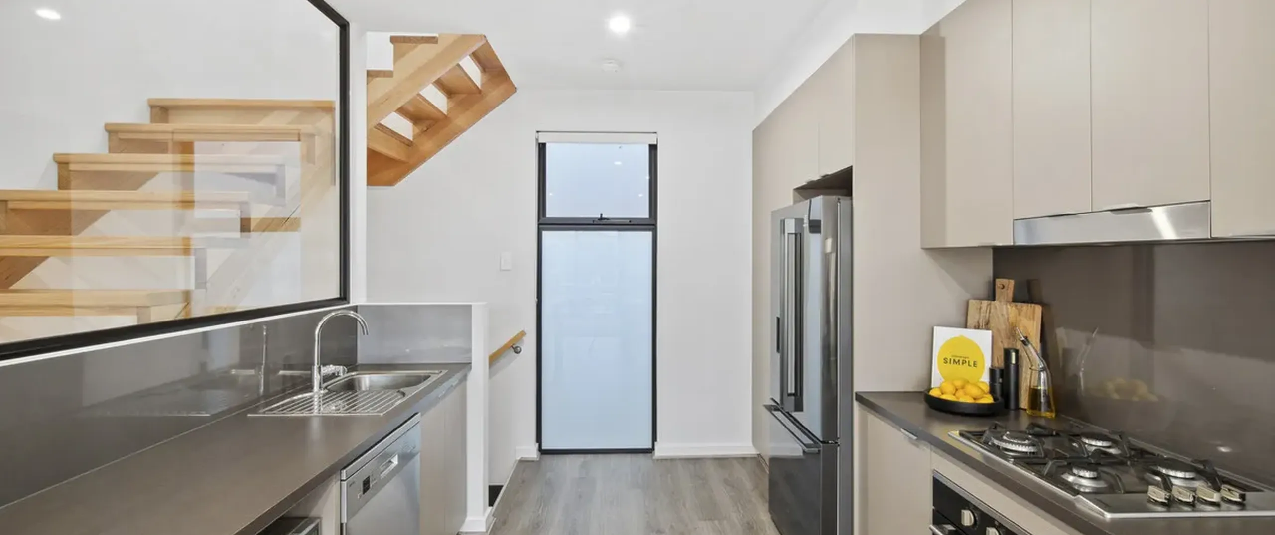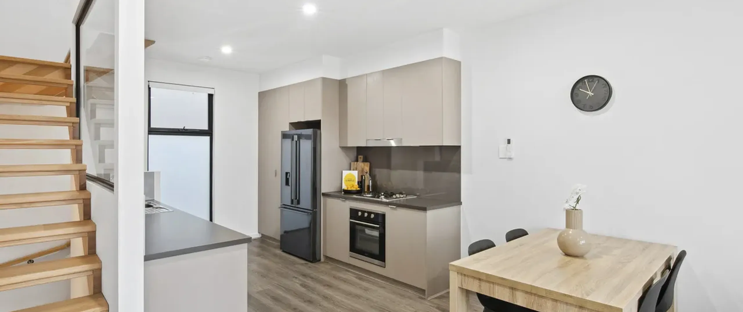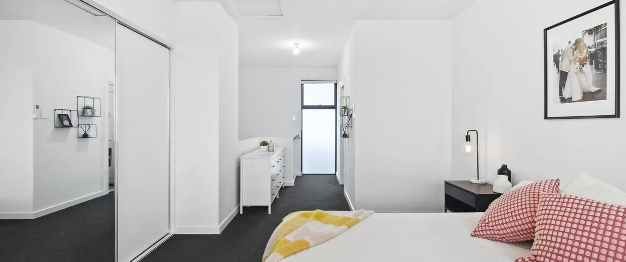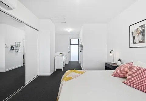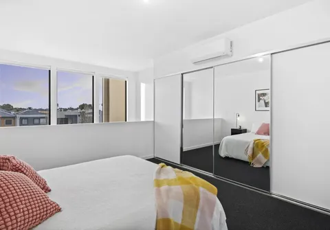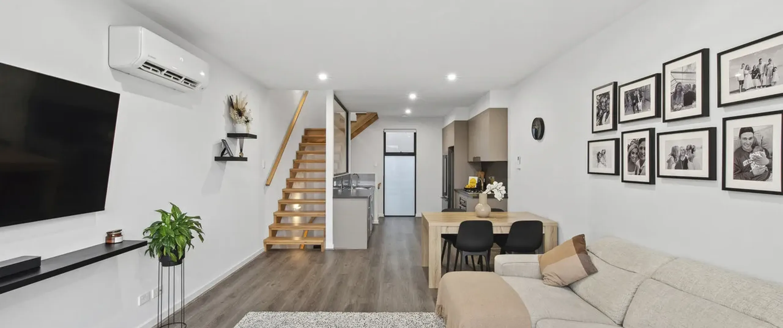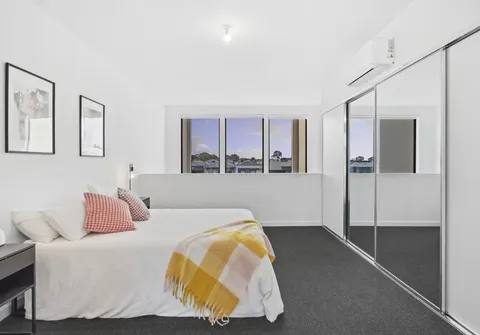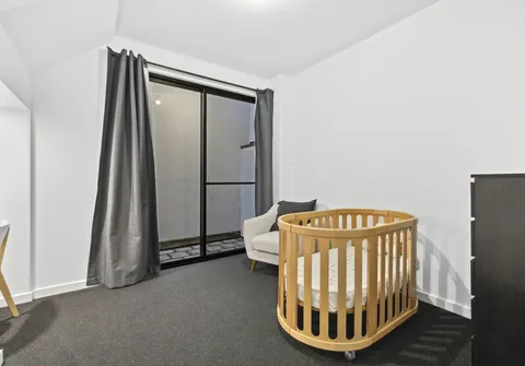 The upper level of this townhouse is highlighted by the master bedroom, which exudes comfort and luxury. This spacious retreat boasts a private ensuite, and abundance of natural light floods the room through a large window and the adjoining void, creating a bright and inviting atmosphere.