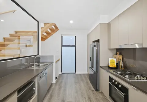 - Modern kitchen featuring ample storage, sweeping benchtop, gas cooktop, dishwasher and contemporary finishes