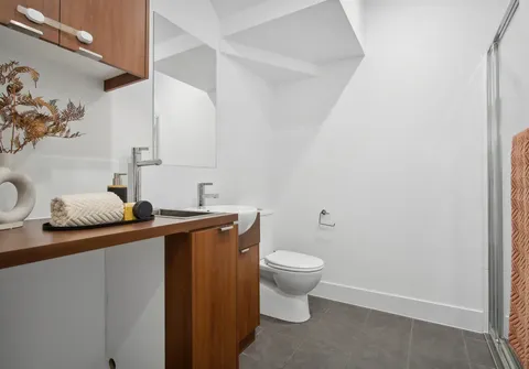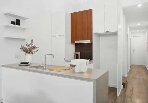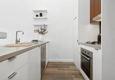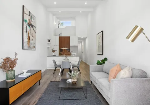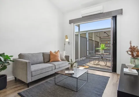 The functional, low-maintenance floorplan boasts a bright, inviting ambiance. Upon entry, modern flooring welcomes you into a light-filled living space with lofty ceilings. At the heart of the home lies a stylish kitchen, ensuring the chef is always part of the action, while the combined living and dining area opens effortlessly onto a peaceful, private outdoor entertaining space. Here, a chic courtyard provides the ideal setting for relaxing in the sun or unwinding in the open air.