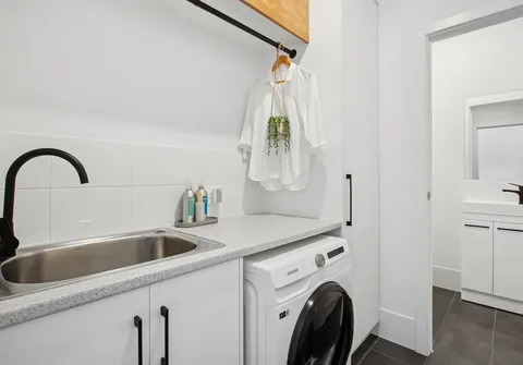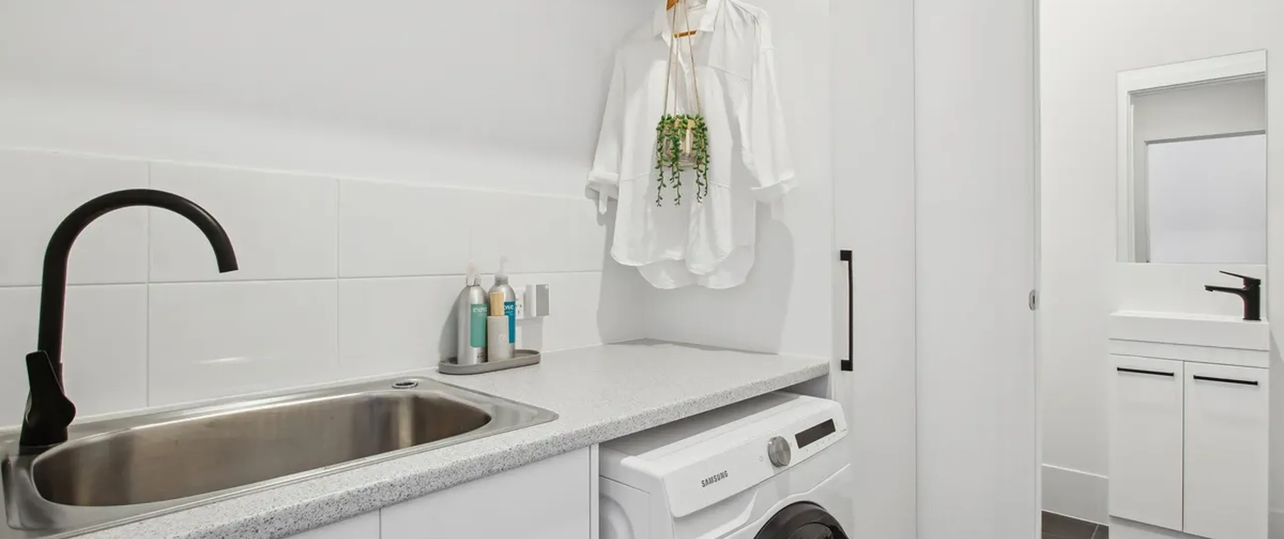 - On-trend laundry with hanging rail and storage with under bench provision for washer