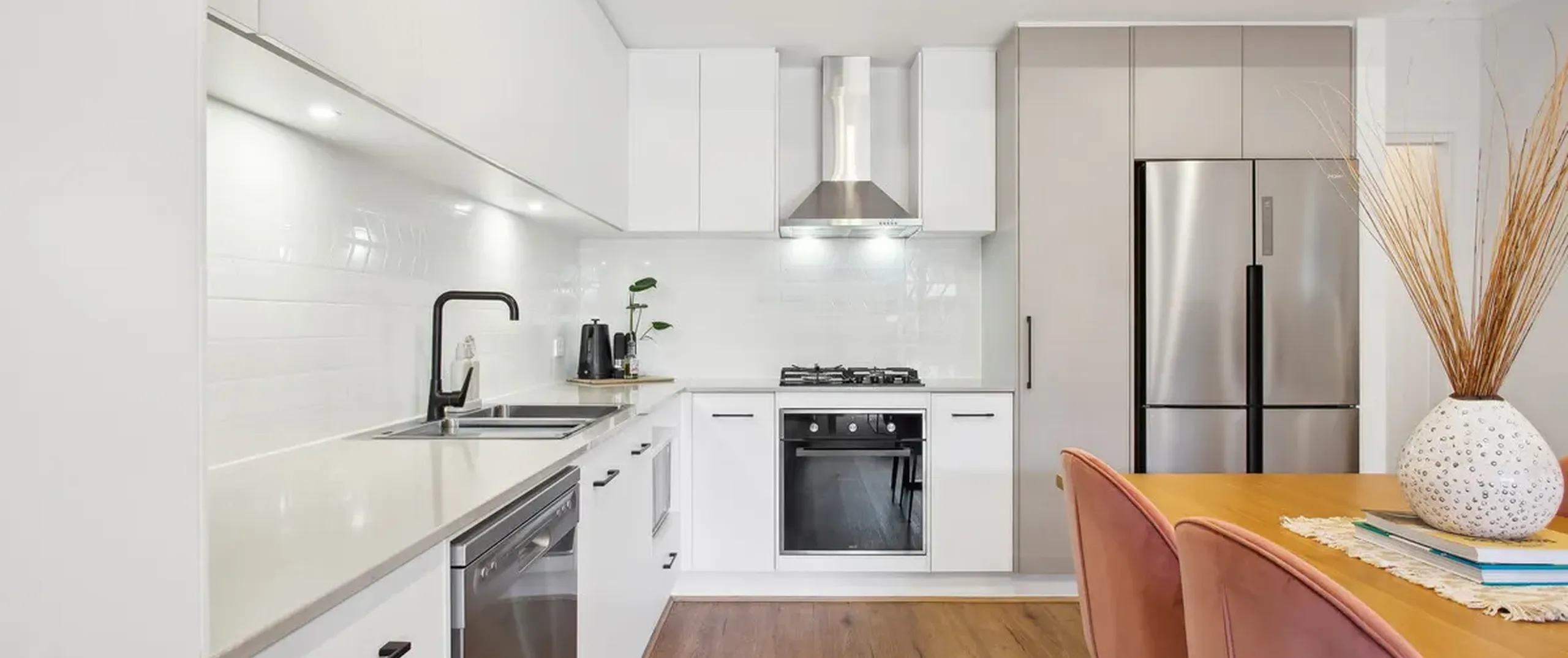 - Stylish kitchen with sweeping stone bench tops, gas cooktop, oven and dishwasher