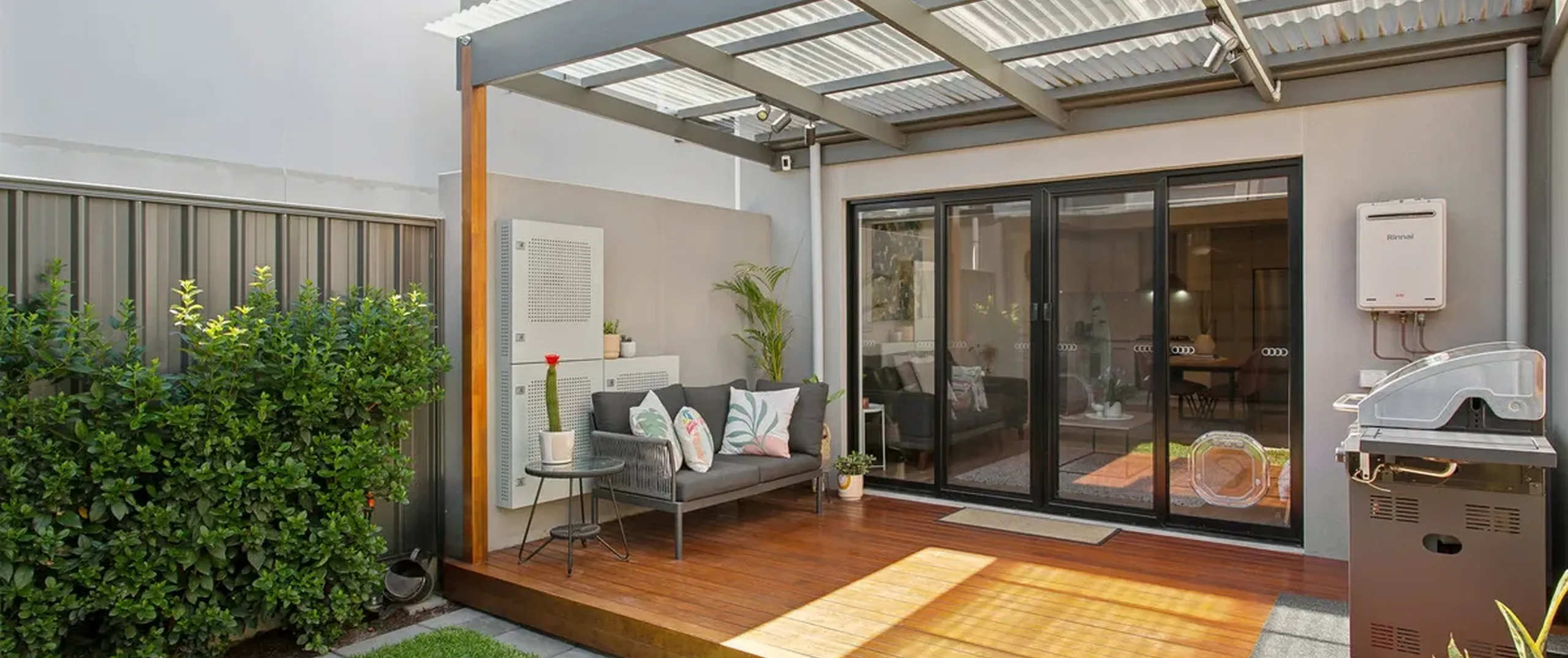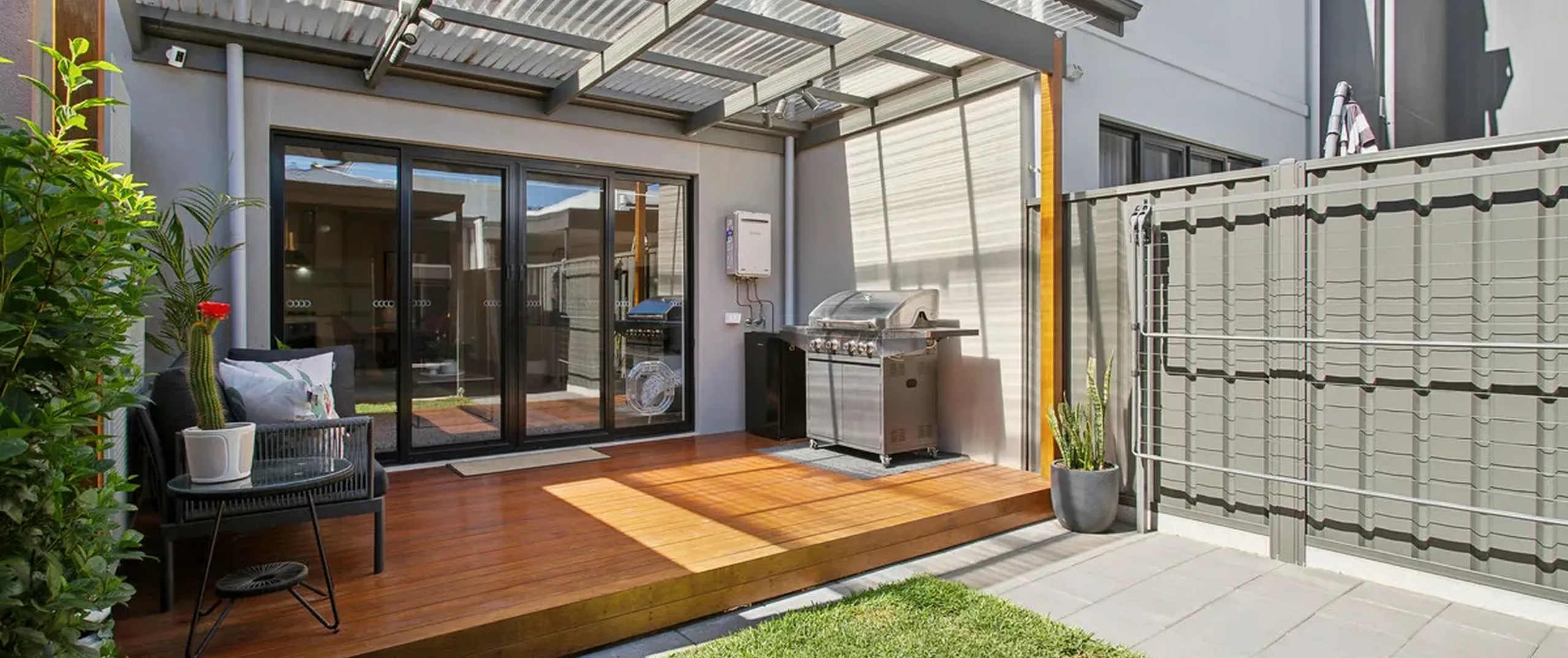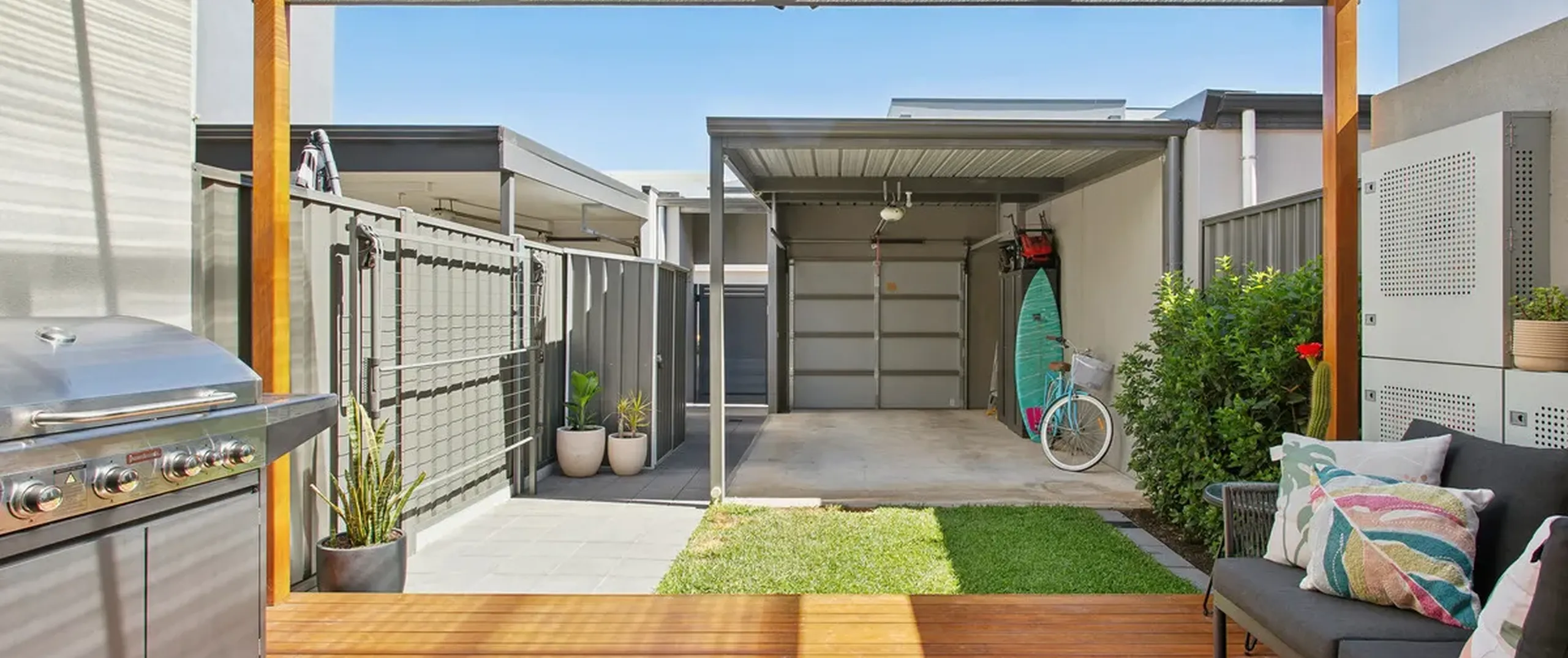 - Low-maintenance courtyard with a decked entertaining area, verandah, and low-maintenance garden with irrigation