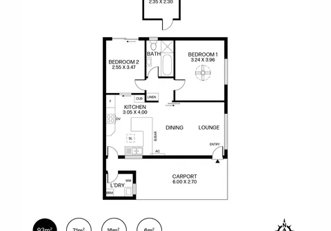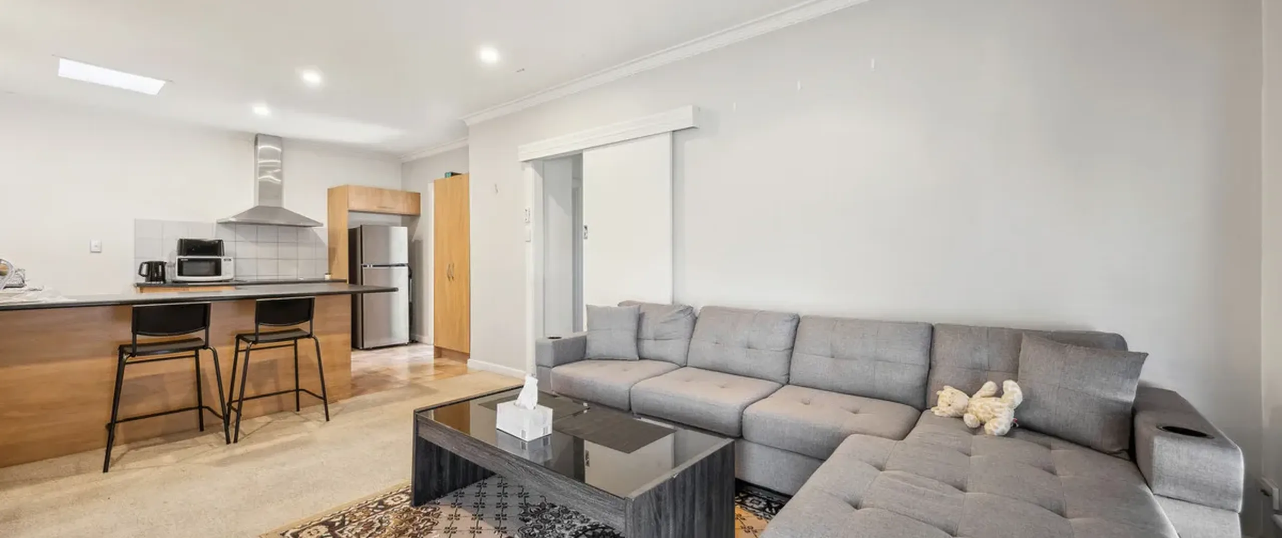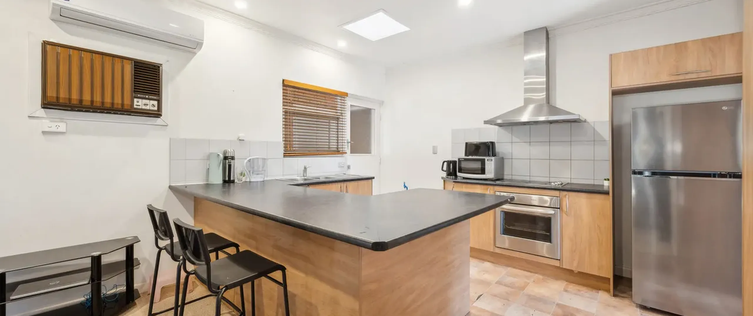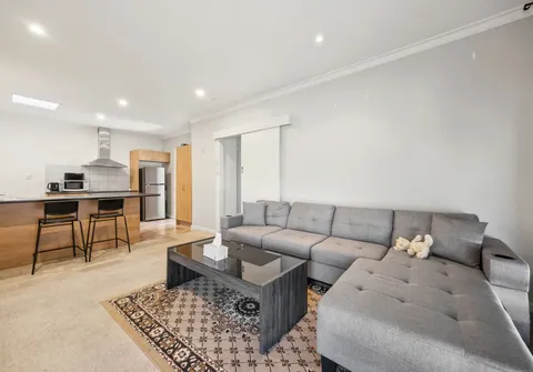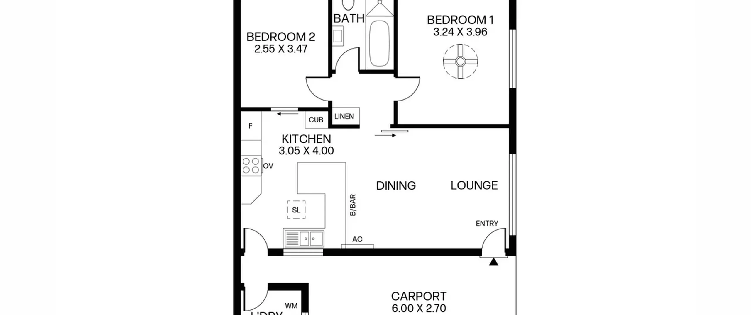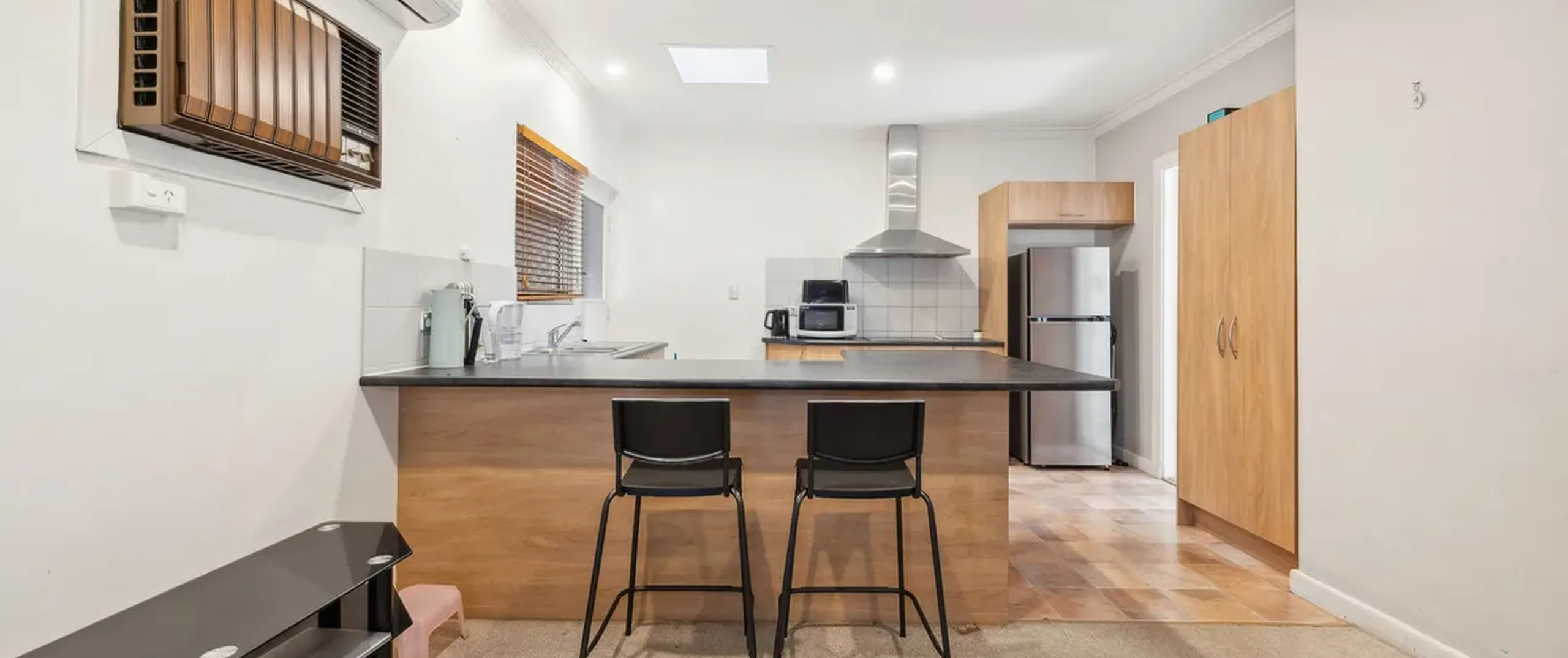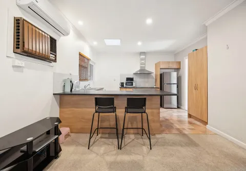 As you step inside, you're greeted by an open plan dining and lounge area with air conditioning, seamlessly flowing into the spacious kitchen. The practical floor plan features two bedrooms, one bathroom, and a separate laundry.