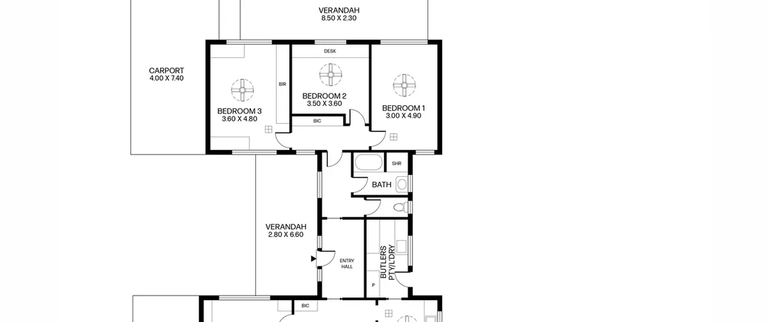 - Three good sized bedrooms, all with ceiling fans; bedroom 2 complete with in-built desk and bedroom 3 with built-in robes + additional storage