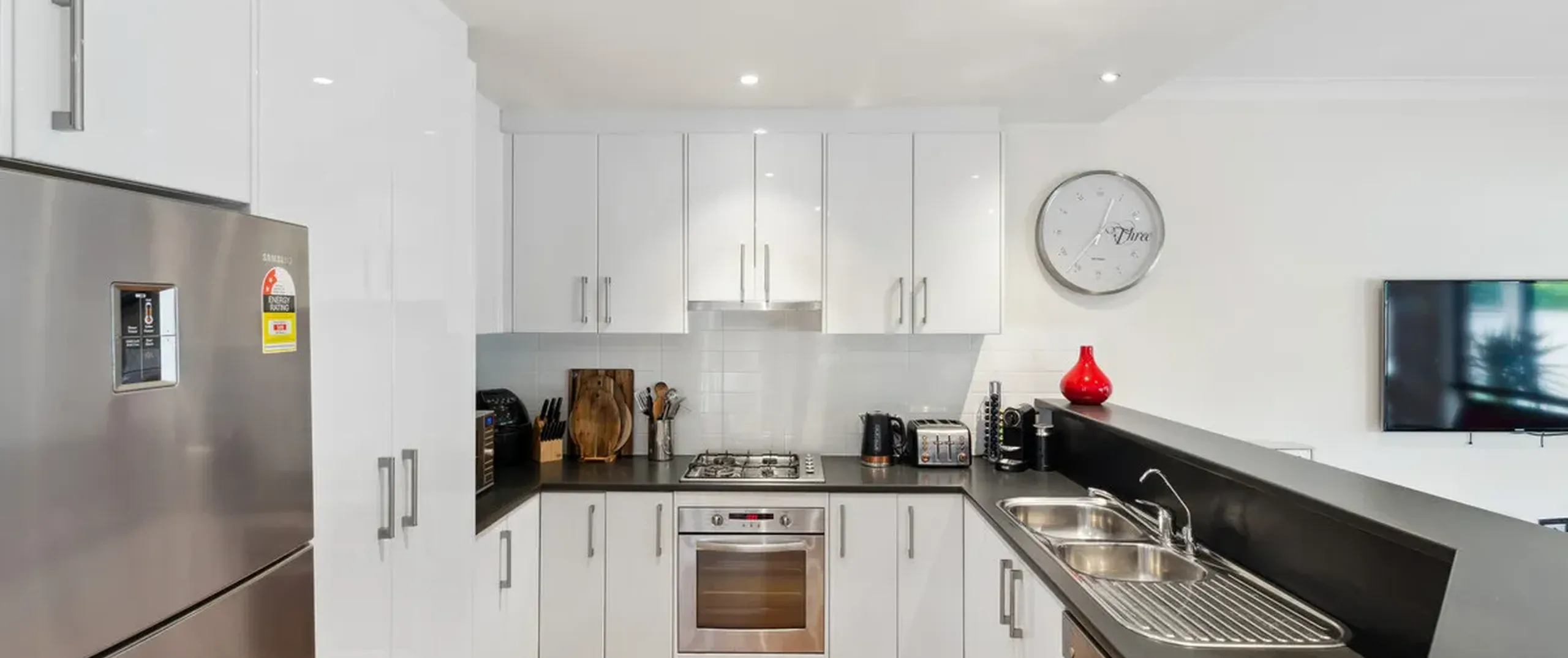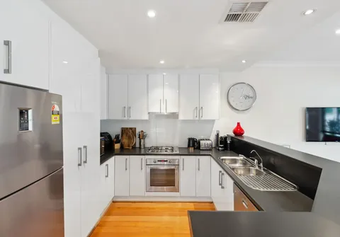 - Modern kitchen with stainless steel oven, gas cooktop and dishwasher complete with abundance of cupboard and bench space