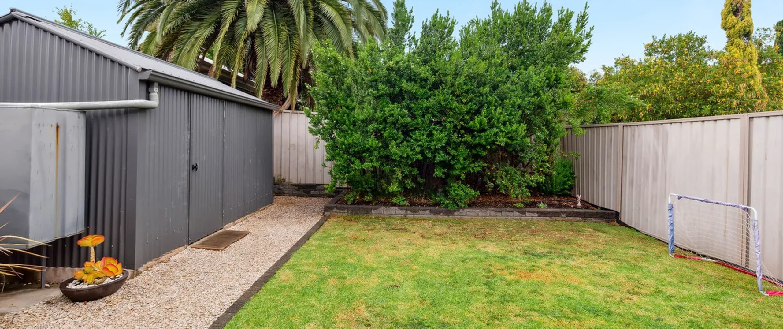 - Low-maintenance backyard with garden shed